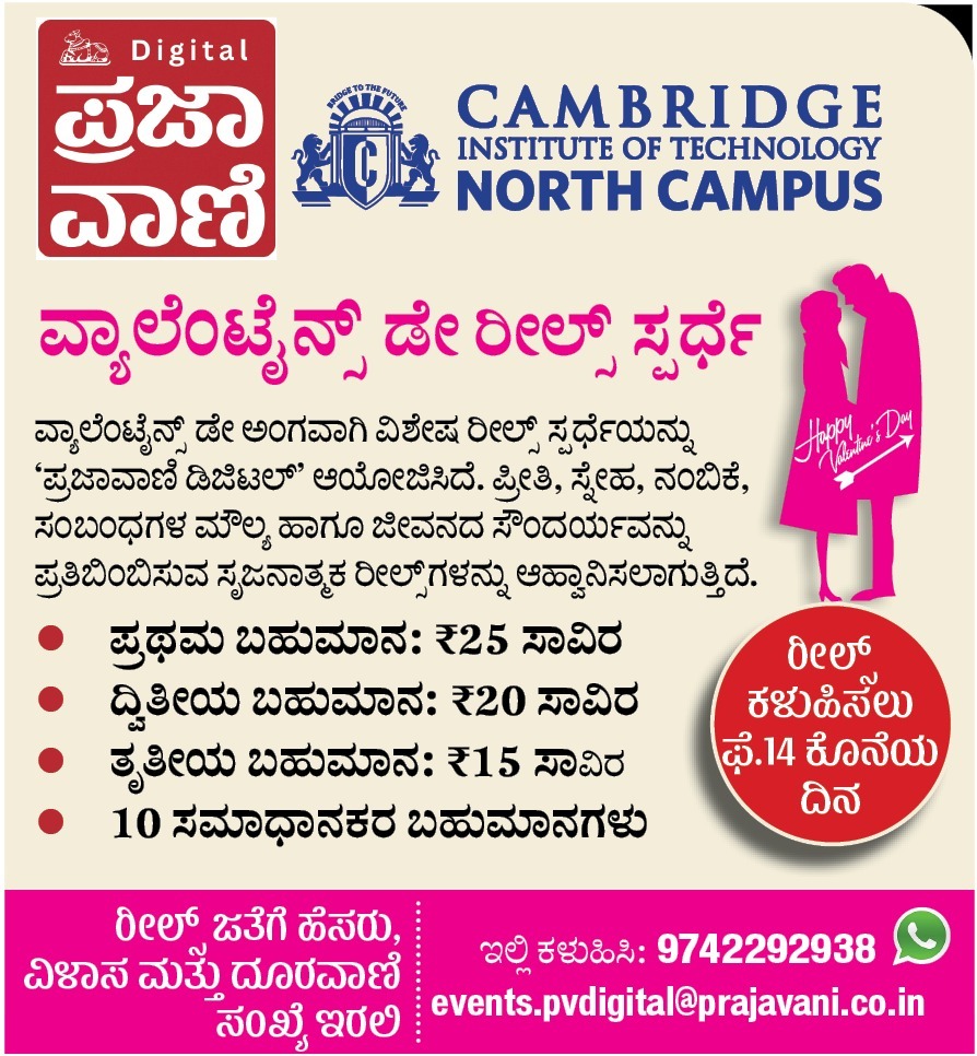 <p>ವ್ಯಾಲೆಂಟೈನ್ಸ್ ಡೇ ಅಂಗವಾಗಿ ಕೇಂಬ್ರಿಡ್ಜ್ ಇನ್ಸ್ಟಿಟ್ಯೂಟ್ ಆಫ್ ಟೆಕ್ನಾಲಜಿ ನಾರ್ಥ್ ಕ್ಯಾಂಪಸ್ ಸಹಯೋಗದೊಂದಿಗೆ ವಿಶೇಷ ರೀಲ್ಸ್ ಸ್ಪರ್ಧೆಯನ್ನು ‘ಪ್ರಜಾವಾಣಿ ಡಿಜಿಟಲ್’ ಆಯೋಜಿಸಿದೆ. ಪ್ರೀತಿ, ಸ್ನೇಹ, ನಂಬಿಕೆ, ಸಂಬಂಧಗಳ ಮೌಲ್ಯ ಹಾಗೂ ಜೀವನದ ಸೌಂದರ್ಯವನ್ನು ಪ್ರತಿಬಿಂಬಿಸುವ ಸೃಜನಾತ್ಮಕ ರೀಲ್ಸ್ಗಳನ್ನು ಆಹ್ವಾನಿಸಲಾಗುತ್ತಿದೆ.</p><p>ಸ್ಪರ್ಧೆಯಲ್ಲಿ ಭಾಗವಹಿಸಲು ಆಸಕ್ತರು ತಮ್ಮ ಮೂಲ ಸೃಜನಾತ್ಮಕ ಮತ್ತು ಕುಟುಂಬ ಸ್ನೇಹಿ ರೀಲ್ಸ್ಗಳನ್ನು ನಿಗದಿತ ಅವಧಿಯೊಳಗೆ ಸಲ್ಲಿಸಬಹುದು. ಅಶ್ಲೀಲತೆ, ಹಿಂಸೆ, ದ್ವೇಷ ಭಾಷೆ, ಹಕ್ಕುಸ್ವಾಮ್ಯ ಉಲ್ಲಂಘನೆ ಅಥವಾ ಇತರರ ವಿಷಯದ ನಕಲು ಇರುವ ರೀಲ್ಸ್ಗಳನ್ನು ಪರಿಗಣಿಸಲಾಗುವುದಿಲ್ಲ.</p><p>ಆಯ್ಕೆಯಾದ ರೀಲ್ಸ್ಗಳನ್ನು ಪ್ರಜಾವಾಣಿ ಡಿಜಿಟಲ್ನ ಸಾಮಾಜಿಕ ಮಾಧ್ಯಮ ವೇದಿಕೆಗಳಲ್ಲಿ ಪ್ರಕಟಿಸಲಾಗುವುದು. ವಿಜೇತರಿಗೆ ವಿಶೇಷ ಗೌರವ/ಪ್ರಶಸ್ತಿಗಳನ್ನು ನೀಡಲಾಗುತ್ತದೆ.</p><ul><li><p>ಪ್ರಥಮ ಬಹುಮಾನ: ₹25 ಸಾವಿರ</p></li><li><p>ದ್ವಿತೀಯ ಬಹುಮಾನ: ₹20 ಸಾವಿರ</p></li><li><p>ತೃತೀಯ ಬಹುಮಾನ: ₹15 ಸಾವಿರ</p><p>ಜತೆಗೆ, 10 ಸಮಾಧಾನಕರ ಬಹುಮಾನಗಳನ್ನು ನೀಡಲಾಗುವುದು</p></li></ul><p>ನಿಮ್ಮ ಪ್ರತಿಭೆಯನ್ನು ಪ್ರದರ್ಶಿಸಿ, ಪ್ರೀತಿಯನ್ನು ಸಂಭ್ರಮಿಸಿ!</p><p><strong>ರೀಲ್ಸ್ಗಳನ್ನು ಕಳುಹಿಸಬೇಕಾದ ಇ–ಮೇಲ್</strong>: <em><a href="https://events.pvdigital@prajavani.co.in/" rel="nofollow">events.pvdigital@prajavani.co.in</a></em></p><p><strong>ವಾಟ್ಸಪ್ ಸಂಖ್ಯೆ:</strong> 9742292938</p><p>ಕಳುಹಿಸುವವರು ತಮ್ಮ ಹೆಸರು, ವಿಳಾಸ ಹಾಗೂ ಸಂಪರ್ಕ ಸಂಖ್ಯೆಯನ್ನು ನಮೂದಿಸಿ.</p><p>ನಿಯಮ ಮತ್ತು ಷರತ್ತುಗಳು ಅನ್ವಯಿಸುತ್ತವೆ</p><p><strong><ins>ನಿಯಮಗಳು</ins></strong></p><ul><li><p>ರೀಲ್ಸ್ ಗರಿಷ್ಠ 1 ನಿಮಿಷ 48 ಸೆಕೆಂಡುಗಳನ್ನು ಮೀರಿರಬಾರದು</p></li><li><p>ರೀಲ್ಸ್ ಕಳುಹಿಸಲು ಕೊನೆಯ ದಿನಾಂಕ ಫೆ. 14, 2026</p></li></ul><p><strong><ins>ಷರತ್ತುಗಳು</ins></strong></p><ul><li><p><strong>ಕುಟುಂಬಸ್ನೇಹಿ ವಿಷಯವಾಗಿರಬೇಕು:</strong> ಎಲ್ಲಾ ವಯೋಮಾನದ ವೀಕ್ಷಕರಿಗೂ ಸೂಕ್ತವಾಗಿರುವಂತಹ ಕುಟುಂಬ ಸ್ನೇಹಿ ವಿಷಯಗಳ ಆಯ್ಕೆ ಇರಲಿ.</p></li><li><p><strong>ಸಾಮಾಜಿಕ ಹಾಗೂ ಸಾಂಸ್ಕೃತಿಕ ಗೌರವ ಕಡ್ಡಾಯ</strong>: ರೀಲ್ಸ್ಗಳು ಸಮಾಜದ ಮೌಲ್ಯಗಳು, ಸಂಸ್ಕೃತಿ ಮತ್ತು ಸಾರ್ವಜನಿಕ ಶಿಷ್ಟಾಚಾರವನ್ನು ಗೌರವಿಸುವಂತಿರಬೇಕು.</p></li><li><p><strong>ರಾಜಕೀಯ ಅಥವಾ ಧಾರ್ಮಿಕ ಪ್ರಚಾರ ಬೇಡ</strong>: ರಾಜಕೀಯ ಸಂದೇಶಗಳು, ಧಾರ್ಮಿಕ ಪ್ರಚಾರ ಅಥವಾ ವಿವಾದಾತ್ಮಕ ವಿಷಯಗಳನ್ನು ಒಳಗೊಂಡ ರೀಲ್ಸ್ಗಳಿಗೆ ಅವಕಾಶವಿಲ್ಲ.</p></li><li><p><strong>ಹಿಂಸೆ ಅಥವಾ ದ್ವೇಷ ಭಾಷೆ ಬೇಡ</strong>: ಯಾವುದೇ ರೀತಿಯ ಹಿಂಸೆ, ದುರುಪಯೋಗ, ದ್ವೇಷ, ಜಾತಿ–ಧರ್ಮ ಆಧಾರಿತ ಅವಮಾನ ಅಥವಾ ಕಿರುಕುಳವನ್ನು ಉತ್ತೇಜಿಸುವ ವಿಷಯಗಳು ಇರಬಾರದು.</p></li><li><p><strong>ಮೂಲ ಸೃಜನಾತ್ಮಕ ವಿಷಯ ಮಾತ್ರ</strong>: ಸ್ಪರ್ಧೆಗೆ ಸಲ್ಲಿಸುವ ರೀಲ್ಸ್ ಸಂಪೂರ್ಣವಾಗಿ ನಿಮ್ಮದೇ ಆದ ಮೂಲ ಸೃಜನಾತ್ಮಕ ವಿಷಯವಾಗಿರಬೇಕು. ಇತರರ ರೀಲ್ಸ್ಗಳ ನಕಲು, ಮರು ಅಪ್ಲೋಡ್ ಅಥವಾ ಅನುಕರಣೆ ಮಾಡಿದ ವಿಷಯಗಳನ್ನು ಪರಿಗಣಿಸಲಾಗುವುದಿಲ್ಲ.</p></li><li><p><strong>ಹಕ್ಕುಸ್ವಾಮ್ಯ ಉಲ್ಲಂಘನೆ ಬೇಡ</strong>: ಬಳಸುವ ಸಂಗೀತ, ದೃಶ್ಯಗಳು ಹಾಗೂ ಇತರೆ ವಿಷಯಗಳು ಹಕ್ಕುಸ್ವಾಮ್ಯ ರಹಿತವಾಗಿರಬೇಕು ಅಥವಾ ಬಳಕೆಗೆ ಸೂಕ್ತ ಅನುಮತಿ ಪಡೆದಿರಬೇಕು.</p></li><li><p><strong>ಅಶ್ಲೀಲತೆ ಮತ್ತು ಅಸಭ್ಯತೆ ನಿಷಿದ್ಧ</strong>: ಅಶ್ಲೀಲ ಪದಗಳು, ಅಸಭ್ಯ ದೃಶ್ಯಗಳು, ಅತಿರೇಕದ ವರ್ತನೆ ಅಥವಾ ಲೈಂಗಿಕ ಸನ್ನೆಗಳನ್ನು ಒಳಗೊಂಡ ರೀಲ್ಸ್ಗಳನ್ನು ಪರಿಗಣಿಸಲಾಗುವುದಿಲ್ಲ.</p></li><li><p><strong>ಪ