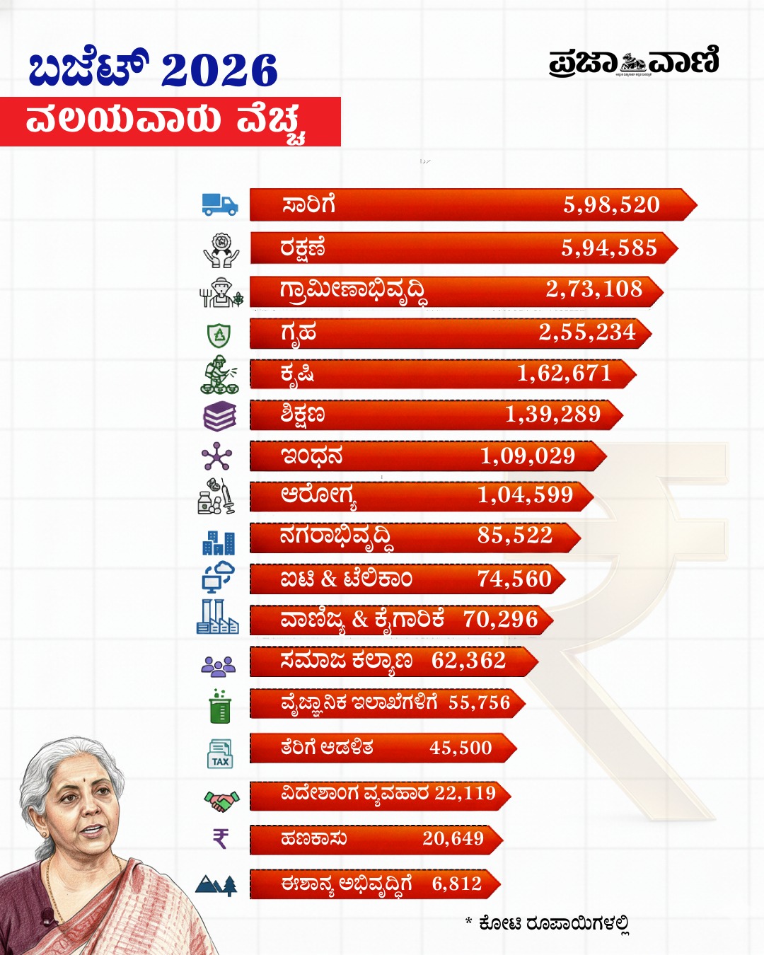 <p><strong>ನವದೆಹಲಿ:</strong> ಕೇಂದ್ರ ಹಣಕಾಸು ಸಚಿವೆ ನಿರ್ಮಲಾ ಸೀತಾರಾಮನ್ ಭಾನುವಾರ (ಫೆ.1) ದಾಖಲೆಯ ಸತತ 9ನೇ ಬಾರಿಗೆ ಕೇಂದ್ರ ಬಜೆಟ್ ಅನ್ನು ಮಂಡಿಸಿದ್ದಾರೆ. ವಿತ್ತ ಸಚಿವೆ ನಿರ್ಮಲಾ ಅವರ ಬಜೆಟ್ ಭಾಷಣದಲ್ಲಿ ಮಾಡಿದ ಪ್ರಮುಖ ಘೋಷಣೆಗಳು ಇಲ್ಲಿವೆ.</p><p>*16ನೇ ಹಣಕಾಸು ಆಯೋಗದ ವರದಿಯ ಮಂಡನೆ, ರಾಜ್ಯಗಳಿಗೆ ₹1.4 ಲಕ್ಷ ಕೋಟಿ ವಿತರಣೆ</p><p>ಕರ್ತವ್ಯ ಭವನದಲ್ಲಿ ಬಜೆಟ್ ಸಿದ್ಧಪಡಿಸಲಾಗಿದ್ದು, ಮೂರು ಕರ್ತವ್ಯಗಳ ಕುರಿತು ಉಲ್ಲೇಖ:</p><p>*ಆರ್ಥಿಕ ಬೆಳವಣಿಗೆ ವೇಗಗೊಳಿಸುವುದು ಹಾಗೂ ಸ್ಥಿರತೆ ಕಾಪಾಡುವುದು</p><p>*ಜನರ ಆಕಾಂಕ್ಷೆಗಳನ್ನು ಈಡೇರಿಸುವುದು</p><p>*ಸಬ್ ಕಾ ಸಾಥ್, ಸಬ್ ಕಾ ವಿಕಾಸ್</p>.Union Budget: ಆದಾಯ ತೆರಿಗೆ ಬದಲಿಲ್ಲ, ತೆರಿಗೆ ವಿಳಂಬಕ್ಕಿನ್ನು ದಂಡ ಮಾತ್ರ.Union Budget 2026: ಆರ್ಥಿಕ ಬೆಳವಣಿಗೆ, ಕುಟುಂಬ ಆದಾಯದ ಹೆಚ್ಚಳವೇ ನಿರ್ಮಲಾ ಆಯವ್ಯಯದ ಸೂತ್ರ .<p><strong>ಬಜೆಟ್ ಅಂದಾಜು:</strong></p>.<h2><strong>*ಪ್ರಮುಖ ಏಳು ವಲಯಗಳಲ್ಲಿ ಉತ್ಪಾದನೆ ಹೆಚ್ಚಳ</strong></h2><p>1. ಬಯೋಫಾರ್ಮಾ ಶಕ್ತಿ (ಭಾರತವನ್ನು ಜಾಗತಿಕ ಬಯೋ-ಫಾರ್ಮಾ ಹಬ್ ಆಗಿ ವೃದ್ಧಿಸುವುದು, ₹10,000 ಕೋಟಿ ಮೀಸಲು)</p><p>2. ಇಂಡಿಯಾ ಸೆಮಿಕಂಡಕ್ಟರ್ ಮಿಷನ್ (ಐಎಸ್ಎಂ) 2.0 (ಕೈಗಾರಿಕಾ ಸಂಶೋಧನೆ ಮೇಲೆ ಗಮನ, ತರಬೇತಿ, ತಂತ್ರಜ್ಞಾನ ಕೇಂದ್ರ, ಕೌಶಲ್ಯ ವೃದ್ಧಿ)</p><p>3. ಎಲೆಕ್ಟ್ರಾನಿಕ್ ಘಟಕಗಳ ಉತ್ಪಾದನಾ ಯೋಜನೆ (₹40,000 ಕೋಟಿ ಮೀಸಲು)</p><p>4. ಜೀವವೈವಿಧ್ಯ ಕಾರಿಡಾರ್ ( ಖನಿಜ ಸಮೃದ್ಧ ಒಡಿಶಾ, ಕೇರಳ, ಆಂಧ್ರ ಪ್ರದೇಶ, ತಮಿಳುನಾಡಿಗೆ ಬೆಂಬಲ. ಗಣಿಗಾರಿಕೆ, ಸಂಸ್ಕರಣೆ, ಸಂಶೋಧನೆಗೆ ಉತ್ತೇಜನ)</p><p>5. 3 ರಾಸಾಯನಿಕ ಪಾರ್ಕ್ ಸ್ಥಾಪಿಸಲು ರಾಜ್ಯಗಳಿಗೆ ನೆರವು</p><p>6. ಬಂಡವಾಳ ಸರಕುಗಳ ಸಾಮರ್ಥ್ಯ ವೃದ್ಧಿ (ಹೈ-ಟೆಕ್ ಟೂಲ್ ರೂಮ್, ಸಿಐಇ, ಕಂಟೈನರ್ ಉತ್ಪಾದನೆ, ₹10,000 ಕೋಟಿ ಅನುದಾನ)</p><p>7. ಜವಳಿ ವಲಯಗಳಿಗೆ ಸಮಗ್ರ ಯೋಜನೆ ಘೋಷಣೆ (ಮೆಗಾ ಜವಳಿ ಪಾರ್ಕ್, ಖಾದಿ, ಕೈಮಗ್ಗ ಉತ್ತೇಜನ ಮಹಾತ್ಮ ಗಾಂಧಿ ಗ್ರಾಮ ಸ್ವರಾಜ್ ಕಾರ್ಯಕ್ರಮ)</p>.Union Budget 2026; ಬಜೆಟ್ ಮುಖ್ಯಾಂಶಗಳು .ಬಜೆಟ್ 2026: ವಿತ್ತ ಸಚಿವೆ ನಿರ್ಮಲಾ ಮಂಡಿಸಿದ ಆಯವ್ಯಯದ ಪ್ರಮುಖ 10 ಅಂಶಗಳು.<p>*ಹಳೆಯ ಕೈಗಾರಿಕಾ ವಲಯಗಳ ಪುನರುಜ್ಜೀವನ - 200ರಷ್ಟು ಕೈಗಾರಿಕಾ ಕ್ಲಸ್ಟರ್ಗಳ ಘೋಷಣೆ. ಉತ್ತೇಜನ. ಮೂಲಸೌಕರ್ಯ, ತಂತ್ರಜ್ಞಾನ ವೃದ್ಧಿ.</p><p>*ಮೈಕ್ರೊ ಉದ್ಯಮಗಳ ಉತ್ತೇಜನಕ್ಕೆ ಚಾಂಪಿಯನ್ ಎಸ್ಎಂಇ ಸ್ಥಾಪನೆ ( ₹10000 ಕೋಟಿ ನಿಧಿ), ಹೆಚ್ಚವರಿಯಾಗಿ ₹2000 ಕೋಟಿ ಸ್ವಾವಲಂಬಿ ಭಾರತ ನಿಧಿ </p><p>*ಮೂಲಸೌಕರ್ಯ ವೃದ್ಧಿ (2026-27ನೇ ಆರ್ಥಿಕ ಸಾಲಿನಲ್ಲಿ ಸಾರ್ವಜನಿಕ ಬಂಡವಾಳ ವೆಚ್ಚ ₹12.2 ಲಕ್ಷ ಕೋಟಿಗೆ ಏರಿಕೆ)</p><p>*ಮೂಲಸೌಕರ್ಯ ಅಪಾಯ ಗ್ಯಾರಂಟಿ ನಿಧಿ ಸ್ಥಾಪನೆ, ಆರ್ಇಐಟಿ ಸ್ಥಾಪನೆ, ಸರಕು ಸಾಗಣೆ ಕಾರಿಡಾರ್</p><p>*20 ಹೊಸ ಜಲ ಮಾರ್ಗಗಳ ಘೋಷಣೆ, ಮುಂದಿನ ಐದು ವರ್ಷಗಳಲ್ಲಿ ಕಾರ್ಯಾಚರಣೆ,</p><p>*ತರಬೇತಿ ಕೇಂದ್ರ ಸ್ಥಾಪನೆ, ಹಡಗು ರಿಪೇರಿ ವ್ಯವಸ್ಥೆ</p><p>*ಕರಾವಳಿ ಕಾರ್ಗೊ ಉತ್ತೇಜನ ಯೋಜನೆ, ಸೀಪ್ಲೇನ್ ವಿಜಿಎಫ್ ಸ್ಕೀಮ್.</p><p>*ದೀರ್ಘಾವಧಿ ಇಂಧನ ಭದ್ರತೆ ಹಾಗೂ ಸ್ಥಿರತೆ ಯೋಜನೆ (ಮುಂದಿನ ಐದು ವರ್ಷಗಳಲ್ಲಿ ₹20,000 ಕೋಟಿ ಮೀಸಲು)</p>.ಬಜೆಟ್ ಅಂಕಿ-ಅಂಶಗಳು: ರೂಪಾಯಿ ಜಮೆ-ವೆಚ್ಚ ಹೇಗೆ?.ಕೇಂದ್ರ ಬಜೆಟ್ 140 ಕೋಟಿ ಭಾರತೀಯರ ಆಕಾಂಕ್ಷೆಗಳ ಪ್ರತಿಬಿಂಬ: ಮೋದಿ ಬಣ್ಣನೆ. <p><strong>ನಗರಗಳ ಅಭಿವೃದ್ಧಿ (5 ವರ್ಷಗಳಲ್ಲಿ ₹5000 ಕೋಟಿ ಅನುದಾನ)</strong></p><p><strong>ಏಳು ಹೈಸ್ಪೀಡ್ ರೈಲು ಕಾರಿಡಾರ್</strong> </p><ul><li><p>ಮುಂಬೈ-ಪುಣೆ,</p></li><li><p>ಪುಣೆ-ಹೈದರಾಬಾದ್,</p></li><li><p>ಹೈದರಾಬಾದ್-ಬೆಂಗಳೂರು