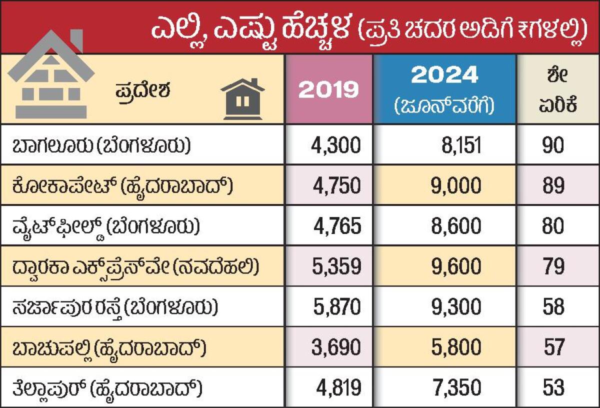 ಬೆಂಗಳೂರಿನಲ್ಲಿ ಒಟ್ಟಾರೆಯಾಗಿ ಮನೆಗಳ ಬೆಲೆ ಕಳೆದ ಜೂನ್ ತ್ರೈಮಾಸಿಕಕ್ಕೆ ಹೋಲಿಸಿದರೆ ಶೇ 28ರಷ್ಟು ಹೆಚ್ಚಳವಾಗಿದೆ ಎಂದು ಕ್ರೆಡಾಯ್ ಕೊಲಿಯರ್ಸ್ ಮತ್ತು ಲಯಾಸಸ್ ಫೊರಸ್ ಜಂಟಿಯಾಗಿ ನಡೆಸಿರುವ ಅಧ್ಯಯನ ವರದಿಯೊಂದು ಹೇಳಿದೆ. 2023ರ ಜೂನ್ ತ್ರೈಮಾಸಿಕದಲ್ಲಿ ಪ್ರತಿ ಚದರ ಅಡಿಗೆ ₹8688 ಇದ್ದರೆ 2024ರ ಜೂನ್ ತ್ರೈಮಾಸಿಕಕ್ಕೆ ₹11161ಕ್ಕೆ ಏರಿಕೆಯಾಗಿದೆ ಎಂದಿದೆ. ದೇಶದ ಎಂಟು ನಗರಗಳಲ್ಲಿ ಮನೆಗಳ ಬೆಲೆ ಸರಾಸರಿ ಶೇ 12ರಷ್ಟು ಹೆಚ್ಚಳವಾಗಿದ್ದು ದೆಹಲಿ–ಎನ್ಸಿಆರ್ ಪ್ರದೇಶದಲ್ಲಿ (ಶೇ 30) ಅತಿಹೆಚ್ಚು ಏರಿಕೆ ಕಂಡುಬಂದಿದೆ. ಇಲ್ಲಿ ಪ್ರತಿ ಚದರ ಅಡಿಗೆ ₹8652ರಿಂದ ₹11279ಕ್ಕೆ ಹೆಚ್ಚಳ ಕಂಡಿದೆ.