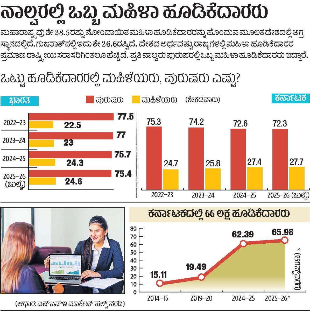 <p>ಮಹಾರಾಷ್ಟ್ರವು ಶೇ 28.5ರಷ್ಟು ನೋಂದಾಯಿತ ಮಹಿಳಾ ಹೂಡಿಕೆದಾರರನ್ನು ಹೊಂದುವ ಮೂಲಕ ದೇಶದಲ್ಲಿ ಅಗ್ರ ಸ್ಥಾನದಲ್ಲಿದೆ. ಗುಜರಾತ್ನಲ್ಲಿ ಇದು ಶೇ 26.6ರಷ್ಟಿದೆ. ದೇಶದ ಅರ್ಧದಷ್ಟು ರಾಜ್ಯಗಳಲ್ಲಿ ಮಹಿಳಾ ಹೂಡಿಕೆದಾರರ ಪ್ರಮಾಣ ರಾಷ್ಟ್ರೀಯ ಸರಾಸರಿಗಿಂತಲೂ ಹೆಚ್ಚಿದೆ. ಪ್ರತಿ ನಾಲ್ವರು ಪುರುಷರಲ್ಲಿ ಒಬ್ಬ ಮಹಿಳಾ ಹೂಡಿಕೆದಾರರು ಇದ್ದಾರೆ.</p>. <p><strong>ಒಟ್ಟು ಹೂಡಿಕೆದಾರರಲ್ಲಿ ಮಹಿಳೆಯರು, ಪುರುಷರು ಎಷ್ಟು? {</strong>ವರ್ಷ;ಪುರುಷರು;ಮಹಿಳೆಯರು (%ಗಳಲ್ಲಿ)}</p><p>2022–23; 77.5; 22.5</p><p>2023–24; 77; 23</p><p>2024–25; 75.7; 24.3</p><p>2025–26 (ಜುಲೈ); 75.4; 24.6</p><p><strong>ಕರ್ನಾಟಕದಲ್ಲಿ ಮಹಿಳಾ ಹೂಡಿಕೆದಾರರು ಎಷ್ಟು? {</strong>ವರ್ಷ;ಪುರುಷರು;ಮಹಿಳೆಯರು (%ಗಳಲ್ಲಿ)}</p><p>2022–23; 75.3; 24.7</p><p>2023–24; 74.2; 25.8</p><p>2024–25; 72.6; 27.4</p><p>2025–26 (ಜುಲೈ);72.3;27.7</p><p><strong>ಎನ್ಎಸ್ಇಯಲ್ಲಿ 66 ಲಕ್ಷ ಕರ್ನಾಟಕದವರು {</strong>ವರ್ಷ;ಹೂಡಿಕೆದಾರರು;% (ಗಳಲ್ಲಿ)}</p><p>2014–15; 11.65 ಲಕ್ಷ; 6.5</p><p>2019–20; 19.49 ಲಕ್ಷ; 6.3</p><p>2024–25; 62.39 ಲಕ್ಷ; 5.5</p><p>2025–26 (ಆಗಸ್ಟ್ವರೆಗೆ); 65.98 ಲಕ್ಷ; 5.55</p><p>(ಆಧಾರ: ಎನ್ಎಸ್ಇ ಮಾರ್ಕೆಟ್ ಪಲ್ಸ್ ವರದಿ)</p>.<div><p><strong>ಪ್ರಜಾವಾಣಿ ಆ್ಯಪ್ ಇಲ್ಲಿದೆ: <a href="https://play.google.com/store/apps/details?id=com.tpml.pv">ಆಂಡ್ರಾಯ್ಡ್ </a>| <a href="https://apps.apple.com/in/app/prajavani-kannada-news-app/id1535764933">ಐಒಎಸ್</a> | <a href="https://whatsapp.com/channel/0029Va94OfB1dAw2Z4q5mK40">ವಾಟ್ಸ್ಆ್ಯಪ್</a>, <a href="https://www.twitter.com/prajavani">ಎಕ್ಸ್</a>, <a href="https://www.fb.com/prajavani.net">ಫೇಸ್ಬುಕ್</a> ಮತ್ತು <a href="https://www.instagram.com/prajavani">ಇನ್ಸ್ಟಾಗ್ರಾಂ</a>ನಲ್ಲಿ ಪ್ರಜಾವಾಣಿ ಫಾಲೋ ಮಾಡಿ.</strong></p></div>