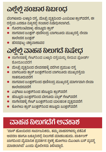 <p><strong>ಬೆಂಗಳೂರು</strong>: ಏರೋ ಇಂಡಿಯಾ ವೈಮಾನಿಕ ಪ್ರದರ್ಶನ ಕಾರ್ಯಕ್ರಮಕ್ಕೆ ಅನುಕೂಲ ಕಲ್ಪಿಸುವುದಕ್ಕಾಗಿ ಫೆಬ್ರುವರಿ 11ರಿಂದ 14ರವರೆಗೆ ಹಲವು ರಸ್ತೆಗಳಲ್ಲಿ ಭಾರಿ ವಾಹನಗಳ ಸಂಚಾರಕ್ಕೆ ನಿರ್ಬಂಧ ವಿಧಿಸಲಾಗಿದೆ.</p>.<p>‘ಪ್ರಧಾನ ಮಂತ್ರಿ, ರಾಷ್ಟ್ರ ಹಾಗೂ ಅಂತರರಾಷ್ಟ್ರೀಯ ಗಣ್ಯರು, ರಕ್ಷಣಾ ಪಡೆಗಳ ಅಧಿಕಾರಿಗಳು ಮತ್ತು ಸಿಬ್ಬಂದಿ, ಸಾರ್ವಜನಿಕರು ಹಾಗೂ ತುರ್ತು ಸೇವಾ ಸಿಬ್ಬಂದಿ ಕಾರ್ಯಕ್ರಮದಲ್ಲಿ ಪಾಲ್ಗೊಳ್ಳಲಿದ್ದಾರೆ. ಇವರೆಲ್ಲರ ಅನುಕೂಲಕ್ಕಾಗಿ ನಿತ್ಯವೂ ಬೆಳಿಗ್ಗೆ 5 ಗಂಟೆಯಿಂದ ರಾತ್ರಿ 10 ಗಂಟೆಯವರೆಗೆ ಕೆಲವು ರಸ್ತೆಗಳಲ್ಲಿ ಭಾರಿ ವಾಹನಗಳ ಸಂಚಾರಕ್ಕೆ ನಿರ್ಬಂಧ ವಿಧಿಸಲಾಗಿದೆ. ವಾಹನ ನಿಲುಗಡೆಯನ್ನೂ ನಿಷೇಧಿಸಲಾಗಿದೆ’ ಎಂದು ಸಂಚಾರ ವಿಭಾಗದ ಪೊಲೀಸರು ತಿಳಿಸಿದ್ದಾರೆ.</p>.<p>‘ನಿರ್ಬಂಧಿತ ರಸ್ತೆಗಳಲ್ಲಿ ಲಾರಿ, ಟ್ರಕ್, ಖಾಸಗಿ ಬಸ್ಗಳು, ಸರಕು ಸಾಗಣೆ ವಾಹನಗಳು ಹಾಗೂ ಟ್ರ್ಯಾಕ್ಟರ್ಗಳು ಸಂಚರಿಸುವಂತಿಲ್ಲ. ನಿಯಮ ಮೀರಿದರೆ, ಪ್ರಕರಣ ದಾಖಲಿಸಲಾಗುವುದು’ ಎಂದು ಹೇಳಿದ್ದಾರೆ.</p>.<div><p><strong>ಪ್ರಜಾವಾಣಿ ಆ್ಯಪ್ ಇಲ್ಲಿದೆ: <a href="https://play.google.com/store/apps/details?id=com.tpml.pv">ಆಂಡ್ರಾಯ್ಡ್ </a>| <a href="https://apps.apple.com/in/app/prajavani-kannada-news-app/id1535764933">ಐಒಎಸ್</a> | <a href="https://whatsapp.com/channel/0029Va94OfB1dAw2Z4q5mK40">ವಾಟ್ಸ್ಆ್ಯಪ್</a>, <a href="https://www.twitter.com/prajavani">ಎಕ್ಸ್</a>, <a href="https://www.fb.com/prajavani.net">ಫೇಸ್ಬುಕ್</a> ಮತ್ತು <a href="https://www.instagram.com/prajavani">ಇನ್ಸ್ಟಾಗ್ರಾಂ</a>ನಲ್ಲಿ ಪ್ರಜಾವಾಣಿ ಫಾಲೋ ಮಾಡಿ.</strong></p></div>