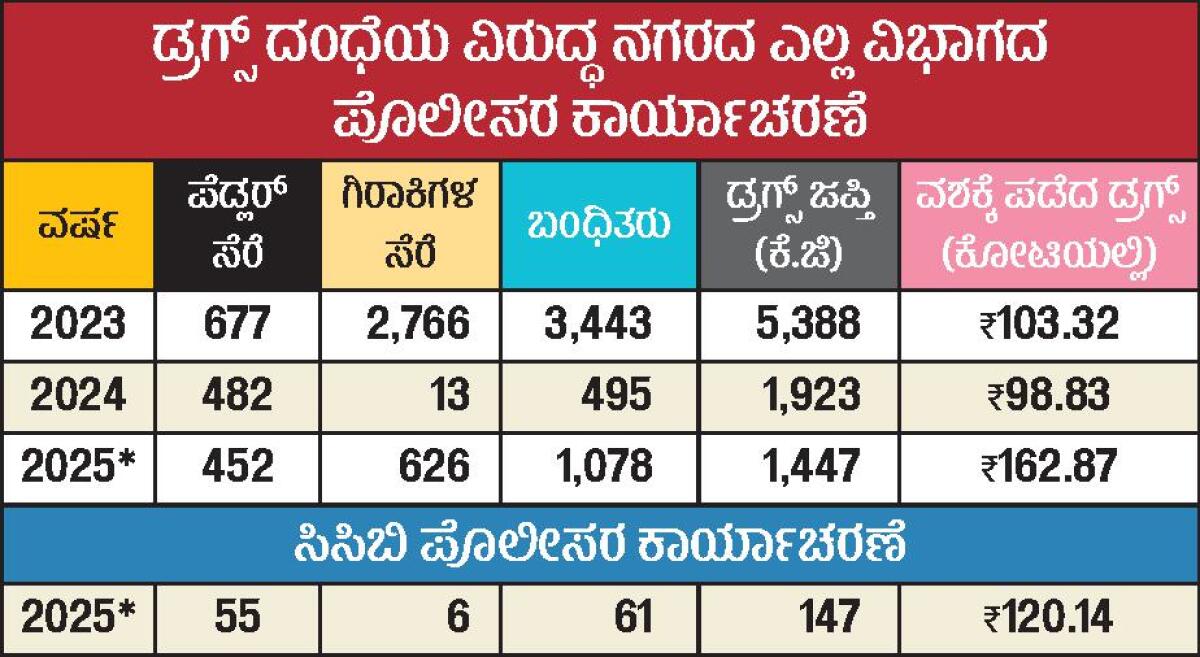 <p><strong>ಬೆಂಗಳೂರು</strong>: ಡ್ರಗ್ಸ್ ಮಾರಾಟ, ಪೂರೈಕೆಯ ವಿರುದ್ಧ ನಗರದ ವಿವಿಧ ಠಾಣೆ ಪೊಲೀಸರು ಹಾಗೂ ಸಿಸಿಬಿ ಘಟಕದ ಸಿಬ್ಬಂದಿ(ಮಾದಕ ದ್ರವ್ಯ ನಿಗ್ರ ದಳ) ನಿರಂತರ ಕಾರ್ಯಾಚರಣೆ ನಡೆಸುತ್ತಿದ್ದರೂ ನಗರದಲ್ಲಿ ಡ್ರಗ್ಸ್ ದಂಧೆಗೆ ಕಡಿವಾಣ ಬಿದ್ದಿಲ್ಲ.</p>.<p>ಮಾದಕ ವಸ್ತುಗಳ ಪೂರೈಕೆಗೆ ಪೆಡ್ಲರ್ಗಳು ಹಲವು ಉಪಾಯ ಕಂಡುಕೊಂಡಿದ್ದಾರೆ. ಪೊಲೀಸರೂ ಅಷ್ಟೇ ವೇಗದಲ್ಲಿ ಡ್ರಗ್ಸ್ ದಂಧೆಕೋರರನ್ನು ಮಟ್ಟಹಾಕಲು ಕಾರ್ಯಾಚರಣೆ ನಡೆಸುತ್ತಿದ್ದಾರೆ. ಕಳೆದೆರಡು ವರ್ಷಕ್ಕೆ ಹೋಲಿಸಿದರೆ, ಈ ವರ್ಷ ಹೆಚ್ಚಿನ ಮೊತ್ತದ ಡ್ರಗ್ಸ್ ವಶಕ್ಕೆ ಪಡೆಯುವಲ್ಲಿ ನಗರದ ಪೊಲೀಸರು ಯಶಸ್ವಿ ಆಗಿದ್ದಾರೆ.</p>.<p>ವರ್ಷಾಂತ್ಯದಲ್ಲಿ ನಡೆಯುವ ಪಾರ್ಟಿಗಳಿಗೆ ನೈಸರ್ಗಿಕ ಹಾಗೂ ಸಿಂಥೆಟಿಕ್ ಡ್ರಗ್ಸ್ ಪೂರೈಕೆ ಆಗುವ ಮಾಹಿತಿ ಸಿಕ್ಕಿದ್ದು, ಒಂದು ತಿಂಗಳಿಂದ ಪೊಲೀಸರ ಕಾರ್ಯಾಚರಣೆ ಚುರುಕು ಪಡೆದುಕೊಂಡಿದೆ.</p>.<p>ಆಂಧ್ರಪ್ರದೇಶ, ತೆಲಂಗಾಣ, ದೆಹಲಿಯಿಂದ ಸಿಂಥೆಟಿಕ್ ಡ್ರಗ್ಸ್ ಬೆಂಗಳೂರಿಗೆ ಪೂರೈಕೆಯಾಗುವ ಮಾಹಿತಿ ಸಿಕ್ಕಿದ್ದು, ಪೆಡ್ಲರ್ಗಳ ಮೇಲೆ ಸಿಸಿಬಿ ಪೊಲೀಸರು ಕಣ್ಣಿಟ್ಟಿದ್ದಾರೆ. ಮಾದಕ ವಸ್ತುಗಳ ಮುಕ್ತ ನಗರ ಮಾಡಲು ಪೊಲೀಸರು ಪಣ ತೊಟ್ಟಿದ್ದಾರೆ.</p>.<p>2023ರಲ್ಲಿ ₹103.32 ಕೋಟಿ ಮೌಲ್ಯದ ಡ್ರಗ್ಸ್ ಹಾಗೂ 2024ರಲ್ಲಿ ₹98.83 ಕೋಟಿ ಮೌಲ್ಯದ ಡ್ರಗ್ಸ್ ಜಪ್ತಿ ಮಾಡಲಾಗಿತ್ತು. ಈ ವರ್ಷ(ಡಿಸೆಂಬರ್ 9ರವರೆಗೆ) ₹162.87 ಕೋಟಿ ಮೌಲ್ಯದ ವಿವಿಧ ಮಾದರಿಯ ಮಾದಕ ವಸ್ತುಗಳನ್ನು ನಗರ ಪೊಲೀಸರು ವಶಕ್ಕೆ ಪಡೆದುಕೊಳ್ಳುವಲ್ಲಿ ಯಶಸ್ವಿ ಆಗಿದ್ದಾರೆ. ಆ ಪೈಕಿ ಸಿಸಿಬಿ ಪೊಲೀಸರೇ ₹120 ಕೋಟಿ ಮೌಲ್ಯದ ಡ್ರಗ್ಸ್ ಜಪ್ತಿ ಮಾಡಿ ಪೆಡ್ಲರ್ಗಳಿಗೆ ಬಿಸಿ ಮುಟ್ಟಿಸಿದ್ದಾರೆ.</p>.<p><strong>ಪಾರ್ಟಿಗಳ ಮೇಲೆ ನಿಗಾ:</strong> <br>ಹೊಸ ವರ್ಷದ ಸಂದರ್ಭದಲ್ಲಿ ಬೆಂಗಳೂರಿನಲ್ಲಿ ನಡೆಯುವ ಪಾರ್ಟಿಗಳಿಗೆ ಪೂರೈಸಲು ಸಂಗ್ರಹಿಸಿಕೊಂಡಿದ್ದ ₹37 ಕೋಟಿ ಮೌಲ್ಯದ ವಿವಿಧ ಮಾದರಿಯ ಡ್ರಗ್ಸ್ ಅನ್ನು ಕಳೆದ 15 ದಿನಗಳಲ್ಲಿ ಸಿಸಿಬಿಯ ಸಿಬ್ಬಂದಿ ಜಪ್ತಿ ಮಾಡಿದ್ದಾರೆ. 10 ಮಂದಿ ಪೆಡ್ಲರ್ಗಳನ್ನು ಬಂಧಿಸುವಲ್ಲಿ ಯಶಸ್ವಿ ಆಗಿದ್ದಾರೆ. ವರ್ಷಾಂತ್ಯದಲ್ಲಿ ನಗರದಲ್ಲಿ ಇರುವ ಪಬ್, ಹೊರವಲದಲ್ಲಿರುವ ಹೋಮ್ ಸ್ಟೇಗಳು, ಸ್ಟಾರ್ ಹೋಟೆಲ್ಗಳ ಆವರಣದಲ್ಲಿ ವಿಶೇಷ ಪಾರ್ಟಿಗಳನ್ನು ಆಯೋಜಿಸಲು ಸಿದ್ಧತೆ ನಡೆದಿದೆ. ಈ ಪಾರ್ಟಿಗಳಿಗೆ ಡ್ರಗ್ಸ್ ಪೂರೈಸಲು ದಾಸ್ತಾನು ಮಾಡಿಕೊಂಡಿದ್ದ ಕೇಂದ್ರಗಳ ಮೇಲೂ ದಾಳಿ ನಡೆಸಲಾಗುತ್ತಿದೆ ಎಂದು ಅಧಿಕಾರಿಯೊಬ್ಬರು ತಿಳಿಸಿದರು.</p>.<p>ಕೆ.ಜಿ.ನಗರ ಪೊಲೀಸ್ ಠಾಣಾ ವ್ಯಾಪ್ತಿಯಲ್ಲಿ ವಿದೇಶಿ ಅಂಚೆ ಕಚೇರಿಯಿದ್ದು, ಅಲ್ಲಿಗೆ ಥಾಯ್ಲೆಂಡ್ನಿಂದ ಬಂದಿದ್ದ ಪಾರ್ಸಲ್ಗಳಲ್ಲಿ ಹೈಡ್ರೊಗಾಂಜಾ ಇರುವುದನ್ನು ಪೊಲೀಸರು ಪತ್ತೆಹಚ್ಚಿದ್ದಾರೆ.</p>.<p>‘ಪೆಡ್ಲರ್ಗಳು ಹೊಸ ಹೊಸ ಸಂಚು ರೂಪಿಸಿಕೊಂಡು ಮಾದಕ ವಸ್ತುಗಳನ್ನು ಸಾಗಣೆ ಮಾಡುತ್ತಿದ್ದಾರೆ. ಚಾಕೊಲೇಟ್, ಕಾಫಿ–ಟೀ ಪುಡಿ, ಗಿಫ್ಟ್ ಬಾಕ್ಸ್, ಆಹಾರ ಪದಾರ್ಥಗಳ ಪೊಟ್ಟಣಗಳಲ್ಲಿ ಡ್ರಗ್ಸ್ ಬಚ್ಚಿಟ್ಟು ಸಾಗಣೆ ಮಾಡುತ್ತಿರುವುದು ಕಂಡುಬಂದಿದೆ. 18ರಿಂದ 35 ವರ್ಷದ ಒಳಗಿನವರನ್ನೇ ಗುರಿಯಾಗಿಸಿ ಮಾರಾಟ ಮಾಡುತ್ತಿರುವುದು ಪತ್ತೆಯಾಗಿದೆ’ ಎಂದು ಅಧಿಕಾರಿಯೊಬ್ಬರು ಹೇಳಿದರು.</p>.<ul><li><p>ನಿಯಂತ್ರಣಕ್ಕೆ ಪೊಲೀಸರ ಕ್ರಮ </p></li><li><p>ಜೈಲಿನಿಂದ ಬಿಡುಗಡೆಯಾದ ಆರೋಪಿಗಳ ಮೇಲೆ ನಿರಂತರ ಮೇಲ್ವಿಚಾರಣೆ</p></li><li><p> ಮಾದಕ ದ್ರವ್ಯ ಮಾರಾಟದಲ್ಲಿ ಭಾಗಿಯಾಗಿರುವ ವಿದೇಶಿ ಪ್ರಜೆಗಳ 