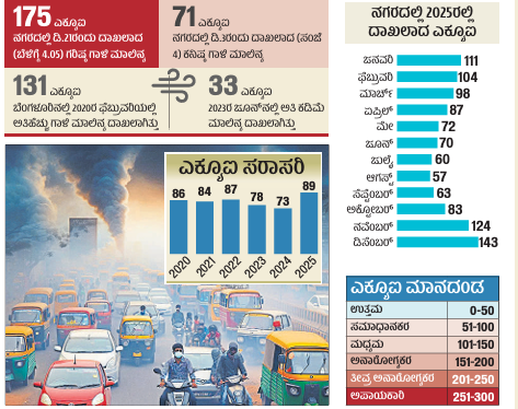 <p><strong>ಬೆಂಗಳೂರು</strong>: ನಗರದಲ್ಲಿ 2025ರಲ್ಲಿ ಗಾಳಿ ಗುಣಮಟ್ಟ ಐದು ವರ್ಷ ಹಿಂದಿನ ವಾಯುಗುಣಮಟ್ಟ ಸೂಚ್ಯಂಕವನ್ನು (ಎಕ್ಯೂಐ) ಮೀರಿದ್ದು, ಕಳೆದ ವರ್ಷಕ್ಕೆ ಹೋಲಿಸಿದರೆ ಶೇ 22ರಷ್ಟು ಗಾಳಿ ಗುಣಮಟ್ಟ ಕುಸಿದಿದೆ.</p><p>ಬೆಂಗಳೂರಿನಲ್ಲಿ ಒಂದು ದಿನ ಸಾಮಾನ್ಯವಾಗಿ ಉಸಿರಾಡಿದರೂ ಅದು ಮೂರು ಸಿಗರೇಟ್ ಸೇದುವುದಕ್ಕೆ ಸಮನಾಗಿರುವಷ್ಟು ಗಾಳಿ ಗುಣಮಟ್ಟ ಹಾಳಾಗಿದೆ. 2020ರ ಫೆಬ್ರುವರಿಯಲ್ಲಿ ನಗರದಲ್ಲಿ ಎಕ್ಯೂಐ ಸರಾಸರಿ 131 ದಾಖಲಾಗಿತ್ತು. ಈ ವರ್ಷದ ಡಿಸೆಂಬರ್ 27ರ ವೇಳೆಗೆ ಎಕ್ಯೂಐ ಸರಾಸರಿ 143 ಆಗಿದೆ. ಡಿಸೆಂಬರ್ 21ರಂದು 175 ಎಕ್ಯೂಐ ದಾಖಲಾಗಿತ್ತು.</p><p>2025ರ ಅಕ್ಟೋಬರ್ ನಂತರ ನಗರದ ಗಾಳಿಯಲ್ಲಿ ಮಾಲಿನ್ಯ ಪ್ರಮಾಣ ಹೆಚ್ಚಾಗುತ್ತಿದ್ದು, ಡಿಸೆಂಬರ್ 5ರ ನಂತರ, ದಿನದ ಸರಾಸರಿ ಐಕ್ಯೂಐ 149ಕ್ಕಿಂತ ಹೆಚ್ಚೇ ಇದೆ. 2025ರಲ್ಲಿ ಎರಡನೇ ಬಾರಿಗೆ ಒಂದು<br>ದಿನದ ಸರಾಸರಿ ಎಕ್ಯೂಐ (166) ಡಿ.15ರಂದು ದಾಖಲಾಗಿದ್ದು, ನವೆಂಬರ್ 28ರಂದು ಕೂಡ 167 ಎಕ್ಯೂಐ ದಾಖಲಾಗಿತ್ತು. ಅಕ್ಟೋಬರ್ 1ರಿಂದ ಡಿಸೆಂಬರ್ 15ರವರೆಗಿನ ಅವಧಿಯಲ್ಲಿ ನವೆಂಬರ್ 22ರಂದು ಮಾತ್ರ ಅತಿಕಡಿಮೆ ಎಕ್ಯೂಐ (52) ದಾಖಲಾಗಿತ್ತು.</p><p>2025ರ 361 ದಿನಗಳಲ್ಲಿ (ಡಿಸೆಂಬರ್ 27ರವರೆಗೆ) ಎರಡು ದಿನಗಳು ಮಾತ್ರ ಗಾಳಿ ಗುಣಮಟ್ಟ ಉತ್ತಮ ಮಟ್ಟದಲ್ಲಿತ್ತು. 253 ದಿನಗಳಲ್ಲಿ ಸಮಾಧಾನಕರ, 81 ದಿನಗಳಲ್ಲಿ ಮಧ್ಯಮ ಮತ್ತು 24 ದಿನ ಗಾಳಿ ಗುಣಮಟ್ಟದ ಸೂಚ್ಯಂಕ ಅನಾರೋಗ್ಯಕರ ಮಟ್ಟದಲ್ಲಿತ್ತು. ಕಳೆದ ಐದು ವರ್ಷಗಳಿಗೆ ಹೋಲಿಸಿದರೆ 2025ರಲ್ಲಿ ಗಾಳಿ ಅತಿಹೆಚ್ಚು ಮಾಲಿನ್ಯಗೊಂಡಿದೆ ಎಂದು ಮಾಪನ ಕೇಂದ್ರಗಳ ದತ್ತಾಂಶ ತಿಳಿಸಿದೆ.</p>.<p><strong>ಎಕ್ಯೂಐ ಸರಾಸರಿ</strong></p><p>ವರ್ಷ; ಎಕ್ಯೂಐ</p><p>2020; 86</p><p>2021; 84</p><p>2022; 87</p><p>2023; 78</p><p>2024; 73</p><p>2025; 89</p> <p>131 ಎಕ್ಯೂಐ: ಬೆಂಗಳೂರಿನಲ್ಲಿ 2020ರ ಫೆಬ್ರುವರಿಯಲ್ಲಿ ಅತಿಹೆಚ್ಚು ಗಾಳಿ ಮಾಲಿನ್ಯ ದಾಖಲಾಗಿತ್ತು</p><p>33 ಎಕ್ಯೂಐ: 2023ರ ಜೂನ್ನಲ್ಲಿ ಅತಿ ಕಡಿಮೆ ಮಾಲಿನ್ಯ ದಾಖಲಾಗಿತ್ತು</p><p>71 ಎಕ್ಯೂಐ; ನಗರದಲ್ಲಿ ಡಿ.3ರಂದು ದಾಖಲಾದ (ಸಂಜೆ 4) ಕನಿಷ್ಠ ಗಾಳಿ ಮಾಲಿನ್ಯ</p><p>175 ಎಕ್ಯೂಐ; ನಗರದಲ್ಲಿ ಡಿ.21ರಂದು ದಾಖಲಾದ (ಬೆಳಿಗ್ಗೆ 4.05) ಗರಿಷ್ಠ ಗಾಳಿ ಮಾಲಿನ್ಯ</p><p>====</p> <p><strong>0-50 ಎಕ್ಯೂಐ: ಉತ್ತಮ</strong></p><p>51–100 ಎಕ್ಯೂಐ: ಸಮಾಧಾನಕರ</p><p>101–150 ಎಕ್ಯೂಐ: ಮಧ್ಯಮ</p><p>151–200 ಎಕ್ಯೂಐ: ಅನಾರೋಗ್ಯಕರ</p><p>201-250 ಎಕ್ಯೂಐ: ತೀವ್ರ ಅನಾರೋಗ್ಯಕರ</p><p>251–300 ಎಕ್ಯೂಐ: ಅಪಾಯಕಾರಿ</p>.<p><strong>ನಗರದಲ್ಲಿ 2025ರಲ್ಲಿ ದಾಖಲಾದ ಎಕ್ಯೂಐ</strong></p><p>ತಿಂಗಳು; ಎಕ್ಯೂಐ</p><p>ಜನವರಿ; 111</p><p>ಫೆಬ್ರುವರಿ; 104</p><p>ಮಾರ್ಚ್; 98</p><p>ಏಪ್ರಿಲ್; 87</p><p>ಮೇ; 72</p><p>ಜೂನ್; 70</p><p>ಜುಲೈ; 60</p><p>ಆಗಸ್ಟ್; 57</p><p>ಸೆಪ್ಟೆಂಬರ್; 63</p><p>ಅಕ್ಟೋಬರ್; 83</p><p>ನವೆಂಬರ್;124</p><p>ಡಿಸೆಂಬರ್; 143</p>.<div><p><strong>ಪ್ರಜಾವಾಣಿ ಆ್ಯಪ್ ಇಲ್ಲಿದೆ: <a href="https://play.google.com/store/apps/details?id=com.tpml.pv">ಆಂಡ್ರಾಯ್ಡ್ </a>| <a href="https://apps.apple.com/in/app/prajavani-kannada-news-app/id1535764933">ಐಒಎಸ್</a> | <a href="https://whatsapp.com/channel/0029Va94OfB1dAw2Z4q5mK40">ವಾಟ್ಸ್ಆ್ಯಪ್</a>, <a href="https://www.twitter.com/prajavani">ಎಕ್ಸ್</a>, <a href="https://www.fb.com/prajavani.net">ಫೇಸ್ಬುಕ್</a> ಮತ್ತು <a href="https://www.instagram.com/prajavani">ಇನ್ಸ್ಟಾಗ್ರಾಂ</a>ನಲ್ಲಿ ಪ್ರಜಾವಾಣಿ ಫಾಲೋ ಮಾಡಿ.</strong></p></div>