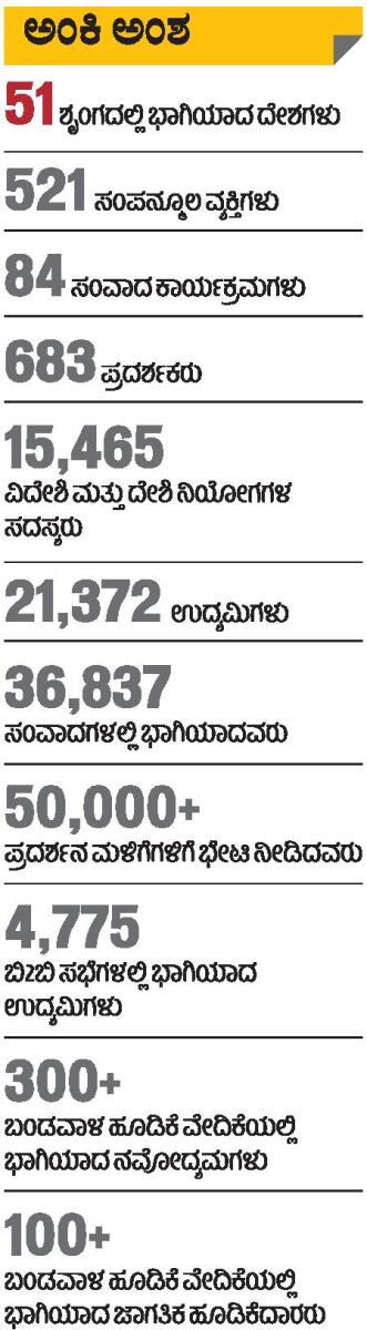 ‘ಬೆಂಗಳೂರಿಗೆ ಮಹತ್ವದ ಸ್ಥಾನ’ ‘ಟೆಕ್ ಉದ್ಯಮಗಳು ನವೋದ್ಯಮಗಳಿಗೆ ವೇದಿಕೆ ಕಲ್ಪಿಸಿದ್ದಷ್ಟೇ ಅಲ್ಲ. ಜಾಗತಿಕ ತಂತ್ರಜ್ಞಾನ ಕ್ಷೇತ್ರದಲ್ಲಿ ಬೆಂಗಳೂರು ಮತ್ತು ಕರ್ನಾಟಕವನ್ನು ಒಂದು ಮಹತ್ವದ ಸ್ಥಾನದಲ್ಲಿ ನಿಲ್ಲಿಸುವ ಗುರಿ ಸಾಧನೆಗೆ ಈ ಶೃಂಗ ನೆರವಾಗಲಿದೆ. ಇವಿಷ್ಟೇ ಅಲ್ಲದೆ ಸುಸ್ಥಿರ ಅಭಿವೃದ್ಧಿ ಗುರಿಗಳನ್ನೂ ಶೃಂಗದಲ್ಲಿ ಅನುಸರಿಸಲಾಗಿದೆ. ಇಲ್ಲಿ ಉತ್ಪಾದನೆಯಾದ ಕಸದಲ್ಲಿ ಶೇ 98ರಷ್ಟನ್ನು ಮರುಬಳಕೆ ಮಾಡಲಾಗಿದೆ. ಶೃಂಗಕ್ಕಾಗಿ ಬಳಕೆಯಾದ ವಾಹನಗಳಲ್ಲಿ ಶೇ 28ರಷ್ಟು ವಿದ್ಯುತ್ ಚಾಲಿತ ವಾಹನಗಳಾಗಿದ್ದವು’ಪ್ರಿಯಾಂಕ್ ಖರ್ಗೆ ಮಾಹಿತಿ ಮತ್ತು ಜೈವಿಕ ತಂತ್ರಜ್ಞಾನ ಸಚಿವ