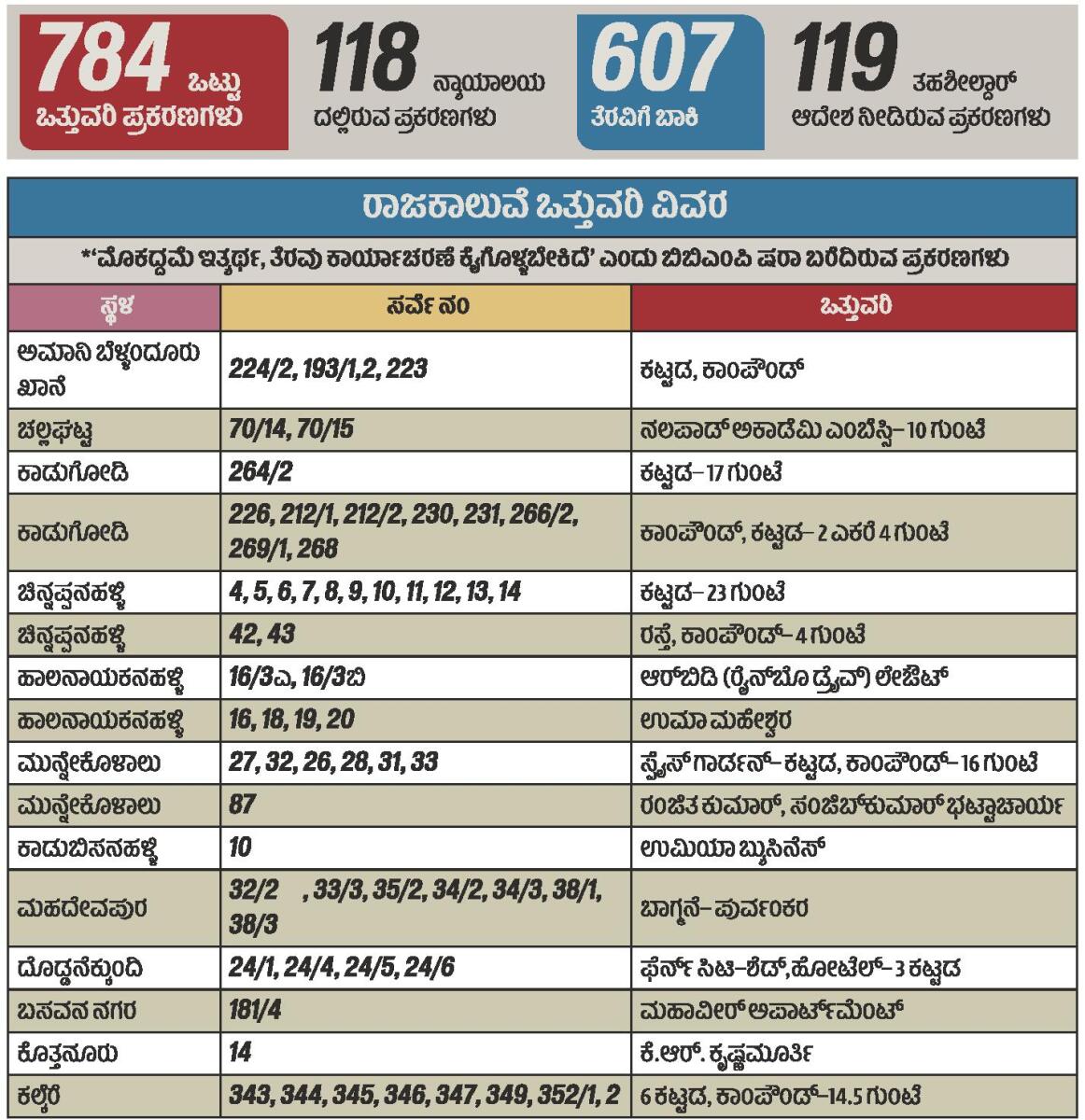 <p><strong>ಬೆಂಗಳೂರು</strong>: ರಾಜಕಾಲುವೆ ಒತ್ತುವರಿ ಮಾಡಿರುವ ಪ್ರತಿಷ್ಠಿತರ ಕಟ್ಟಡ ಗಳನ್ನು ತೆರವುಗೊಳಿಸಲು ನ್ಯಾಯಾಲಯ ದಲ್ಲಿದ್ದ ಪ್ರಕರಣಗಳು ಬಗೆಹರಿ ದಿದ್ದರೂ, ಕಾರ್ಯಾಚರಣೆಗೆ ಬಿಬಿಎಂಪಿ ಮೀನಮೇಷ ಎಣಿಸುತ್ತಿದೆ. </p><p>ಕಳೆದ ವರ್ಷ ಭಾರಿ ಮಳೆಗೆ ‘ಮುಳುಗಿದ ಬೆಂಗಳೂರು ಪೂರ್ವ’ ಎಂದು ಕಳಂಕ ಕ್ಕೀಡಾಗಿದ್ದ ಮಹದೇವಪುರ ವಲಯದಲ್ಲಿ ನಲಪಾಡ್, ಬಾಗ್ಮನೆ– ಪುರ್ವಂಕರ, ರೈನ್ಬೊ ಡ್ರೈವ್ ಲೇಔಟ್ ಮುಂತಾದ ಪ್ರತಿಷ್ಠಿತ ಬಡಾವಣೆಗಳಲ್ಲಿ ರಾಜ ಕಾಲುವೆಗಳನ್ನು ಒತ್ತುವರಿ ಮಾಡಿಕೊಳ್ಳ ಲಾಗಿದೆ ಎಂದು ಆರೋಪಿಸ ಲಾಗಿತ್ತು. ಈ ಮೊದಲು ತೆರವಿಗೆ ಮುಂದಾದಾಗ ನ್ಯಾಯಾಲಯದಿಂದ ತಡೆಯಾಜ್ಞೆ ತರಲಾಗಿತ್ತು. ಇದೀಗ ತಡೆಯಾಜ್ಞೆ ತೆರವಾಗಿದ್ದರೂ ಬಿಬಿಎಂಪಿ ಅಧಿಕಾರಿಗಳು ತೆರವಿಗೆ ಮುಂದಾಗುತ್ತಿಲ್ಲ.</p><p>ಬಿಬಿಎಂಪಿ ಮಾಹಿತಿ ಪ್ರಕಾರ, 2016ರಲ್ಲಿ ರಾಜಕಾಲುವೆಯ 2,951 ಒತ್ತುವರಿ ಪ್ರಕರಣ ಗಳಿದ್ದವು. ಕಾಲಕಾಲಕ್ಕೆ ತೆರವುಗೊಳಿಸಿ ಆ ಸಂಖ್ಯೆ ಇದೀಗ 784ಕ್ಕೆ ಬಂದಿದೆ. ನ್ಯಾಯಾ ಲಯದಲ್ಲಿರುವ ಪ್ರಕರಣಗಳು, ಬಿಬಿಎಂಪಿಯೇ ಒತ್ತುವರಿ ಮಾಡಿ ಕೊಂಡಿರುವ ಸ್ಥಳಗಳು, ಕಾಲುವೆ ಮಾರ್ಗ ಬದಲಾದ ಪ್ರದೇಶಗಳನ್ನು ಹೊರತುಪಡಿಸಿದರೆ 607 ಪ್ರಕರಣ ಗಳಲ್ಲಿ ಈಗ ಒತ್ತುವರಿಯಾಗಿದೆ. ಇದರಲ್ಲಿ 119 ಸ್ಥಳಗಳಲ್ಲಿ ತೆರವಿಗೆ ತಹಶೀಲ್ದಾರ್ ಕೂಡ ಆದೇಶ ನೀಡಿದ್ದಾರೆ.</p><p>ಚಲ್ಲಘಟ್ಟದಲ್ಲಿ ನಲಪಾಡ್ ಅಕಾಡೆಮಿ ಎಂಬೆಸ್ಸಿ ಒತ್ತುವರಿಗೆ ಸಂಬಂಧಿಸಿದಂತೆ, ನ್ಯಾಯಾಲಯ ದಲ್ಲಿ ಪ್ರಕರಣ ಇತ್ಯರ್ಥವಾಗಿದೆ. ಜತೆಗೆ ಸರ್ವೆ ನಡೆಸಿದ ತಹಶೀಲ್ದಾರ್ ಅವರಿಂದ ನೋಟಿಸ್ ಜಾರಿ ಹಾಗೂ ತೆರವಿಗೆ ಆದೇಶವಾಗಿದ್ದರೂ ಕಾರ್ಯಾಚರಣೆ ಮಾತ್ರ ನಡೆದಿಲ್ಲ. ಇದೇ ರೀತಿ, ಹಾಲನಾಯಕಹಳ್ಳಿಯಲ್ಲಿ ಆರ್ಬಿಡಿ (ರೈನ್ಬೊ ಡ್ರೈವ್) ಲೇಔಟ್, ಜುನ್ನಸಂದ್ರ, ಮುನ್ನೇಕೊಳಾಲು, ದೊಡ್ಡನೆಕ್ಕುಂದಿಯಲ್ಲಿ ಫೆರ್ನ್ ಸಿಟಿ, ಕಾಡುಬಿಸನಹಳ್ಳಿ ಯಲ್ಲಿ ಉಮಿಯಾ ಬ್ಯುಸಿನೆಸ್ಗಳ ಒತ್ತುವರಿ ತೆರವಿನ ಆದೇಶ ಅಧಿಕಾರಿಗಳ ಕೈಯಲ್ಲೇ ಇದ್ದರೂ ಕಾರ್ಯಾಚರಣೆ ಕೈಗೊಳ್ಳಲು ಸಿಬ್ಬಂದಿಗೆ ಸೂಚನೆ ನೀಡಿಲ್ಲ.</p><p>ಇಂತಹ ನೂರಕ್ಕೂ ಹೆಚ್ಚು ಪ್ರಕರಣಗಳಲ್ಲಿ, ‘ಮೊಕದ್ದಮೆ ಇತ್ಯರ್ಥ, ತೆರವು ಕಾರ್ಯಾಚರಣೆ ಕೈಗೊಳ್ಳಬೇಕಿದೆ’ ಎಂದು ಬಿಬಿಎಂಪಿ ದಾಖಲೆಯಲ್ಲಿ ಷರಾ ಬರೆಯಲಾಗಿದೆ. ಹಲವು ಪ್ರಕರಣಗ ಳಲ್ಲಿ ತೆರವಿಗೆ ತಹಶೀಲ್ದಾರ್ ಆದೇಶವಿದೆ. ಇನ್ನುಳಿದ್ದಕ್ಕೆ, ಆದೇಶ ನೀಡಲು ತಹ ಶೀಲ್ದಾರ್ಗಳು ಸಾಕಷ್ಟು ವಿಳಂಬ ನೀತಿ ಅನುಸರಿಸುತ್ತಿದ್ದಾರೆ ಎಂದು ಬಿಬಿಎಂಪಿ ಅಧಿಕಾರಿಗಳೇ ದೂರುತ್ತಾರೆ.</p><p><strong>ಎಲ್ಲವೂ ತೆರವು...</strong></p><p>‘ರಾಜಕಾಲುವೆ ಒತ್ತುವರಿ ತೆರವು ಕಾರ್ಯಾಚರಣೆ ಪ್ರತಿದಿನವೂ ನಡೆಯುತ್ತಿದೆ. ಯಾವ ಒತ್ತುವರಿಯನ್ನೂ ಬಿಡುವುದಿಲ್ಲ. ಒಂದು ದಿನ ದೊಡ್ಡ ಕಟ್ಟಡ ತೆರವಾದಾಗ ಎಲ್ಲರಿಗೂ ಗೊತ್ತಾಗುತ್ತದೆ. ಕೆಲವು ಬಾರಿ ಕಾಂಪೌಂಡ್, ಶೆಡ್ ತೆರವಾದಾಗ ದೊಡ್ಡ ಸುದ್ದಿ ಆಗುವುದಿಲ್ಲ ಅಷ್ಟೇ’ ಎಂದು ಬಿಬಿಎಂಪಿ ಮುಖ್ಯ ಆಯುಕ್ತ ತುಷಾರ್ ಗಿರಿನಾಥ್ ತಿಳಿಸಿದರು.</p>.<div><p><strong>ಪ್ರಜಾವಾಣಿ ಆ್ಯಪ್ ಇಲ್ಲಿದೆ: <a href="https://play.google.com/store/apps/details?id=com.tpml.pv">ಆಂಡ್ರಾಯ್ಡ್ </a>| <a href="https://apps.apple.com/in/app/prajavani-kannada-news-app/id1535764933">ಐಒಎಸ್</a> | <a href="https://whatsapp.com/channel/0029Va94OfB1dAw2Z4q5mK40">ವಾಟ್ಸ್ಆ್ಯಪ್</a>, <a href="https://www.twitter.com/prajavani">ಎಕ್ಸ್</a>, <a href="https://www.fb.com/prajavani.net">ಫೇಸ್ಬುಕ್</a> ಮತ್ತು <a href="https://www.instagram.com/prajavani">ಇನ್ಸ್ಟಾಗ್ರಾಂ</a>ನಲ್ಲಿ ಪ್ರಜಾವಾಣಿ ಫಾಲೋ ಮಾಡಿ.</strong></p></div>