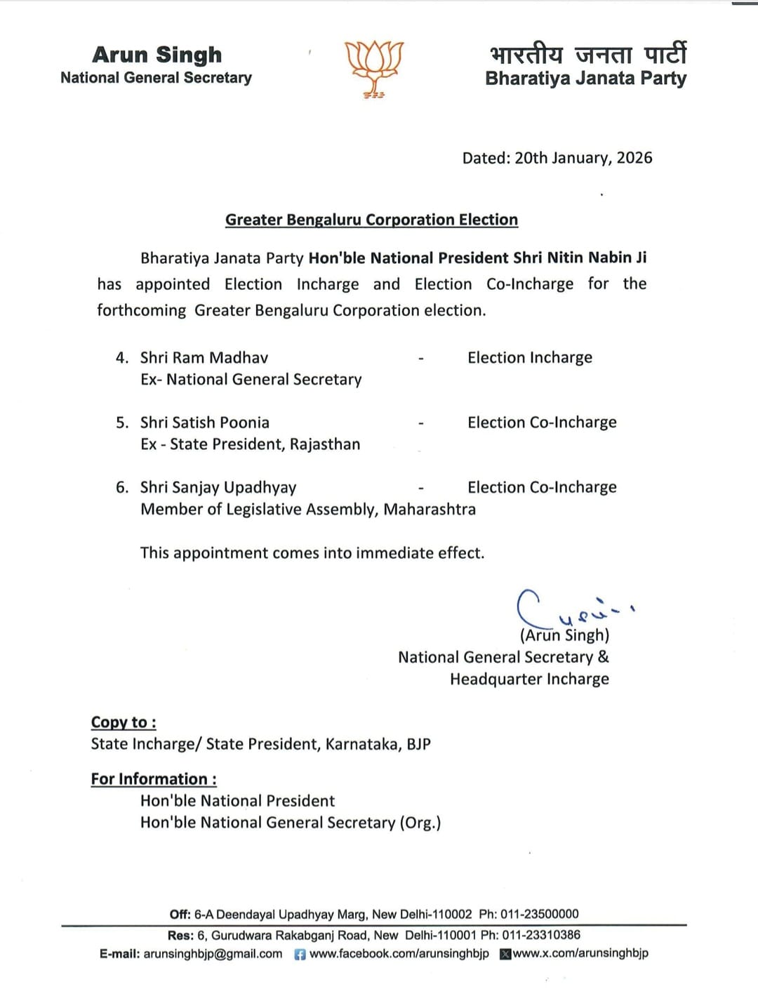 <p><strong>ಬೆಂಗಳೂರು:</strong> ಬಹುನಿರೀಕ್ಷಿತ ಗ್ರೇಟರ್ ಬೆಂಗಳೂರು ಪ್ರಾಧಿಕಾರ (ಜಿಬಿಎ) ಚುನಾವಣೆಯನ್ನು ಗಂಭೀರವಾಗಿ ಪರಿಗಣಿಸಿರುವ ಬಿಜೆಪಿ ಚುನಾವಣಾ ಉಸ್ತುವಾರಿಗಳನ್ನು ನೇಮಕ ಮಾಡಿದೆ.</p><p>ಈ ಬಗ್ಗೆ ಬಿಜೆಪಿ ರಾಷ್ಟ್ರೀಯ ಪ್ರಧಾನ ಕಾರ್ಯದರ್ಶಿ ಅರುಣ್ ಸಿಂಗ್ ಆದೇಶ ಹೊರಡಿಸಿದ್ದಾರೆ.</p>.<p>ಬಿಜೆಪಿ ಹಿರಿಯ ನಾಯಕ ಹಾಗೂ ಮಾಜಿ ರಾಷ್ಟ್ರೀಯ ಪ್ರಧಾನ ಕಾರ್ಯದರ್ಶಿ ರಾಮ್ ಮಾಧವ್ ಅವರನ್ನು ಚುನಾವಣಾ ಉಸ್ತುವಾರಿಯನ್ನಾಗಿ ನೇಮಕ ಮಾಡಲಾಗಿದೆ. </p><p>ಸಹ-ಉಸ್ತುವಾರಿಗಳಾಗಿ ರಾಜಸ್ಥಾನ ಬಿಜೆಪಿಯ ಸತೀಶ್ ಪೂನಿಯಾ ಹಾಗೂ ಮಹಾರಾಷ್ಟ್ರದ ಬಿಜೆಪಿ ಶಾಸಕ ಸಂಜಯ್ ಉಪಾಧ್ಯಾಯ ಅವರನ್ನು ನೇಮಕ ಮಾಡಲಾಗಿದೆ.</p><p>ಬಿಜೆಪಿ ಚುನಾವಣಾ ಕಾರ್ಯತಂತ್ರಗಳಲ್ಲಿ ಪ್ರಮುಖ ಪಾತ್ರವಹಿಸುತ್ತಿರುವ ರಾಮ್ ಮಾಧವ್ ಅವರು ಕಳೆದ ಜಮ್ಮು ಮತ್ತು ಕಾಶ್ಮೀರ ಚುನಾವಣೆಯಲ್ಲಿ ಪ್ರಮುಖ ಪಾತ್ರವಹಿಸಿದ್ದರು. 2018ರ ರಾಜ್ಯ ವಿಧಾನಸಭಾ ಚುನಾವಣೆಯಲ್ಲೂ ರಾಮ್ ಮಾಧವ್ ಚುನಾವಣೆ ಉಸ್ತುವಾರಿಯಾಗಿ ಕೆಲಸ ಮಾಡಿದ್ದರು.</p>.ಜಿಬಿಎ ಚುನಾವಣೆಗೆ ತರಾತುರಿ ಏಕೆ?.ಜಿಬಿಎ ವ್ಯಾಪ್ತಿಯ ಐದು ನಗರ ಪಾಲಿಕೆಗಳ ಚುನಾವಣೆ: ಇವಿಎಂ ಬದಲು ಮತಪತ್ರ.<div><p><strong>ಪ್ರಜಾವಾಣಿ ಆ್ಯಪ್ ಇಲ್ಲಿದೆ: <a href="https://play.google.com/store/apps/details?id=com.tpml.pv">ಆಂಡ್ರಾಯ್ಡ್ </a>| <a href="https://apps.apple.com/in/app/prajavani-kannada-news-app/id1535764933">ಐಒಎಸ್</a> | <a href="https://whatsapp.com/channel/0029Va94OfB1dAw2Z4q5mK40">ವಾಟ್ಸ್ಆ್ಯಪ್</a>, <a href="https://www.twitter.com/prajavani">ಎಕ್ಸ್</a>, <a href="https://www.fb.com/prajavani.net">ಫೇಸ್ಬುಕ್</a> ಮತ್ತು <a href="https://www.instagram.com/prajavani">ಇನ್ಸ್ಟಾಗ್ರಾಂ</a>ನಲ್ಲಿ ಪ್ರಜಾವಾಣಿ ಫಾಲೋ ಮಾಡಿ.</strong></p></div>