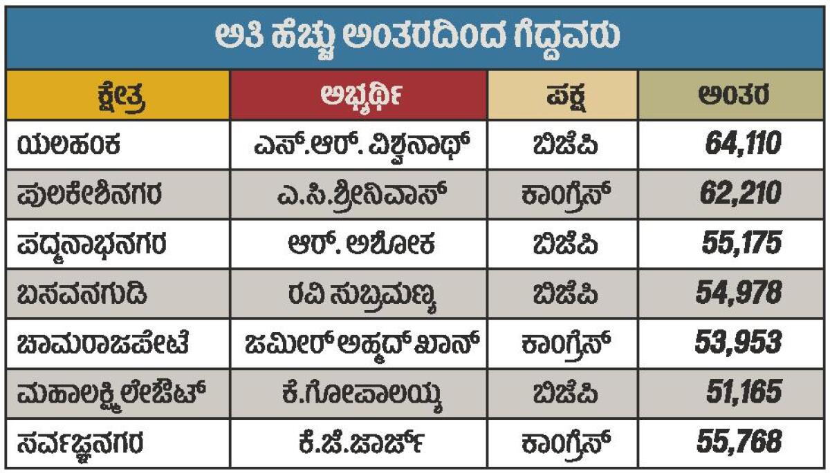 <p><strong>ಬೆಂಗಳೂರು:</strong> ವೈಯಕ್ತಿಕ ವರ್ಚಸ್ಸು ಹಾಗೂ ಪಕ್ಷಗಳ ಸಿದ್ಧಾಂತಕ್ಕೆ ಅಂಟಿಕೊಳ್ಳುವ ಪ್ರಕ್ರಿಯೆಯನ್ನು ಮುಂದುವರಿಸಿರುವ ರಾಜಧಾನಿಯ ಮತದಾರರು, ಮತ್ತೆ ಅದೇ ಪಕ್ಷ ಹಾಗೂ ವ್ಯಕ್ತಿಗಳಿಗೆ ಮಣೆ ಹಾಕಿದ್ದಾರೆ. ಈ ನಿಟ್ಟಿನಲ್ಲಿ ಸ್ಥಾನಗಳ ಸಂಖ್ಯೆಯಲ್ಲಿ ಬಿಜೆಪಿ ಒಂದು ಸ್ಥಾನವನ್ನು ಹೆಚ್ಚಿಸಿಕೊಂಡಿದ್ದರೆ, ಕಾಂಗ್ರೆಸ್ ಯಥಾಸ್ಥಿತಿ ಕಾಯ್ದುಕೊಂಡಿದೆ. ಜೆಡಿಎಸ್ ಇದ್ದ ಒಂದು ಸ್ಥಾನವನ್ನೂ ಕಳೆದುಕೊಂಡು ಶೂನ್ಯವಾಗಿದೆ.</p>.<p>ನಗರದ 28 ವಿಧಾನಸಭೆ ಕ್ಷೇತ್ರಗಳಲ್ಲಿ ಒಂದೆರಡು ಕ್ಷೇತ್ರಗಳನ್ನು ಹೊರತುಪಡಿಸಿದರೆ, ಹ್ಯಾಟ್ರಿಕ್ ಗೆಲುವು ಸಾಧಿಸಿದವರಿಂದ ಹಿಡಿದು ಮತ್ತೆ ಕಣದಲ್ಲಿದ್ದವರಿಗೆ ಗೆಲುವು ಸುಲಭವಾಗಿರಲ್ಲ. ನೂರಾರು ಕೋಟಿ ಅಭಿವೃದ್ಧಿ ಕಾರ್ಯಗಳು ಮುಂದಿದ್ದರೂ ಮತದಾರ ಸುಲಭವಾಗಿ ವಿಜಯಮಾಲೆಯನ್ನು ಹಾಕಿಲ್ಲ. ಜಿದ್ದಾಜಿದ್ದಿಯ ಹೋರಾಟದಲ್ಲಿ ಅಂತಿಮವಾಗಿ ಗೆದ್ದು ನಗೆಬೀರುವ ಮುನ್ನ ಸಾಕಷ್ಟು ಆತಂಕ ಮನೆ ಮಾಡಿತ್ತು. ಪ್ರಧಾನಿಯವರ ದೀರ್ಘ ರ್ಯಾಲಿ, ಎಐಸಿಸಿ ಮುಖಂಡರ ರ್ಯಾಲಿಗಳು ಮತದಾರರ ಮೇಲೆ ಪ್ರಭಾವ ಬೀರಿಲ್ಲ.</p>.<p>ರಾಜಧಾನಿ ಬೆಂಗಳೂರು ಕಾಂಗ್ರೆಸ್ ಹಾಗೂ ಬಿಜೆಪಿಗೆ ಪ್ರತಿಷ್ಠೆಯ ಜಿಲ್ಲೆ. ಇಲ್ಲಿ ಪ್ರತಿಬಾರಿಯೂ ರಾಷ್ಟ್ರೀಯ ಪಕ್ಷಗಳು ಜಿದ್ದಾಜಿದ್ದಿನ ಹೋರಾಟ ನಡೆಸುತ್ತಿವೆ. ವೈಯಕ್ತಿಕ ಪ್ರಭಾವಳಿಯನ್ನೇ ನಂಬಿಕೊಂಡಿರುವ ಪಕ್ಷಗಳು ಅಂತಹ ವ್ಯಕ್ತಿಗಳಿಗೇ ಮತ್ತೆ ಟಿಕೆಟ್ ನೀಡುವ ಮೂಲಕ ತಮ್ಮ ಸ್ಥಾನಗಳನ್ನು ಉಳಿಸಿಕೊಂಡಿವೆ.</p>.<p>ಬಿಜೆಪಿ ಸರ್ಕಾರದ ಆಡಳಿತ ವಿರೋಧಿ ಹಾಗೂ ಕಾಂಗ್ರೆಸ್ ಪರವಾದ ಅಲೆ ಬೆಂಗಳೂರಿನ ಮತದಾರರ ಮೇಲೆ ಅಂತಹ ಪ್ರಭಾವ ಬೀರಿಲ್ಲ. ವ್ಯಕ್ತಿ ಪ್ರಭಾವಳಿಗೆ ಮತ್ತೆ ಇಲ್ಲಿ ಅವಕಾಶ ಸಿಕ್ಕಿದ್ದು, ಕಾಂಗ್ರೆಸ್ ಹಾಗೂ ಬಿಜೆಪಿಗಳ ಹಾಲಿ ಶಾಸಕರೇ ಗೆಲುವು ಸಾಧಿಸಿದ್ದಾರೆ. ಇವರಿಗೆ ಗೆಲುವು ಅಷ್ಟು ಸುಲಭವಾಗಿರಲ್ಲ. ಆದರೂ, ಜಯ ದಾಖಲಿಸುವಷ್ಟು ಮತಗಳು ಅವರ ಖಾತೆಗೆ ಬಂದಿವೆ.</p>.<p>ಕಾಂಗ್ರೆಸ್ನ ರಾಮಲಿಂಗಾರೆಡ್ಡಿ, ಕೃಷ್ಣ ಬೈರೇಗೌಡ, ಕೆ.ಜೆ. ಜಾರ್ಜ್, ದಿನೇಶ್ ಗುಂಡೂರಾವ್, ಎಂ. ಕೃಷ್ಣಪ್ಪ, ಜಮೀರ್ ಅಹಮದ್ ಖಾನ್, ಬೈರತಿ ಸುರೇಶ್ ತಮ್ಮ ಗೆಲುವನ್ನು ಮುಂದುವರಿಸಿದ್ದಾರೆ. ಅದೇ ರೀತಿ, ಬಿಜೆಪಿಯ ಆರ್. ಅಶೋಕ, ಸುರೇಶ್ ಕುಮಾರ್, ಅಶ್ವತ್ಥನಾರಾಯಣ, ರಘು, ರವಿ ಸುಬ್ರಮಣ್ಯ, ಸತೀಶ್ ರೆಡ್ಡಿ, ಎಸ್.ಆರ್. ವಿಶ್ವನಾಥ್, ಎಸ್.ಟಿ. ಸೋಮಶೇಖರ್, ಎಂ. ಕೃಷ್ಣಪ್ಪ ಅವರ ಜಯಕ್ಕೆ ಅಡ್ಡಿಯಾಗಿಲ್ಲ. </p>.<p>ಪುಲಕೇಶಿನಗರದಲ್ಲಿ ಕಾಂಗ್ರೆಸ್ ಟಿಕೆಟ್ ಬಯಸಿದ್ದ ಅಖಂಡ ಶ್ರೀನಿವಾಸಮೂರ್ತಿ ಬಿಎಸ್ಪಿಯಿಂದ ಸ್ಪರ್ಧಿಸಿದ್ದರು. ಆದರೆ, ಕಾಂಗ್ರೆಸ್ ಶ್ರೀನಿವಾಸ್ ಅವರನ್ನು ಕಣಕ್ಕಿಳಿಸಿ, ಭಾರಿ ಜಯಗಳಿಸುವ ಮೂಲಕ ಇದು ಕಾಂಗ್ರೆಸ್ನದೇ ಕ್ಷೇತ್ರ ಎಂಬುದನ್ನು ಸಾಬೀತುಪಡಿಸಿದೆ. ಇಲ್ಲಿ ಅಭ್ಯರ್ಥಿ ಬದಲಾಗಿದ್ದು, ಕಾಂಗ್ರೆಸ್ ಕ್ಷೇತ್ರ ಉಳಿಸಿಕೊಂಡಿದೆ.</p>.<p>ಮಹದೇವಪುರದಲ್ಲಿ ಬಿಜೆಪಿ ಅರವಿಂದ ಲಿಂಬಾವಳಿ ಅವರ ಬದಲಿಗೆ ಅವರ ಪತ್ನಿ ಮಂಜುಳಾ ಅವರನ್ನು ಕಣಕ್ಕಿಳಿಸಿತು. ಕಾಂಗ್ರೆಸ್ ಎಚ್. ನಾಗೇಶ್ ಅವರನ್ನು ಇಲ್ಲಿಗೆ ತಂದು ನಿಲ್ಲಿಸಿದರೂ, ಬಿಜೆಪಿಯ ಪ್ರಾಬಲ್ಯವನ್ನು ಕಸಿದುಕೊಳ್ಳಲಾಗಿಲ್ಲ. ಹೀಗಾಗಿ, ವ್ಯಕ್ತಿ ಬದಲಾದರೂ ಬಿಜೆಪಿ ಕ್ಷೇತ್ರದಲ್ಲಿ ವಿಜಯ ಸಾಧಿಸಿತು.</p>.<p>ಗೋವಿಂದರಾಜನಗರದಲ್ಲಿ ವಿ. ಸೋಮಣ್ಣ ಅವರ ಬದಲಿಗೆ ಮಾಜಿ ಕಾರ್ಪೊರೇಟರ್ ಉಮೇಶ್ ಶೆಟ್ಟಿ ಅವರು ಬಿಜೆಪಿಯಿಂದ ಕಣದಲ್ಲಿದ್ದರು. ಸೋಮಣ್ಣ ಅವರಿ