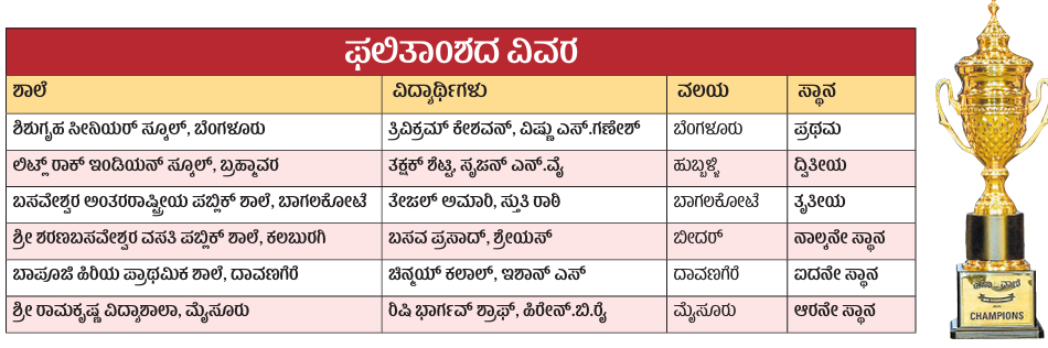 – ತಕ್ಷಕ್ ಶೆಟ್ಟಿ ಸೃಜನ್ ಎನ್.ವೈ ಲಿಟ್ಲ್ ರಾಕ್ ಇಂಡಿಯನ್ ಸ್ಕೂಲ್ ಬ್ರಹ್ಮಾವರ ಉಡುಪಿ ಜಿಲ್ಲೆ