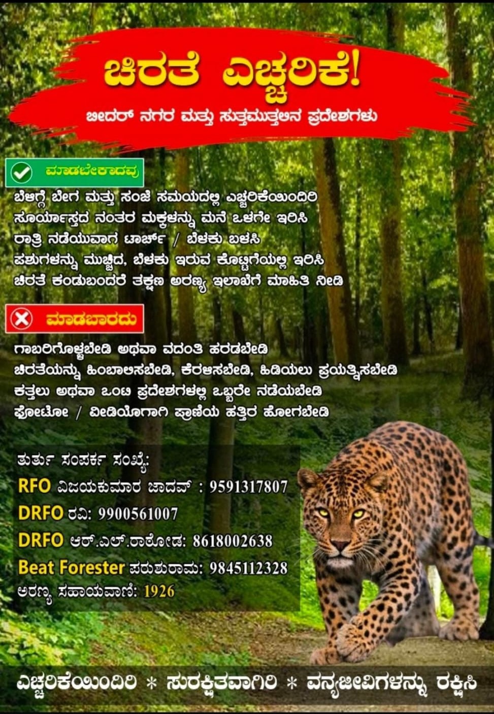 <p><strong>ಬೀದರ್:</strong> ಬೀದರ್ ಹಾಗೂ ಸುತ್ತಮುತ್ತಲಿನ ಪ್ರದೇಶಗಳಲ್ಲಿ ಚಿರತೆ ಕಾಣಿಸಿಕೊಂಡಿದ್ದು, ಸಾರ್ವಜನಿಕರು ಎಚ್ಚರಿಕೆ ವಹಿಸಬೇಕೆಂದು ಜಿಲ್ಲಾ ಉಪ ಅರಣ್ಯ ಸಂರಕ್ಷಣಾಧಿಕಾರಿ ಆಶಿಷ್ ರೆಡ್ಡಿ ತಿಳಿಸಿದ್ದಾರೆ.</p><p>ತಾಲ್ಲೂಕಿನ ಸುತ್ತಮುತ್ತಲಿನ ಪ್ರದೇಶಗಳಲ್ಲಿ ಡಂಗುರ ಸಾರಿ, ಗ್ರಾಮ ಸಭೆಗಳನ್ನು ನಡೆಸಿ ತಿಳಿಸಲಾಗುತ್ತಿದೆ. ಬೆಳಿಗ್ಗೆ ಮತ್ತು ಸಂಜೆ ಸಮಯದಲ್ಲಿ ಎಚ್ಚರಿಕೆಯಿಂದ ಓಡಾಡಬೇಕು. ಸೂರ್ಯಾಸ್ತದ ನಂತರ ಮಕ್ಕಳನ್ನು ಮನೆಯ ಹೊರಗೆ ಬಿಡಬಾರದು. ರಾತ್ರಿ ಓಡಾಡುವಾಗ ಟಾರ್ಚ್/ಬೆಳಕು ಬಳಸಿ, ಪಶುಗಳನ್ನು ಮುಚ್ಚಿದ, ಬೆಳಕು ಇರುವ ಕೊಟ್ಟಿಗೆಯಲ್ಲಿ ಇರಿಸಬೇಕು. ಚಿರತೆ ಕಂಡು ಬಂದಿರುವ ಆಯಾ ಗ್ರಾಮಗಳಲ್ಲಿ ಭಿತ್ತಿ ಪತ್ರಗಳನ್ನು ಅಂಟಿಸಲಾಗುತ್ತಿದೆ. ಚಿರತೆ ಕಾಣಿಸಿದರೆ ತಕ್ಷಣವೇ ಮಾಹಿತಿ ಹಂಚಿಕೊಳ್ಳಬೇಕೆಂದು ಮನವಿ ಮಾಡಿದ್ದಾರೆ.</p><p>ಅರಣ್ಯ ಇಲಾಖೆಯ ಆರ್.ಎಫ್.ಒ. ವಿಜಯಕುಮಾರ ಜಾಧವ್ (9591317807), ಡಿ.ಆರ್.ಎಫ್.ಒ. ರವಿ (9900561007), ಡಿ.ಆರ್.ಎಫ್.ಒ. ಆರ್.ಎಲ್.ರಾಠೋಡ್ (8618002638), ಬಿಟ್ ಫಾರೇಸ್ಟರ್ ಪರಶುರಾಮ (9845112328), ಅರಣ್ಯ ಸಹಾಯವಾಣಿ ಸಂಖ್ಯೆ: 1926 ಗೆ ಕರೆ ಮಾಡಿ ಮಾಹಿತಿ ನೀಡಬೇಕೆಂದು ತಿಳಿಸಿದ್ದಾರೆ.</p>.<div><p><strong>ಪ್ರಜಾವಾಣಿ ಆ್ಯಪ್ ಇಲ್ಲಿದೆ: <a href="https://play.google.com/store/apps/details?id=com.tpml.pv">ಆಂಡ್ರಾಯ್ಡ್ </a>| <a href="https://apps.apple.com/in/app/prajavani-kannada-news-app/id1535764933">ಐಒಎಸ್</a> | <a href="https://whatsapp.com/channel/0029Va94OfB1dAw2Z4q5mK40">ವಾಟ್ಸ್ಆ್ಯಪ್</a>, <a href="https://www.twitter.com/prajavani">ಎಕ್ಸ್</a>, <a href="https://www.fb.com/prajavani.net">ಫೇಸ್ಬುಕ್</a> ಮತ್ತು <a href="https://www.instagram.com/prajavani">ಇನ್ಸ್ಟಾಗ್ರಾಂ</a>ನಲ್ಲಿ ಪ್ರಜಾವಾಣಿ ಫಾಲೋ ಮಾಡಿ.</strong></p></div>