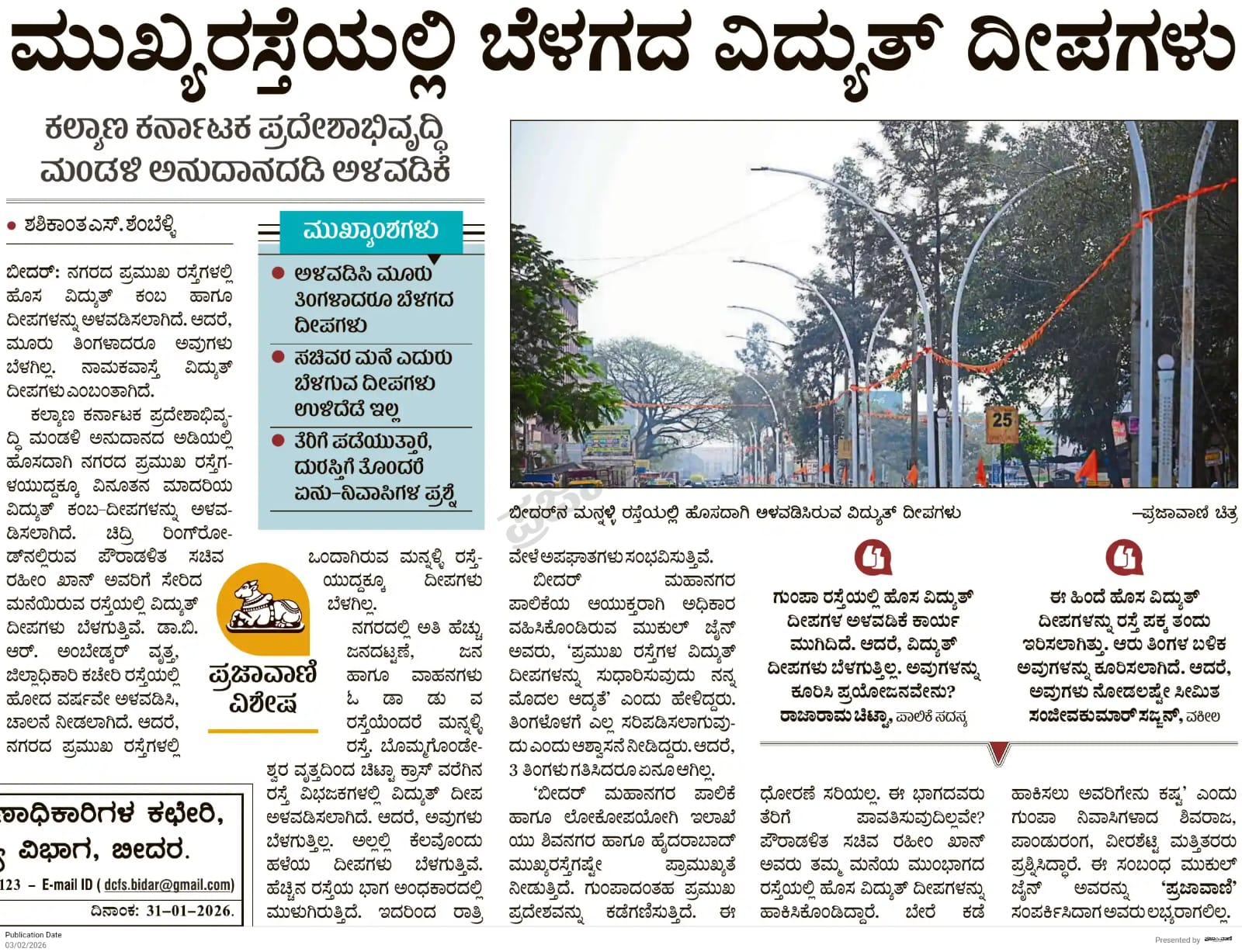 <p><strong>ಬೀದರ್</strong>: ನಗರದ ಮನ್ನಳ್ಳಿ ರಸ್ತೆಯುದ್ದಕ್ಕೂ ಹೊಸದಾಗಿ ಅಳವಡಿಸಿರುವ ವಿದ್ಯುತ್ ಕಂಬಗಳಲ್ಲಿ ಕೊನೆಗೂ ದೀಪಗಳು ಬೆಳಗಿವೆ.</p><p>‘ಮುಖ್ಯರಸ್ತೆಯಲ್ಲಿ ಬೆಳಗದ ವಿದ್ಯುತ್ ದೀಪಗಳು’ ಶೀರ್ಷಿಕೆಯಡಿ ‘ಪ್ರಜಾವಾಣಿ’ ಫೆಬ್ರುವರಿ 3ರಂದು ವರದಿ ಪ್ರಕಟಿಸಿತ್ತು.</p><p>ನಗರದ ಮನ್ನಳ್ಳಿ ಮುಖ್ಯರಸ್ತೆಯ ಚಿಟ್ಟಾ ಕ್ರಾಸ್ನಿಂದ ಕುಂಬಾರವಾಡ ಕ್ರಾಸ್ ವರೆಗೆ ಸಂಪರ್ಕ ಕಲ್ಪಿಸಲಾಗಿದ್ದು, ವಿದ್ಯುತ್ ದೀಪಗಳು ಝಗಮಗಿಸುತ್ತಿವೆ. ಹಂತ ಹಂತವಾಗಿ ನಗರದ ಪ್ರಮುಖ ರಸ್ತೆಗಳಲ್ಲಿ ದೀಪಗಳು ಉರಿಯಲಿವೆ ಎಂದು ಅಧಿಕಾರಿಗಳು ‘ಪ್ರಜಾವಾಣಿ’ಗೆ ತಿಳಿಸಿದ್ದಾರೆ.</p>.<p>ಕೆಕೆಆರ್ಡಿಬಿ ಅನುದಾನದಡಿ ನಗರದ ಪ್ರಮುಖ ರಸ್ತೆಗಳಲ್ಲಿ ಹೊಸದಾಗಿ ವಿದ್ಯುತ್ ಕಂಬಗಳನ್ನು ಅಳವಡಿಸಲಾಗಿದೆ. ಆದರೆ, ಮೂರು ತಿಂಗಳು ಕಳೆದರೂ ವಿದ್ಯುತ್ ದೀಪಗಳು ಬೆಳಗದ ಕಾರಣ ಅಂಧಕಾರ ಆವರಿಸಿಕೊಂಡಿದೆ ಎಂದು ‘ಪ್ರಜಾವಾಣಿ’ ವರದಿಯಲ್ಲಿ ಪ್ರಸ್ತಾಪಿಸಲಾಗಿತ್ತು. ಇದಕ್ಕೆ ಸ್ಪಂದಿಸಿದ ನಿರ್ಮಿತಿ ಕೇಂದ್ರ ಹಾಗೂ ಮಹಾನಗರ ಪಾಲಿಕೆ, ಎಲ್ಲೆಡೆ ಕಂಬಗಳಿಗೆ ವಿದ್ಯುತ್ ಸಂಪರ್ಕ ಕಲ್ಪಿಸುವ ಕೆಲಸ ಕೈಗೆತ್ತಿಕೊಂಡಿದೆ.</p>.<div><p><strong>ಪ್ರಜಾವಾಣಿ ಆ್ಯಪ್ ಇಲ್ಲಿದೆ: <a href="https://play.google.com/store/apps/details?id=com.tpml.pv">ಆಂಡ್ರಾಯ್ಡ್ </a>| <a href="https://apps.apple.com/in/app/prajavani-kannada-news-app/id1535764933">ಐಒಎಸ್</a> | <a href="https://whatsapp.com/channel/0029Va94OfB1dAw2Z4q5mK40">ವಾಟ್ಸ್ಆ್ಯಪ್</a>, <a href="https://www.twitter.com/prajavani">ಎಕ್ಸ್</a>, <a href="https://www.fb.com/prajavani.net">ಫೇಸ್ಬುಕ್</a> ಮತ್ತು <a href="https://www.instagram.com/prajavani">ಇನ್ಸ್ಟಾಗ್ರಾಂ</a>ನಲ್ಲಿ ಪ್ರಜಾವಾಣಿ ಫಾಲೋ ಮಾಡಿ.</strong></p></div>