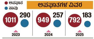 <p><strong>ಚಿಕ್ಕಮಗಳೂರು:</strong> ರಸ್ತೆ ಸುರಕ್ಷತಾ ಕ್ರಮಗಳ ನಡುವೆಯೂ ಜಿಲ್ಲೆಯಲ್ಲಿ ಅಪಘಾತಗಳು ನಿರಂತರವಾಗಿ ನಡೆಯುತ್ತಿವೆ. ವರ್ಷದಲ್ಲಿ 200ಕ್ಕೂ ಹೆಚ್ಚು ಜನ ಪ್ರಾಣ ಕಳೆದುಕೊಳ್ಳುತ್ತಿದ್ದಾರೆ.</p>.<p>2022–2024ರ ಅವಧಿಯಲ್ಲಿ ಪದೇ ಪದೇ ಅಪಘಾತ ಸಂಭವಿಸಿರುವ 26 ಸ್ಥಳಗಳನ್ನು ಪೊಲೀಸ್ ಇಲಾಖೆ ಪಟ್ಟಿ ಮಾಡಿತ್ತು. ಈ ಪೈಕಿ 22 ಸ್ಥಳಗಳನ್ನು ಸಂಬಂಧಪಟ್ಟ ಇಲಾಖೆಗಳು ಸರಿಪಡಿಸಿವೆ. ನಾಲ್ಕು ಸ್ಥಳಗಳು ಹಾಗೇ ಉಳಿದುಕೊಂಡಿವೆ.</p>.<p>ಪೊಲೀಸ್ ಇಲಾಖೆ ಗುರುತಿಸಿದ್ದ 26 ಸ್ಥಳಗಳಲ್ಲಿ ರಾಷ್ಟ್ರೀಯ ಹೆದ್ದಾರಿಯಲ್ಲೇ 21 ಸ್ಥಳಗಳಿದ್ದವು. ಉಳಿದ 5 ಸ್ಥಳಗಳನ್ನು ರಾಜ್ಯ ಹೆದ್ದಾರಿಯಲ್ಲಿ ಗುರುತಿಸಲಾಗಿತ್ತು. 21 ಸ್ಥಳಗಳಲ್ಲಿ ಅಪಘಾತ ತಪ್ಪಿಸಲು ಕ್ರಮ ಕೈಗೊಳ್ಳಲಾಗಿದೆ. ರಾಷ್ಟ್ರೀಯ ಹೆದ್ದಾರಿಯಲ್ಲಿ ಮೂರು ಸ್ಥಳಗಳು ಮತ್ತು ರಾಜ್ಯ ಹೆದ್ದಾರಿಯಲ್ಲಿ ಒಂದು ಸ್ಥಳ ಇನ್ನೂ ಸರಿಯಾಗಬೇಕಿದೆ.</p>.<p>ಈ 26 ಸ್ಥಳಗಳ ಹೊರತಾಗಿಯೂ ಹೊಸ ಅಪಘಾತ ವಲಯಗಳು ನಿರ್ಮಾಣವಾಗುತ್ತಿವೆ. ಇದರಿಂದಾಗಿ 2025ರ ಜನವರಿಯಿಂದ ಇದುವರೆಗೆ ಒಟ್ಟು 792 ಅಪಘಾತಗಳು ಸಂಭವಿಸಿವೆ. 2023ರಲ್ಲಿ 1011, 2024ರಲ್ಲಿ 949 ಇತ್ತು. ಈ ವರ್ಷ ಡಿಸೆಂಬರ್ ಪೂರ್ಣಗೊಳ್ಳುವ ಮುನ್ನ ಅಪಘಾತಗಳ ಸಂಖ್ಯೆ 792 ಇದೆ. ಮೂರು ವರ್ಷಗಳಲ್ಲಿ 730 ಜನ ಮೃತಪಟ್ಟಿದ್ದಾರೆ.</p>.<p>ಕಡೂರು–ಮೂಡಿಗೆರೆ–ಮಂಗಳೂರು, ತುಮಕೂರು–ಹೊನ್ನಾವರ, ಮಂಗಳೂರು–ಕಾರ್ಕಳ–ಶೃಂಗೇರಿ–ಕೊಪ್ಪ–ಶಿವಮೊಗ್ಗ ಸಂಪರ್ಕಿಸುವ ಮೂರು ರಾಷ್ಟ್ರೀಯ ಹೆದ್ದಾರಿಗಳು ಜಿಲ್ಲೆಯಲ್ಲಿ ಹಾದು ಹೋಗಿವೆ. ಬಹುತೇಕ ಅಪಘಾತಗಳು ರಾಷ್ಟ್ರೀಯ ಹೆದ್ದಾರಿಯಲ್ಲೇ ನಡೆದಿದ್ದು, ಅದರಲ್ಲೂ ಜಿಲ್ಲೆಯ ವ್ಯಾಪ್ತಿಯ ತುಮಕೂರು–ಹೊನ್ನಾವರ ರಾಷ್ಟ್ರೀಯ ಹೆದ್ದಾರಿಯಲ್ಲೆ ಹೆಚ್ಚು ಅವಘಡಗಳು ನಡೆದಿವೆ. </p>.<p>ಹೊಸದಾಗಿ ನಿರ್ಮಾಣವಾಗಿರುವ ಕಡೂರು–ಮೂಡಿಗೆರೆ–ಮಂಗಳೂರು ರಸ್ತೆಯಲ್ಲೂ ಹೆಚ್ಚಾಗಿ ಅಪಘಾತಗಳು ಸಂಭವಿಸುತ್ತಿವೆ. ಲಕ್ಯಾ ಕ್ರಾಸ್ ಕೂಡ ಪ್ರಮುಖ ಅಪಘಾತ ತಾಣವಾಗಿದ್ದು, ರಸ್ತೆ ವಿಸ್ತರಣೆ ಮತ್ತು ಉಬ್ಬುಗಳನ್ನು ನಿರ್ಮಿಸಿ ಸರಿಪಡಿಸುವ ಕಾರ್ಯ ನಡೆದಿದೆ. ಆದರೂ, ಅಪಘಾತಗಳು ಆಗಾಗ ಸಂಭವಿಸುತ್ತಿವೆ.</p>.<p><strong>ಕಡೂರು: ಅಪಘಾತ ತಪ್ಪಿಸಲು ಕ್ರಮ</strong> </p><p>ಪಟ್ಟಣ ವ್ಯಾಪ್ತಿಯಲ್ಲಿ ಕನಕ ವೃತ್ತದಿಂದ ಚಿಕ್ಕ ಪಟ್ಟಣಗೆರೆ ಕ್ರಾಸ್ ವರೆಗೆ ಅಂಡರ್ ಬ್ರಿಡ್ಜ್ ರಸ್ತೆಯಿಂದ ಕನಕ ವೃತ್ತದ ವರೆಗೆ ತಂಗಲಿಯಿಂದ ಗೆದ್ಲೆಹಳ್ಳಿ ವರೆಗೆ ಕುಪ್ಪಾಳು ಮೊರಾರ್ಜಿ ವಸತಿ ಶಾಲೆಯ ಬಳಿ ಉದ್ದೇಬೋರನಹಳ್ಳಿ ಜಾನ್ ಸಾಲೆ ಎಸ್ಟೇಟ್ ಬಳಿ ಹಿರೇಗೌಜ ವೃತ್ತದ ಬಳಿ ಅಪಘಾತದ ಸ್ಥಳಗಳನ್ನು ಪೊಲೀಸ್ ಇಲಾಖೆ ಗುರುತಿಸಿತ್ತು. ಈ ಜಾಗಗಳಲ್ಲಿ ರಸ್ತೆ ಉಬ್ಬುಗಳನ್ನು ನಿರ್ಮಿಸಿ ಕೆಲವೆಡೆ ರಸ್ತೆ ವಿಭಜಕ ನಿರ್ಮಿಸಿ ಸಮಸ್ಯೆ ಪರಿಹರಿಸಲಾಗಿದೆ. ಬಿ.ಎಚ್. ರಸ್ತೆಯ ವೇದಾ ಸೇತುವೆ ವಲಯ ಸದ್ಯ ಲೋಕೋಪಯೋಗಿ ಇಲಾಖೆಗೆ ಹಸ್ತಾಂತರಗೊಂಡಿದೆ. ಅಲ್ಲಿ ಇನ್ನೂ ದುರಸ್ತಿ ಬಾಕಿ ಇದೆ. ಬೀರೂರು ವ್ಯಾಪ್ತಿಯಲ್ಲಿ ಕೋರನಹಳ್ಳಿ ಗೇಟ್ ಕೋಡಿಹಳ್ಳಿ ಕ್ರಾಸ್ ಕೂಡ್ಲೂರು ಗೇಟ್ ಕಡೂರು ರಸ್ತೆಯ ಬ್ರೈಟ್ ಫ್ಯೂಚರ್ ಶಾಲೆಯ ಬಳಿ ಅಪಘಾತ ವಲಯ ಎಂದು ಗುರುತಿಸಲಾಗಿತ್ತು. ಈ ಎಲ್ಲ ಕಡೆ ಮಾಹಿತಿ ಫಲಕಗಳು ರಸ್ತೆ ಉಬ್ಬುಗಳು ಮಾರ್ಗ ಬದಲಾವಣೆಗೆ ತಿರುವಿನ ವ್ಯವಸ್ಥೆ ಕಲ್ಪಿಸಿ ಸಮಸ್ಯೆಗಳನ್ನು ಬಗೆಹರಿಸಲಾಗಿದೆ ಎಂದು ಪೊಲೀಸರು ತಿಳಿಸಿದ್ದಾರೆ. ಬೀರೂರು ಲಿಂಗದಹಳ್ಳಿ ರಸ್ತೆಯಲ್ಲಿ ತೋಟದ ಕ್ರಾಸ್ ಬಳಿ ಈ ಹಿಂದೆ ಬ್ಲಾಕ್ ಸ್ಪಾಟ್ ಎಂದು ಗ