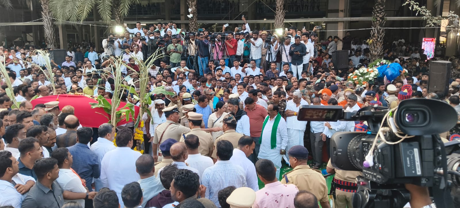 <p><strong>ದಾವಣಗೆರೆ:</strong> ಹಿರಿಯ ಶಾಸಕ ಶಾಮನೂರು ಶಿವಶಂಕರಪ್ಪ ಅವರ ಅಂತ್ಯಕ್ರಿಯೆ ಸಕಲ ಸರ್ಕಾರಿ ಗೌರವಗಳೊಂದಿಗೆ ವೀರಶೈವ ಲಿಂಗಾಯತ ಸಂಪ್ರದಾಯದ ಪ್ರಕಾರ ನಗರದ ಆನೆಕೊಂಡದ ಕಲ್ಲೇಶ್ವರ ರೈಸ್ ಮಿಲ್ ಆವರಣದಲ್ಲಿ ಸೋಮವಾರ ಸಂಜೆ 6ಕ್ಕೆ ನೆರವೇರಿತು.</p>.<p>ಶಿವಶಂಕರಪ್ಪ ಅವರ ಪಾರ್ಥಿವ ಶರೀರವನ್ನು ಮೆರವಣಿಗೆ ಮೂಲಕ ಕಲ್ಲೇಶ್ವರ ಮಿಲ್ ಆವರಣಕ್ಕೆ ತರಲಾಯಿತು. ನಗರದ ಎಂಸಿಸಿ ಬಡಾವಣೆಯ ಅವರ ನಿವಾಸದಿಂದ ಮಧ್ಯಾಹ್ನ 12.20ಕ್ಕೆ ಹೊರಟ ಪಾರ್ಥಿವ ಶರೀರದ ಅಂತಿಮ ಯಾತ್ರೆ 1.30ಕ್ಕೆ ಹೈಸ್ಕೂಲ್ ಮೈದಾನ ತಲುಪಿತು. ಅಲ್ಲಿಂದ ಮಧ್ಯಾಹ್ನ 2.45ಕ್ಕೆ ಆರಂಭವಾದ ಅಂತಿಮ ಯಾತ್ರೆ ನಗರದ ವಿವಿಧ ಭಾಗಗಳಲ್ಲಿ ಸಾಗಿ ಸಂಜೆ 4.30ಕ್ಕೆ ಕಲ್ಲೇಶ್ವರ ಮಿಲ್ ಆವರಣ ತಲುಪಿತು.</p>.ಹಿರಿಯ ರಾಜಕಾರಣಿ, ಕಾಂಗ್ರೆಸ್ ಶಾಸಕ ಶಾಮನೂರು ಶಿವಶಂಕರಪ್ಪ ನಿಧನ.<p>ಪಾರ್ಥಿವ ಶರೀರವನ್ನು ಮಿಲ್ ಆವರಣಕ್ಕೆ ತರುತ್ತಿದ್ದಂತೆ ಎಐಸಿಸಿ ಅಧ್ಯಕ್ಷ ಮಲ್ಲಿಕಾರ್ಜುನ ಖರ್ಗೆ, ಮುಖ್ಯಮಂತ್ರಿ ಸಿದ್ದರಾಮಯ್ಯ, ಉಪಮುಖ್ಯಮಂತ್ರಿ ಡಿ.ಕೆ. ಶಿವಕುಮಾರ್ ಆಗಮಿಸಿದರು. ಕೈವಲ್ಯದಲ್ಲೇ ಇದ್ದ ಪಾರ್ಥಿವ ಶರೀರಕ್ಕೆ ಪುಷ್ಪ ನಮನ ಸಲ್ಲಿಸಿದರು. </p>.<p>ಪೊಲೀಸರು ಮೂರು ಸುತ್ತು ಗಾಳಿಯಲ್ಲಿ ಗುಂಡು ಹಾರಿಸಿ ಸರ್ಕಾರಿ ಗೌರವ ಸಲ್ಲಿಸಿದರು. ಆ ಬಳಿಕ ಅಂತ್ಯಕ್ರಿಯೆ ಪ್ರಕ್ರಿಯೆ ಅಂತಿಮ ಹಂತ ತಲುಪಿತು. ಈ ಸಂದರ್ಭದಲ್ಲಿ ಐಕ್ಯ ಮಂಟಪದ ಸಮೀಪ ಎಲ್ಲರಿಗೂ ವಿಭೂತಿ ನೀಡಲಾಯಿತು. ಈ ವೇಳೆ ನೂಕಾಟ, ತಳ್ಳಾಟವೂ ಉಂಟಾಯಿತು.</p>.<p>ಶಿವಶಂಕರಪ್ಪ ಅವರ ಪತ್ನಿ ಪಾರ್ವತಮ್ಮ ಅವರ ಸಮಾಧಿಯ ಪಕ್ಕದಲ್ಲೇ 9x5 ಅಡಿ ಸುತ್ತಳತೆಯ ಕುಣಿಯಲ್ಲಿ ದೀಪಗಳನ್ನು ಇಡಲು ಮೆಟ್ಟಿಲು ನಿರ್ಮಾಣ ಮಾಡಲಾಗಿತ್ತು. ವಿವಿಧ ಮಠಾಧೀಶರ ಸಮ್ಮುಖದಲ್ಲಿ ಅಂತಿಮ ವಿಧಿ ವಿಧಾನಗಳು ನೆರವೇರಿದವು. </p>.<p>ಶಿವಶಂಕರಪ್ಪ ಅವರ ಪಾರ್ಥಿವ ಶರೀರವನ್ನು ಕುಣಿಯಲ್ಲಿ ಯೋಗ ಭಂಗಿಯಲ್ಲಿ ಕೂರಿಸಲಾಯಿತು. ಜೊತೆಗೆ 500ಕ್ಕೂ ಹೆಚ್ಚು ವಿಭೂತಿಗಳನ್ನು ಇಡಲಾಯಿತು. ಪುತ್ರರಾದ ಎಸ್.ಎಸ್. ಬಕ್ಕೇಶ್, ಎಸ್.ಎಸ್. ಗಣೇಶ್ ಹಾಗೂ ಎಸ್.ಎಸ್. ಮಲ್ಲಿಕಾರ್ಜುನ್ ಅವರು ಅಂತಿಮ ವಿಧಿವಿಧಾನ ಪೂರೈಸಿದರು. </p>.<p>ಸಿರಿಗೆರೆ ಮಠದ ಶಿವಮೂರ್ತಿ ಶಿವಚಾರ್ಯ ಸ್ವಾಮೀಜಿ, ಬಾಳೆಹೊನ್ನೂರು ರಂಭಾಪುರಿ ಪೀಠದ ವೀರಸೋಮೇಶ್ವರ ಸ್ವಾಮೀಜಿ, ಉಜ್ಜಯಿನಿ ಪೀಠದ ಸಿದ್ಧಲಿಂಗ ರಾಜದೇಶಿಕೇಂದ್ರ ಸ್ವಾಮೀಜಿ, ಸಾಣೇಹಳ್ಳಿ ಮಠದ ಪಂಡಿತಾರಾಧ್ಯ ಶಿವಚಾರ್ಯ ಸ್ವಾಮೀಜಿ, ಪಂಚಮಸಾಲಿ ಗುರುಪೀಠದ ವಚನಾಂದ ಸ್ವಾಮೀಜಿ ಸೇರಿದಂತೆ ಅನೇಕ ಮಠಧೀಶರು ಭಾಗಿಯಾಗಿದ್ದರು. </p>.<p>ಲೋಕೋಪಯೋಗಿ ಸಚಿವ ಸತೀಶ್ ಜಾರಕಿಹೊಳಿ, ಕೈಗಾರಿಕಾ ಸಚಿವ ಎಂ.ಬಿ.ಪಾಟೀಲ, ಸಹಕಾರ ಸಚಿವ ಶಿವಾನಂದ ಪಾಟೀಲ, ಸಾಂಖ್ಯಿಕ ಸಚಿವ ಡಿ. ಸುಧಾಕರ್, ವಸತಿ ಸಚಿವ ಜಮೀರ್ ಅಹಮ್ಮದ್, ಅರಣ್ಯ ಸಚಿವ ಈಶ್ವರ್ ಖಂಡ್ರೆ, ವಿಧಾನಪರಿಷತ್ ಸಭಾಧ್ಯಕ್ಷ ಬಸವರಾಜ ಹೊರಟ್ಟಿ, ವಿರೋಧ ಪಕ್ಷದ ನಾಯಕ ಆರ್. ಅಶೋಕ್, ವಿಧಾನಸಭೆ ಉಪಸಭಾಪತಿ ರುದ್ರಪ್ಪ ಲಮಾಣಿ, ಬೋಸರಾಜ್, ವಿಧಾನಪರಿಷತ್ ಸದಸ್ಯರಾದ ಸಿ.ಟಿ.ರವಿ, ಉಮಾಶ್ರೀ, ಶಾಸಕರಾದ ಟಿ.ರಘುಮೂರ್ತಿ, ವಿಜಯಾನಂದ ಕಾಶಪ್ಪನವರ್, ಡಿ.ಜಿ.ಶಾಂತನಗೌಡ, ಕೆ.ಎಸ್.ಬಸವಂತಪ್ಪ, ಸಂಸದೆ ಡಾ.ಪ್ರಭಾ ಮಲ್ಲಿಕಾರ್ಜುನ, ಬಿಜೆಪಿ ರಾಜ್ಯ ಘಟಕದ ಅಧ್ಯಕ್ಷ ಬಿ.ವೈ.ವಿಜಯೇಂದ್ರ ಅಂತ್ಯಕ್ರಿಯೆಯಲ್ಲಿ ಪಾಲ್ಗೊಂಡಿದ್ದರು.</p>.ಶಾಮನೂರು ಶಿವಶಂಕರಪ್ಪ ನಿಧನ:ಕಲ್ಲೇಶ್ವರ ಮಿಲ್ ಆವರಣದಲ್ಲಿ ಇಂದು ಸಂಜೆ ಅಂತ್ಯಕ್ರಿಯೆ.<div><p><strong>ಪ್ರಜಾವಾಣಿ ಆ್ಯಪ್ ಇಲ್ಲಿ
