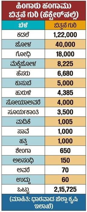 ಈ ಬಾರಿಯ ಹಿಂಗಾರಿನಲ್ಲಿ ಹುಬ್ಬಳ್ಳಿ ಗ್ರಾಮೀಣದಲ್ಲಿ 26146 ಹೆಕ್ಟೇರ್. ಹುಬ್ಬಳ್ಳಿ ನಗರದಲ್ಲಿ 6019 ಹೆಕ್ಟೇರ್ನಲ್ಲಿ ಕಡಲೆ ಜೋಳ ಗೋಧಿ ಹಾಗೂ ಕುಸುಬೆ ಸೇರಿದಂತೆ ಹಿಂಗಾರು ಬೆಳೆಗಳ ಬಿತ್ತನೆಯ ಗುರಿ ಹೊಂದಲಾಗಿದೆ