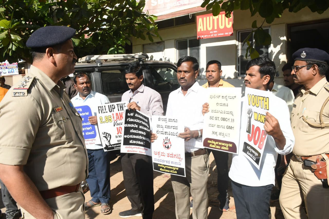<p><strong>ಧಾರವಾಡ:</strong> ಕೇಂದ್ರ ಮತ್ತು ರಾಜ್ಯ ಸರ್ಕಾರಗಳ ವಿವಿಧ ಇಲಾಖೆಗಳಲ್ಲಿ ಖಾಲಿ ಇರುವ ಹುದ್ದೆಗಳ ನೇಮಕಾತಿಗೆ ಆಗ್ರಹಿಸಿ ಪ್ರತಿಭಟನೆಗೆ ಮುಂದಾದ ಪ್ರತಿಭಟನಾಕಾರರನ್ನು ಫೋಲೀಸರು ವಶಕ್ಕೆ ಪಡೆದು ವಾಹನದಲ್ಲಿ ಕರೆದೊಯ್ದರು.</p><p>ಪ್ರತಿಭಟನೆಗೆ ಪೊಲೀಸರು ಅನುಮತಿ ನಿರಾಕರಿಸಿದ್ದರು. ಎನ್ಟಿಟಿಎಫ್ ಬಳಿಯ ಸನ್ಮತಿ ಮಾರ್ಗದಲ್ಲಿರುವ ಎಸ್ಯುಸಿಐ ಕಚೇರಿ ಮುಂಭಾಗದಲ್ಲಿ ಪ್ರತಿಭಟನಾಕಾರರನ್ನು ವಶಕ್ಕೆ ಪಡೆದರು.</p><p>ಆರು ಪ್ರತಿಭಟನಾಕಾರರನ್ನು ವಶಕ್ಕೆ ಪಡೆದಿದ್ದಾರೆ. ಎಸ್ಯುಸಿಐ ಕಚೇರಿ ಬಳಿ ಪೊಲೀಸರನ್ನು ನಿಯೋಜಿಸಲಾಗಿದೆ.</p><p>ನಗರದ ವಿವಿಧೆಡೆ ಪೊಲೀಸ್ ಪಹರೆ ಹಾಕಲಾಗಿದೆ.</p>.<div><p><strong>ಪ್ರಜಾವಾಣಿ ಆ್ಯಪ್ ಇಲ್ಲಿದೆ: <a href="https://play.google.com/store/apps/details?id=com.tpml.pv">ಆಂಡ್ರಾಯ್ಡ್ </a>| <a href="https://apps.apple.com/in/app/prajavani-kannada-news-app/id1535764933">ಐಒಎಸ್</a> | <a href="https://whatsapp.com/channel/0029Va94OfB1dAw2Z4q5mK40">ವಾಟ್ಸ್ಆ್ಯಪ್</a>, <a href="https://www.twitter.com/prajavani">ಎಕ್ಸ್</a>, <a href="https://www.fb.com/prajavani.net">ಫೇಸ್ಬುಕ್</a> ಮತ್ತು <a href="https://www.instagram.com/prajavani">ಇನ್ಸ್ಟಾಗ್ರಾಂ</a>ನಲ್ಲಿ ಪ್ರಜಾವಾಣಿ ಫಾಲೋ ಮಾಡಿ.</strong></p></div>