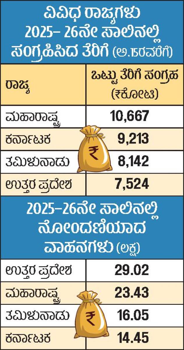 <p>ಹುಬ್ಬಳ್ಳಿ: ದೇಶದ ವಿವಿಧ ರಾಜ್ಯಗಳಲ್ಲಿ ಪ್ರತಿ ವರ್ಷ ನೋಂದಣಿಯಾಗುವ ವಾಹನಗಳ ಸಂಖ್ಯೆಗೆ ಹೋಲಿಸಿದರೆ ನಾಲ್ಕನೇ ಸ್ಥಾನದಲ್ಲಿ ಇರುವ ಕರ್ನಾಟಕವು, ರಸ್ತೆ ತೆರಿಗೆ ಸಂಗ್ರಹ ವಿಭಾಗದಲ್ಲಿ ಎರಡನೇ ಸ್ಥಾನದಲ್ಲಿ ಗುರುತಿಸಿಕೊಂಡಿದೆ.</p><p>ಅತಿ ಹೆಚ್ಚು ವಾಹನಗಳು ನೋಂದಣಿಯಾಗುವ ಉತ್ತರ<br>ಪ್ರದೇಶ ತೆರಿಗೆ ಸಂಗ್ರಹದಲ್ಲಿ ನಾಲ್ಕನೇ ಸ್ಥಾನದಲ್ಲಿದೆ. ಮೊದಲ ಸ್ಥಾನದಲ್ಲಿ ಮಹಾರಾಷ್ಟ್ರವಿದೆ. ವಾಹನಗಳ ನೋಂದಣಿ ಮತ್ತು ತೆರಿಗೆ ಸಂಗ್ರಹ ಎರಡಲ್ಲೂ ತಮಿಳುನಾಡು ಮೂರನೇ ಸ್ಥಾನದಲ್ಲಿದೆ. ದೇಶದ ಇತರೆ ರಾಜ್ಯಗಳಿಗೆ ಹೋಲಿಸಿದರೆ ವಾಹನಗಳ ಸಂಖ್ಯೆ ಮತ್ತು ತೆರಿಗೆ ಸಂಗ್ರಹ ವಿಷಯದಲ್ಲಿ ಉತ್ತರ<br>ಪ್ರದೇಶ, ಮಹಾರಾಷ್ಟ್ರ, ಕರ್ನಾಟಕ ಮತ್ತು ತಮಿಳುನಾಡು ಈ ನಾಲ್ಕು ರಾಜ್ಯಗಳು ಹಿಂದಿನಿಂದಲೂ ಪ್ರಮುಖ ಸ್ಥಾನ ಕಾಯ್ದುಕೊಂಡಿವೆ.</p><p>ಕೇಂದ್ರದ ರಸ್ತೆ ಸಾರಿಗೆ ಮತ್ತು ರಾಷ್ಟ್ರೀಯ ಹೆದ್ದಾರಿಗಳ ಸಚಿವಾಲಯದ ಅಂಕಿಅಂಶಗಳ ಪ್ರಕಾರ, ದೇಶದಲ್ಲಿ ಈವರೆಗೆ 40.54 ಕೋಟಿ ವಾಹನಗಳು ನೋಂದಣಿಯಾಗಿವೆ. ಉತ್ತರಪ್ರದೇಶ ರಾಜ್ಯವೊಂದರಲ್ಲೇ 5.24 ಕೋಟಿ (ಶೇ 13ರಷ್ಟು) ವಾಹನಗಳಿವೆ. ನಾಲ್ಕನೇ ಸ್ಥಾನದಲ್ಲಿರುವ ಕರ್ನಾಟಕದಲ್ಲಿ<br>3.39 ಕೋಟಿ (ಶೇ 8.36ರಷ್ಟು) ವಾಹನಗಳಿವೆ. ಎರಡನೇ<br>ಸ್ಥಾನದಲ್ಲಿರುವ ಮಹಾರಾಷ್ಟ್ರದಲ್ಲಿ 4.11 ಕೋಟಿ (ಶೇ 10.13) ವಾಹನಗಳು ಈವವರೆಗೆ ನೋಂದಣಿಯಾಗಿವೆ. ಕಾಯಂ ಮೂರನೇ ಸ್ಥಾನ ಕಾಯ್ದುಕೊಂಡ ತಮಿಳುನಾಡು ರಾಜ್ಯದಲ್ಲಿ 3.46 ಕೋಟಿ (ಶೇ 8.53) ವಾಹನಗಳಿವೆ. ಪ್ರಮುಖ ಈ ನಾಲ್ಕು ರಾಜ್ಯಗಳಲ್ಲಿಯೇ ಒಟ್ಟು 16.2 ಕೋಟಿ (ಶೇ 40) ರಷ್ಟು ವಾಹನಗಳಿವೆ.</p><p>ಅತಿ ಹೆಚ್ಚು ತೆರಿಗೆ: ಹೊಸದಾಗಿ ಖರೀದಿಸುವ ವಾಹನಗಳು ಮತ್ತು ಹಳೇ ವಾಹನಗಳ ಮೇಲೆ ವಿಧಿಸುವ ತೆರಿಗೆ ವಿಷಯದಲ್ಲಿ ಕರ್ನಾಟಕ ಮುಂಚೂಣಿಯಲ್ಲಿದೆ. ಹೊಸದಾಗಿ ಖರೀದಿಸುವ ಬೈಕ್ಗೆ ವಿಧಿಸುವ ರಸ್ತೆ ತೆರಿಗೆಗಳು ಶೇ 10ರಿಂದ ಆರಂಭವಾಗುತ್ತದೆ. ಕಾರು ಸೇರಿ ನಾಲ್ಕು ಚಕ್ರ ಮತ್ತು ಅದಕ್ಕಿಂತ ಹೆಚ್ಚು ಚಕ್ರಗಳ ವಾಹನಗಳ ಮೇಲೆ ವಿಧಿಸುವ ರಸ್ತೆ ತೆರಿಗೆಗಳು ಶೇ 13ರಿಂದ ಆರಂಭವಾಗುತ್ತದೆ. ಬಹುತೇಕ ರಾಜ್ಯಗಳಲ್ಲಿ ವಾಹನ ತೆರಿಗೆಗೆ ಅವಧಿ ಮಿತಿ ಇದೆ. ಆದರೆ, ಕರ್ನಾಟಕದಲ್ಲಿ ಶಾಶ್ವತ ರಸ್ತೆ ತೆರಿಗೆ ಸಂಗ್ರಹಿಸುವ ಪದ್ಧತಿ ಜಾರಿಯಲ್ಲಿದೆ.</p><p>ಉತ್ತರ ಪ್ರದೇಶದಲ್ಲಿ ಬೈಕ್ಗಳಿಗೆ ರಸ್ತೆ ತೆರಿಗೆ ಶೇ 2ರಿಂದ ಆರಂಭ<br>ವಾಗುತ್ತದೆ. ಬೈಕ್ ದರಕ್ಕೆ ಅನುಸಾರವಾಗಿ ತೆರಿಗೆ ವಿಧಿಸ<br>ಲಾಗುತ್ತದೆ. ಅದೇ ರೀತಿ ಕಾರು ಸೇರಿ ಇತರೆ ನಾಲ್ಕು ಚಕ್ರದ ವಾಹನಗಳ ಮೇಲೆ ಶೇ 3ರಷ್ಟು ರಸ್ತೆ ತೆರಿಗೆ ವಿಧಿಸ<br>ಲಾಗುತ್ತಿದೆ. ಮಹಾರಾಷ್ಟ್ರ<br>ದಲ್ಲಿ ಸಿಎನ್ಜಿ/ಎಲ್ಪಿಜಿ ವಾಹನಗಳಿಗೆ ಶೇ 7ರಷ್ಟು, ಪೆಟ್ರೊಲ್ ವಾಹನಗಳಿಗೆ ಶೇ 11ರಷ್ಟು ಹಾಗೂ ಡೀಸೆಲ್ ವಾಹನಗಳಿಗೆ ಶೇ 13ರಷ್ಟು ತೆರಿಗೆ ಸಂಗ್ರಹಿಸಲಾಗುತ್ತಿದೆ. ತಮಿಳುನಾಡು ರಾಜ್ಯದಲ್ಲಿ ಬೈಕ್ಗಳಿಗೆ ಶೇ 10ರಷ್ಟು ಮತ್ತು ನಾಲ್ಕು ಚಕ್ರದ ವಾಹನಗಳಿಗೆ ಶೇ 12ರಷ್ಟು ತೆರಿಗೆ ವಿಧಿಸಲಾಗುತ್ತಿದೆ. ಕರ್ನಾಟಕ ಬಿಟ್ಟರೆ ಅತಿಹೆಚ್ಚಿನ ಪ್ರಮಾಣದಲ್ಲಿ ರಸ್ತೆ ತೆರಿಗೆ ವಿಧಿಸುವ ರಾಜ್ಯ ತಮಿಳುನಾಡು.</p><p>‘ಕರ್ನಾಟಕದಲ್ಲಿ ರಸ್ತೆ ತೆರಿಗೆ ಹೆಚ್ಚಿದೆ ಎಂಬ ಕಾರಣಕ್ಕೆ ನ ಪ್ರಮಾಣದಲ್ಲಿದೆ ಎನ್ನುವ ಕಾರಣಕ್ಕಾಗಿ ಕೆಲವು ಜನರು ದೆಹಲಿ, ಪಾಂಡಿಚೇರಿ ಸೇರಿದಂತೆ ಬೇರೆ ಬೇರೆ ರಾಜ್ಯಗಳಲ್ಲಿ ವಾಹನ ನೋಂದಣಿ ಮಾಡಿಕೊಂಡು ತಂದು ಬಳಸುತ್ತಾರೆ. ಆದರೆ, ಇದು ನಿಯಮಬಾಹಿರ. ಪ್ರವಾಸ ಉದ್ದೇಶಕ್ಕಾಗಿ ಮಾತ್ರ ಅನ್ಯ ರಾಜ್ಯದ 