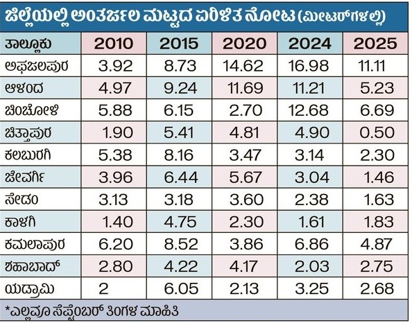 ಭರಪೂರ ಮಳೆಯ ಹೊರತಾಗಿಯೂ ಜಿಲ್ಲೆಯ ಕಾಳಗಿ ಹಾಗೂ ಶಹಾಬಾದ್ ತಾಲ್ಲೂಕುಗಳಲ್ಲಿ ಅಂತರ್ಜಲಮಟ್ಟ ಕುಸಿತ ಕಂಡಿದೆ. 2024ರ ಸೆಪ್ಟೆಂಬರ್ನಲ್ಲಿ ಕಾಳಗಿಯಲ್ಲಿ ಭೂಮಿಯ 1.61 ಮೀಟರ್ ಹಾಗೂ ಶಹಾಬಾದ್ನಲ್ಲಿ 2.03 ಮೀಟರ್ ಆಳದಲ್ಲಿ ಜೀವಜಲ ಸಿಗುತ್ತಿತ್ತು. 2025ರ ಸೆಪ್ಟೆಂಬರ್ನಲ್ಲಿ ಕಾಳಗಿಯಲ್ಲಿ ಅಂತರ್ಜಲಮಟ್ಟವು 1.61 ಮೀಟರ್ನಿಂದ 1.83 ಮೀಟರ್ಗೆ ಕುಸಿದಿದೆ. ಶಹಾಬಾದ್ನಲ್ಲಿ ಭೂ ಒಳಲಾಳದ ನೀರಿನಮಟ್ಟ 2.03 ಮೀಟರ್ನಿಂದ 2.75 ಮೀಟರ್ಗೆ ಕುಸಿದಿದೆ.