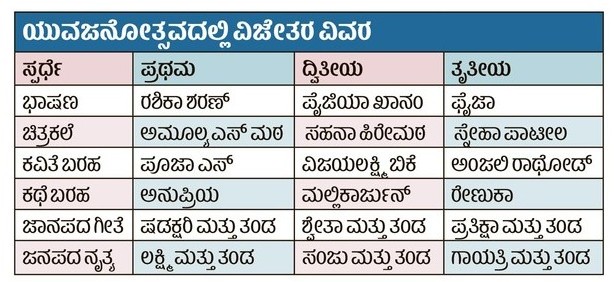 ಯುವಜನೋತ್ಸವದಲ್ಲಿ ಜನಪದ ನೃತ್ಯ(ತಂಡ) ಜನಪದ ಗೀತೆ(ತಂಡ) ಕಥೆ ಬರೆಯುವುದು ಚಿತ್ರಕಲೆ ಭಾಷಣ ಕವಿತೆ ಬರೆಯುವುದು ಸೇರಿದಂತೆ ಆರು ಸ್ಪರ್ಧೆಗಳನ್ನು ನಡೆಸಲಾಯಿತು. ಜನಪದ ನೃತ್ಯ ಮತ್ತು ಜನಪದ ಗೀತೆಯ ವಿಜೇತರಿಗೆ ಪ್ರಥಮ ₹10 ಸಾವಿರ ದ್ವಿತೀಯ ₹7 ಸಾವಿರ ತೃತೀಯ ₹5 ಸಾವಿರ ನಗದು ಬಹುಮಾನ ನೀಡಲಾಯಿತು. ಉಳಿದ ಸ್ಪರ್ಧೆಗಳ ವಿಜೇತರಿಗೆ ಪ್ರಥಮ ₹3 ಸಾವಿರ ದ್ವಿತೀಯ ₹ 2 ಸಾವಿರ ತೃತೀಯ ₹ 1 ಸಾವಿರ ಬಹುಮಾನ ನೀಡಲಾಯಿತು. ಪ್ರಥಮ ಸ್ಥಾನ ಪಡೆದವರನ್ನು ರಾಜ್ಯಮಟ್ಟಕ್ಕೆ ಆಯ್ಕೆ ಮಾಡಲಾಯಿತು.