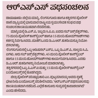<p><strong>ರಾಯಚೂರು:</strong> ಜಿಲ್ಲೆಯ ಮಾನ್ವಿ, ಲಿಂಗಸುಗೂರು ಹಾಗೂ ಶಕ್ತಿನಗರ ಪೊಲೀಸ್ ಠಾಣೆ ವ್ಯಾಪ್ತಿಯಲ್ಲಿ ಭಾನುವಾರ ರಾಷ್ತ್ರೀಯ ಸ್ವಯಂಸೇವಕ ಸಂಘದ ಪಥ ಸಂಚಲನ ಶಾಂತಿಯುತವಾಗಿ ನೆರವೇರಿತು.</p><p>ಮಾನ್ವಿಯಲ್ಲಿ ಡಿ.ಎಸ್.ಪಿ, ಇಬ್ಬರು ಸಿ.ಪಿ.ಐ, ಐವರು ಸಬ್ ಇನ್ಸ್ಪೆಕ್ಟರ್ಗಳು, 75 ಮಂದಿ ಪೊಲೀಸ್ ಕಾನ್ಸ್ಟೆಬಲ್ ಹಾಗೂ 15 ಮಂದಿ ಹೋಮ್ಗಾರ್ಡ್ಗಳು ಕರ್ತವ್ಯ ನಿರ್ವಹಿಸಿದರು. ಜೊತೆಗೆ ಒಂದು ಡಿ.ಎ.ಆರ್. ತುಕಡಿಯನ್ನೂ ನಿಯೋಜಿಸಲಾಗಿತ್ತು. ಲಿಂಗಸುಗೂರಿನಲ್ಲಿ ಒಬ್ಬ ಅಡಿಷನಲ್ ಎಸ್ಪಿ, ಒಬ್ಬ ಡಿ.ಎಸ್.ಪಿ, ನಾಲ್ವರು ಸಿ.ಪಿ.ಐಗಳು, ಆರು ಸಬ್ ಇನ್ಸ್ಪೆಕ್ಟರ್ಗಳು, 45 ಮಂದಿ ಪೊಲೀಸ್ ಕಾನ್ಸ್ಟೆಬಲ್ ಹಾಗೂ 15 ಮಂದಿ ಹೋಮ್ಗಾರ್ಡ್ಗಳು ಕಾರ್ಯನಿರ್ವಹಿಸಿದರು. ಎರಡು ಡಿ.ಎ.ಆರ್. ತುಕಡಿಗಳನ್ನು ನಿಯೋಜನೆ ಮಾಡಲಾಗಿತ್ತು. ಶಕ್ತಿನಗರದಲ್ಲಿ ಒಬ್ಬ ಪಿ.ಎಸ್.ಐ ಮತ್ತು 15 ಮಂದಿ ಪೊಲೀಸ್ ಕಾನ್ಸ್ಟೆಬಲ್ ಬಂದೋಬಸ್ತ್ನಲ್ಲಿ ತೊಡಗಿದ್ದರು.</p><p>ಜಿಲ್ಲಾ ಪೊಲೀಸ್ ವರಿಷ್ಠಾಧಿಕಾರಿ ಎಂ. ಪುಟ್ಟಮಾದಯ್ಯ ಅವರು ಸ್ಥಳಕ್ಕೆ ಭೇಟಿ ನೀಡಿ ಬಂದೋಬಸ್ತ್ ಪರಿಶೀಲಿಸಿದರು. ‘ಆರ್ಎಸ್ಎಸ್ ಪಥಸಂಚಲನವು ಶಾಂತಿಯುತವಾಗಿ ನಡೆದಿದೆ. ಎಲ್ಲೆಡೆ ಕಾನೂನು ಸುವ್ಯವಸ್ಥೆ ಕಾಪಾಡಲಾಗಿದೆ‘ ಎಂದು ಹೇಳಿದರು.</p>