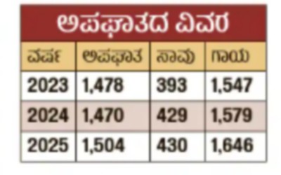 <p><strong>ರಾಮನಗರ:</strong> ಬೆಂಗಳೂರು ದಕ್ಷಿಣ ಜಿಲ್ಲೆಯಲ್ಲಿ ಕಳೆದೊಂದು ವರ್ಷದಲ್ಲಿ 1,504 ರಸ್ತೆ ಅಪಘಾತಗಳು ಸಂಭವಿಸಿವೆ. ಇವುಗಳಲ್ಲಿ ಬರೋಬ್ಬರಿ 430 ಮಂದಿ ಜೀವ ಕಳೆದುಕೊಂಡಿದ್ದಾರೆ. ಸುಮಾರು 1,646 ಪ್ರಯಾಣಿಕರು ಗಾಯಗೊಂಡಿದ್ದಾರೆ. ಜಿಲ್ಲೆಯಲ್ಲಿ ಕಳೆದ ಮೂರು ವರ್ಷಗಳಿಂದ ಅಪಘಾತ ಪ್ರಕರಣಗಳು ವರ್ಷದಿಂದ ವರ್ಷಕ್ಕೆ ತುಸು ಏರಿಕೆಯಾಗುತ್ತಲೇ ಇದೆ.</p>.<p>ಒಂದು ವರ್ಷದಲ್ಲಿ ಸಂಭವಿಸಿರುವ 1,504 ಅಪಘಾತಗಳಲ್ಲಿ 403 ಮಾರಣಾಂತಿಕ ಅಪಘಾತ ಪ್ರಕರಣಗಳಾದ್ದು, ಇವುಗಳಲ್ಲಿ 430 ಪ್ರಯಾಣಿಕರು ಕೊನೆಯುಸಿರೆಳೆದಿದ್ದು, 192 ಮಂದಿ ಗಾಯಗೊಂಡಿದ್ದಾರೆ. ಮಾರಣಾಂತಿಕವಲ್ಲದ 1,101 ಅಪಘಾತಗಳಲ್ಲಿ 1,454 ಮಂದಿಗೆ ಗಾಯಗಳಾಗಿವೆ.</p>.<p><strong>ಸಾವು–ನೋವು ಏರಿಕೆ:</strong> ಜಿಲ್ಲೆಯಲ್ಲಿ ಸುಮಾರು 55 ಕಿ.ಮೀ. ಹಾದು ಹೋಗಿರುವ ಬೆಂಗಳೂರು–ಮೈಸೂರು ನಡುವಣ ರಾಷ್ಟ್ರೀಯ ಹೆದ್ದಾರಿ–275 ವಾಹನಗಳ ಸಂಚಾರಕ್ಕೆ ಮುಕ್ತವಾದಾಗಿನಿಂದ, ಜಿಲ್ಲೆಯಲ್ಲಿ ಅಪಘಾತಗಳ ಸಂಖ್ಯೆ ಹೆಚ್ಚಾಗಿದೆ. ಈ ಅಪಘಾತಗಳಿಂದಾಗಿ ಸಾವಿನ ಮನೆ ಸೇರುವವರ ಜೊತೆಗೆ ಗಾಯಾಳುಗಳ ಸಂಖ್ಯೆಯಲ್ಲೂ ಹೆಚ್ಚಳವಾಗುತ್ತಿದೆ.</p>.<p>2023ರಲ್ಲಿ ಸಂಭವಿಸಿದ್ದ 356 ಮಾರಣಾಂತಿಕ ಅಪಘಾತಗಳಲ್ಲಿ 393 ಮಂದಿ ಜೀವ ಕಳೆದುಕೊಂಡು 143 ಜನ ಗಾಯಗೊಂಡಿದ್ದರು. 2024ರಲ್ಲಿ ಅಪಘಾತಗಳ ಸಂಖ್ಯೆ 397ಕ್ಕೆ ಏರಿಕೆಯಾಗಿ ಮೃತರ ಸಂಖ್ಯೆ 429ಕ್ಕೆ ಹಾಗೂ ಗಾಯಾಳುಗಳ ಸಂಖ್ಯೆ 182ಕ್ಕೆ ಹೆಚ್ಚಳವಾಯಿತು. 2005ರಲ್ಲಿ ಸಂಭವಿಸಿದ 403 ಮಾರಣಾಂತಿಕ ಅಪಘಾತ ಪ್ರಕರಣಗಳಲ್ಲಿ 430 ಮಂದಿ ಜೀವ ಕಳೆದುಕೊಂಡು 192 ಮಂದಿ ಗಾಯಗೊಂಡಿದ್ದಾರೆ.</p>.<p>ಮಾರಣಾಂತಿಕವಲ್ಲದ ಅಪಘಾತಗಳು ಮತ್ತು ಗಾಯಾಳುಗಳ ಸಂಖ್ಯೆಯೂ ಕಳೆದ 3 ವರ್ಷದಲ್ಲಿ ಏರಿಕೆಯಾಗಿದೆ. 2023ರಲ್ಲಿ ಸಂಭವಿಸಿದ 1,122 ಅಪಘಾತಗಳಲ್ಲಿ 1,404 ಮಂದಿ ಗಾಯಗೊಂಡಿದ್ದರು. ನಂತರ 2024ರಲ್ಲಿ 1,073 ಪ್ರಕರಣಗಳಲ್ಲಿ 1,397 ಹಾಗೂ 2025ರಲ್ಲಿ 1101 ಅಪಘಾತಗಳಲ್ಲಿ 1,454 ಜನರಿಗೆ ಗಾಯಗಳಾಗಿವೆ ಎಂದು ಪೊಲೀಸ್ ಮೂಲಗಳು ತಿಳಿಸಿವೆ.</p>.<p>ಮಾರಣಾಂತಿಕ ಅಪಘಾತ ಪ್ರಕರಣಗಳಲ್ಲಿನ ಸಾವು–ನೋವಿನಲ್ಲಿ 2024 ಮತ್ತು 2025ರ ನಡುವಣ ವ್ಯತ್ಯಾಸ ಕೇವಲ 10ರ ಆಸುಪಾಸಿನಲ್ಲಿರುವುದು ಸಮಾಧಾನಕರ ಸಂಗತಿ. ಅಪಘಾತಗಳ ತಡೆಗೆ ಹಾಗೂ ಸಂಚಾರ ನಿಯಮಗಳ ಕಟ್ಟುನಿಟ್ಟಿನ ಪಾಲನೆ ಕುರಿತು ಬೆಂಗಳೂರು–ಮೈಸೂರು ರಾಷ್ಟ್ರೀಯ ಹೆದ್ದಾರಿ ಸೇರಿದಂತೆ ಜಿಲ್ಲೆಯಾದ್ಯಂತ ಇಲಾಖೆ ಕ್ರಮ ಕೈಗೊಳ್ಳುತ್ತಿದೆ. ಮುಂದಿನ ದಿನಗಳಲ್ಲಿ ಅಪಘಾತಗಳ ಸಂಖ್ಯೆ ಮತ್ತಷ್ಟು ಇಳಿಕೆಯಾಗಲಿದೆ ಎಂದು ಪೊಲೀಸರು ವಿಶ್ವಾಸ ವ್ಯಕ್ತಪಡಿಸಿದರು.</p>.<p><strong>₹1.16 ಲಕ್ಷ ಪ್ರಕರಣ; ₹5.82 ಕೋಟಿ ದಂಡ</strong> </p><p>ಜಿಲ್ಲೆಯಾದ್ಯಂತ 2025ರಲ್ಲಿ 116905 ಐಎಂವಿ (ಮೋಟಾರು ವಾಹನಗಳ ಕಾಯ್ದೆ) ಪ್ರಕರಣಗಳು ದಾಖಲಾಗಿವೆ. ಮದ್ಯಪಾನ ಮಾಡಿ ಚಾಲನೆ ಅತಿ ವೇಗ ಸಿಗ್ನಲ್ ಜಂಪ್ ವಾಹನಕ್ಕೆ ವಿಮೆ ಇಲ್ಲದಿರುವುದು ವಾಣಿಜ್ಯ ವಾಹನಗಳು ಸಮವಸ್ತ್ರ ಧರಿಸದಿರುವುದು ಹೆಚ್ಚುವರಿ ಪ್ರಯಾಣಿಕರು ಪೊಲೀಸರೊಂದಿಗೆ ಅಸಭ್ಯ ವರ್ತನೆ ಎಡಭಾಗದಲ್ಲಿ ಓವರ್ಟೇಕ್ ಚಾಲನೆ ವೇಳೆ ಮೊಬೈಲ್ ಬಳಕೆ ಸೀಟ್ ಬೆಲ್ಟ್ ಧರಿಸದಿರುವುದು ಹೆಲ್ಮೆಟ್ ಧರಿಸದಿರುವುದು ಸೇರಿದಂತೆ ವಿವಿಧ ಅಪಘಾತ ಪ್ರಕರಣಗಳಲ್ಲಿ ಸ್ಥಳದಲ್ಲೇ ವಿಧಿಸಿದ ದಂಡದ ಮೊತ್ತ ಒಟ್ಟು ₹5.82 ಕೋಟಿ ಆಗಿದೆ ಎಂದು ಪೊಲೀಸರು ತಿಳಿಸಿದರು.</p>.<div><p><strong>ಪ್ರಜಾವಾಣಿ ಆ್ಯಪ್ ಇಲ್ಲಿದೆ: <a href="https://play.google.com/store/apps/details?id=com.tpml.pv">ಆಂಡ್ರಾಯ್ಡ್ </a>| <a href="https://apps.apple.com/in/app/prajavani-kannada-news-app/id1535764933">ಐಒಎಸ್</a> | <a href="https://whatsapp.com/channel/0029Va94OfB1dAw2Z4q5mK40">ವಾಟ್ಸ್ಆ್ಯಪ್</a>, <a href="h