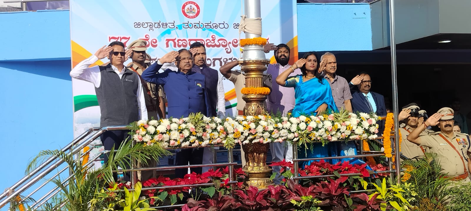 <p><strong>ತುಮಕೂರು</strong>: ನಗರದ ಜಿಲ್ಲಾ ಕ್ರೀಡಾಂಗಣದಲ್ಲಿ ಸೋಮವಾರ ಗಣರಾಜ್ಯೋತ್ಸವ ಪ್ರಯುಕ್ತ ಜಿಲ್ಲಾ ಉಸ್ತುವಾರಿ ಸಚಿವ ಜಿ.ಪರಮೇಶ್ವರ ಧ್ವಜಾರೋಹಣ ನೆರವೇರಿಸಿದರು. ಪಥ ಸಂಚಲನದಲ್ಲಿ ಭಾಗವಹಿಸಿದ ಅಂಗವಿಕಲರ ತಂಡ ಗಮನ ಸೆಳೆಯಿತು.</p><p>ಶಾಲಾ-ಕಾಲೇಜಿನ ವಿದ್ಯಾರ್ಥಿಗಳು, ಸಾರ್ವಜನಿಕರು ಧ್ವಜಾರೋಹಣಕ್ಕೆ ಸಾಕ್ಷಿಯಾದರು. ಸಚಿವರು</p><p>ಧ್ವಜಾರೋಹಣದ ನಂತರ ತೆರೆದ ವಾಹನದಲ್ಲಿ ತೆರಳಿ ತುಕಡಿಗಳ ಪರಿವೀಕ್ಷಣೆ ನಡೆಸಿದರು. </p><p>ಶಾಸಕರಾದ ಬಿ.ಸುರೇಶ್ ಗೌಡ, ಜಿ.ಬಿ.ಜ್ಯೋತಿಗಣೇಶ್, ವಿಧಾನ ಪರಿಷತ್ತಿನ ಸದಸ್ಯ ಆರ್.ರಾಜೇಂದ್ರ,</p><p>ಜಿಲ್ಲಾಧಿಕಾರಿ ಶುಭ ಕಲ್ಯಾಣ್, ಜಿಲ್ಲಾ ಪೊಲೀಸ್ ವರಿಷ್ಠಾಧಿಕಾರಿ ಕೆ.ವಿ.ಅಶೋಕ್ ಮೊದಲಾದವರು ಪಾಲ್ಗೊಂಡಿದ್ದರು.</p>.<div><p><strong>ಪ್ರಜಾವಾಣಿ ಆ್ಯಪ್ ಇಲ್ಲಿದೆ: <a href="https://play.google.com/store/apps/details?id=com.tpml.pv">ಆಂಡ್ರಾಯ್ಡ್ </a>| <a href="https://apps.apple.com/in/app/prajavani-kannada-news-app/id1535764933">ಐಒಎಸ್</a> | <a href="https://whatsapp.com/channel/0029Va94OfB1dAw2Z4q5mK40">ವಾಟ್ಸ್ಆ್ಯಪ್</a>, <a href="https://www.twitter.com/prajavani">ಎಕ್ಸ್</a>, <a href="https://www.fb.com/prajavani.net">ಫೇಸ್ಬುಕ್</a> ಮತ್ತು <a href="https://www.instagram.com/prajavani">ಇನ್ಸ್ಟಾಗ್ರಾಂ</a>ನಲ್ಲಿ ಪ್ರಜಾವಾಣಿ ಫಾಲೋ ಮಾಡಿ.</strong></p></div>