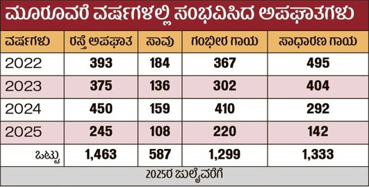 <p><strong>ಯಾದಗಿರಿ:</strong> ಜಿಲ್ಲೆಯ ವಿವಿಧೆಡೆ ಮೂರೂವರೆ ವರ್ಷಗಳಲ್ಲಿ ಸಂಭವಿಸಿದ ರಸ್ತೆ ಅಪಘಾತಗಳಲ್ಲಿ ಬರೋಬ್ಬರಿ 587 ಮಂದಿ ಜೀವ ಕಳೆದುಕೊಂಡಿದ್ದಾರೆ. 2,632 ಮಂದಿ ಗಾಯಗೊಂಡಿದ್ದು, ಕೆಲವರು ಅಂಗಾಂಗಗಳನ್ನು ಕಳೆದುಕೊಂಡು ಯಾತನಮಯ ಜೀವನ ಸಾಗಿಸುತ್ತಿದ್ದಾರೆ.</p>.<p>ಯಾದಗಿರಿ ಜಿಲ್ಲೆಯು ಕಲಬುರಗಿ, ವಿಜಯಪುರ ಮತ್ತು ರಾಯಚೂರು ಜಿಲ್ಲೆಗಳು ಹಾಗೂ ನೆರೆಯ ತೆಲಂಗಾಣ ರಾಜ್ಯ, ಗಡಿ ಹಂಚಿಕೊಂಡಿದೆ. ಗ್ರಾಮೀಣ ರಸ್ತೆಗಳು, ಜಿಲ್ಲಾಮುಖ್ಯ ರಸ್ತೆಗಳು, ರಾಜ್ಯ ಹಾಗೂ ರಾಷ್ಟ್ರೀಯ ಹೆದ್ದಾರಿಗಳು ಹಾದುಹೋಗಿವೆ. ಪ್ರತಿ ವರ್ಷ ನೂರಾರು ಅಪಘಾತಗಳು ಸಂಭವಿಸಿ ನೂರಾರು ಮಂದಿ ಬಲಿಯಾಗುತ್ತಿದ್ದಾರೆ. ಕೈ, ಕಾಲುಗಳನ್ನು ಕಳೆದುಕೊಂಡು ಅಂಗವಿಕಲರೂ ಆಗುತ್ತಿದ್ದಾರೆ.</p>.<p>2022ರಿಂದ 2025ರ ಜುಲೈ ತಿಂಗಳ ನಡುವೆ ಜಿಲ್ಲೆಯ ರಸ್ತೆಗಳಲ್ಲಿ ಒಟ್ಟು 1,463 ಅಪಘಾತಗಳು ಸಂಭವಿಸಿವೆ. ಅವುಗಳಲ್ಲಿ 587 ಮಂದಿ ಪ್ರಾಣ ಕಳೆದುಕೊಂಡಿದ್ದರೆ 1,299 ಮಂದಿಗೆ ಗಂಭೀರ ಗಾಯ ಹಾಗೂ 1,333 ಮಂದಿಗೆ ಸಾಧಾರಣ ಗಾಯಗಳಾಗಿವೆ.</p>.<p>2022ರಲ್ಲಿನ 393 ಅಪಘಾತಗಳ ಪ್ರಕರಣಗಳಿಂದ 184 ಮೃತಪಟ್ಟಿದ್ದಾರೆ. 367 ಮಂದಿ ಗಂಭೀರವಾಗಿ ಗಾಯಗೊಂಡಿದ್ದರೆ, 495 ಮಂದಿಗೆ ಸಾಧಾರಣ ಗಾಯಗಳಾಗಿವೆ. 2023ರಲ್ಲಿ 375 ಅಪಘಾತ ಪ್ರಕರಣಗಳಾಗಿ 136 ಮಂದಿ ಅಸುನೀಗಿದ್ದು, ಈ ಹಿಂದಿನ ವರ್ಷಕ್ಕೆ ಹೋಲಿಕೆ ಮಾಡಿದರೆ ಪ್ರಕರಣಗಳ ಸಂಖ್ಯೆ ಇಳಿಕೆಯಾಗಿದ್ದವು. ಅದರ ಮರು ವರ್ಷವೇ ಅಪಘಾತಗಳ ಸಂಖ್ಯೆ 450ಕ್ಕೆ ಏರಿಕೆಯಾಗಿ 159 ಮಂದಿ ಪ್ರಾಣ ಕಳೆದುಕೊಂಡಿದ್ದಾರೆ.</p>.<p>2025ರ ಜನವರಿ ತಿಂಗಳಿಂದ ಜುಲೈ ನಡುವಿನ ಆರು ತಿಂಗಳಲ್ಲಿ 245 ಅಪಘಾತ ಪ್ರಕರಣಗಳು ದಾಖಲಾಗಿವೆ. ಅವುಗಳಿಂದ 108 ಮಂದಿ ಜೀವ ಕಳೆದುಕೊಂಡಿದ್ದು, ಗಂಭೀರ ಹಾಗೂ ಸಾಧಾರಣ ಗಾಯಗಳಿಂದ 362 ಮಂದಿ ಸಂಕಷ್ಟ ಅನುಭವಿಸಿದ್ದಾರೆ ಎಂಬುದು ಅಂಕಿಅಂಶಗಳಿಂದ ಗೊತ್ತಾಗಿದೆ.</p>.<p>ಸಂಚಾರ ನಿಯಮಗಳನ್ನು ಪಾಲನೆ ಮಾಡದೆ ವಾಹನಗಳ ಚಾಲನೆ, ಮದ್ಯಪಾನ ಮಾಡಿ ನಿರ್ಲಕ್ಷ್ಯದ ಚಾಲನೆ, ಮೊಬೈಲ್ನಲ್ಲಿ ಮಾತನಾಡುತ್ತಾ ವಾಹನ ಚಾಲನೆ, ರಸ್ತೆ, ಹೆದ್ದಾರಿಗಳಲ್ಲಿ ಸೂಕ್ತ ಸರ್ವೀಸ್ ರಸ್ತೆಗಳು ಇಲ್ಲದಿರುವುದು, ಅಲ್ಲಲ್ಲಿ ಸೂಚನಾ ಫಲಕಗಳು ಇಲ್ಲದಿರುವುದು, ಗುಂಡಿ ಬಿದ್ದ ರಸ್ತೆಗಳು... ಹೀಗೆ ನಾನಾ ಕಾರಣಗಳಿಂದ ಅಪಘಾತಗಳು ಸಂಭವಿಸುತ್ತಿವೆ. ಪ್ರಯಾಣಿಕರು ಸಹ ಉಸಿರು ಚೆಲ್ಲುತ್ತಿದ್ದಾರೆ.</p>.<p>ರಸ್ತೆಯ ಬದಿಯಲ್ಲಿ ತಮ್ಮಪಾಡಿಗೆ ತಾವು ನಡೆದುಕೊಂಡು ಹೋಗುವ ಪಾದಚಾರಿಗಳು ಸಹ ವಾಹನಗಳಿಗೆ ಸಿಲುಕಿ ಸಾಯುವ ಪ್ರಕರಣಗಳು, ಜಾನುವಾರು, ನಾಯಿಗಳು ಅಡ್ಡ ಬಂದು ಬಿದ್ದು ಬೈಕ್ ಸವಾರರು ಮೃತರಾಗುವ ಪ್ರಕರಣಗಳು ಸಹ ನಿಲ್ಲುತ್ತಿಲ್ಲ. ರಸ್ತೆಯ ನಿಯಮಗಳ ಪಾಲನೆಯೂ ಆಗುತ್ತಿಲ್ಲ ಎಂಬುದು ಸಾರ್ವಜನಿಕರ ಬೇಸರ.</p>.<div><blockquote>ಸಂಚಾರ ನಿಯಮ ಉಲ್ಲಂಘಿಸುವವರಿಗೆ ಆನ್ಲೈನ್ ಮೂಲಕ ದಂಡ ಹಾಕಲಾಗುತ್ತಿದೆ. ಹೆಲ್ಮೆಟ್ ಧರಿಸಿಕೊಂಡು ಬೈಕ್ ಓಡಿಸುವುದಕ್ಕೆ ಸವಾರರು ಮುಂದಾಗಬೇಕು </blockquote><span class="attribution">ಪೃಥ್ವಿಕ್ ಶಂಕರ್ ಜಿಲ್ಲಾ ಪೊಲೀಸ್ ವರಿಷ್ಠಾಧಿಕಾರಿ</span></div>.<p><strong>ಚಾಲಕರ ಸ್ವಯಂಕೃತ ಅಪರಾಧ ಅಮಾಯಕರೂ ಸಾವು!</strong> </p><p>ವಾಹನ ಚಾಲಕರ ಸ್ವಯಂಕೃತ ತಪ್ಪಿನಿಂದಾಗಿ ತಮ್ಮ ಜೀವ ಕಳೆದುಕೊಳ್ಳುವುದು ಮಾತ್ರವಲ್ಲ ರಸ್ತೆ ಬದಿಯ ಅಮಾಯಕರ ಪ್ರಾಣಕ್ಕೂ ಎರವಾಗುತ್ತಿರುವ ಅಪಘಾತಗಳೂ ಪದೇ ಪದೇ ಸಂಭವಿಸುತ್ತಿವೆ. ಅಬ್ಬೆತುಮಕೂರ ಕ್ರಾಸ್ ಸಮೀಪ ಯಾದಗಿರಿ– ವಾಡಿ ರಸ್ತೆ ಬದಿಯಲ್ಲಿ ನಿಂತಿದ್ದ ಬಸಯ್ಯಸ್ವಾಮಿ ಮಸೂತಿಮಠ; ಸುರಪುರ ತಾಲ್ಲೂಕಿನ ಬಿಜಾಸಪುರ ಗ