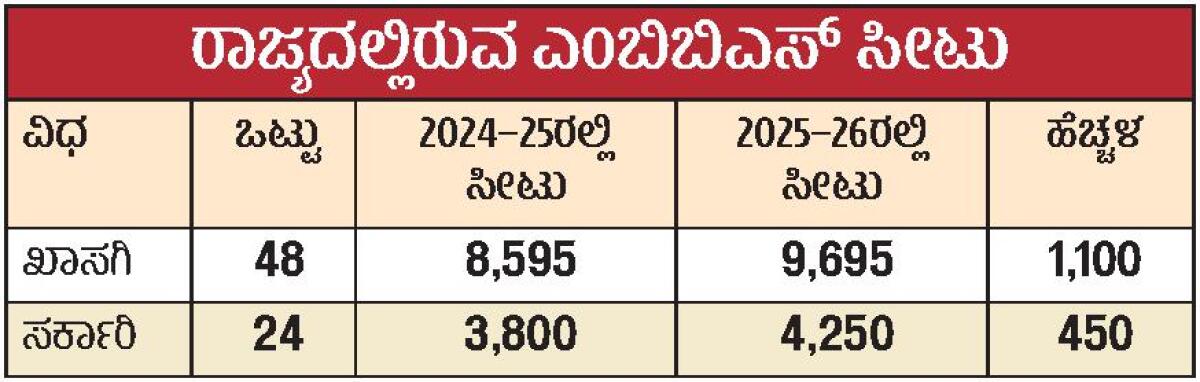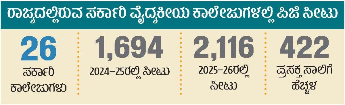 ಕರ್ನಾಟಕ ಪರೀಕ್ಷಾ ಪ್ರಾಧಿಕಾರದ (ಕೆಇಎ) ವತಿಯಿಂದ ವೈದ್ಯಕೀಯ ಸೀಟುಗಳ ಹಂಚಿಕೆ ಕ್ರಮಬದ್ಧವಾಗಿ ನಡೆಯುತ್ತದೆ. ಪ್ರಸಕ್ತ ಸಾಲಿನ ಸ್ನಾತಕೋತ್ತರ ವೈದ್ಯಕೀಯ ಕೋರ್ಸ್ಗಳ ಪ್ರವೇಶಕ್ಕೆ ಸಂಬಂಧಿಸಿದಂತೆ 4007 ಸೀಟುಗಳು ಹಂಚಿಕೆಗೆ ಲಭ್ಯವಾಗಿವೆ. ಬೆಂಗಳೂರಿನ ಎಂವಿಜೆ ಕಲಬುರಗಿಯ ಮಹದೇವಪ್ಪ ರಾಂಪುರೆ ದಕ್ಷಿಣ ಕನ್ನಡ ಜಿಲ್ಲೆಯ ಕೆ. ವೆಂಕಟರಮಣ ಗೌಡ ಮತ್ತು ಮಂಗಳೂರಿನ ಶ್ರೀನಿವಾಸ ವೈದ್ಯಕೀಯ ಕಾಲೇಜುಗಳಿಗೆ ತಲಾ 50 ಸೀಟುಗಳನ್ನು ರಾಷ್ಟ್ರೀಯ ವೈದ್ಯಕೀಯ ಆಯೋಗ ಹೆಚ್ಚುವರಿಯಾಗಿ ಮಂಜೂರು ಮಾಡಿದೆ. ಮೂರನೇ ಸುತ್ತಿನ ಸೀಟು ಹಂಚಿಕೆ ಪ್ರಕ್ರಿಯೆ ಆರಂಭವಾದ ನಂತರ ಒಟ್ಟು ಒಂಬತ್ತು ಕಾಲೇಜುಗಳ 450 ಸೀಟುಗಳು ಹೆಚ್ಚುವರಿಯಾಗಿ ಲಭ್ಯವಾಗಿವೆ.