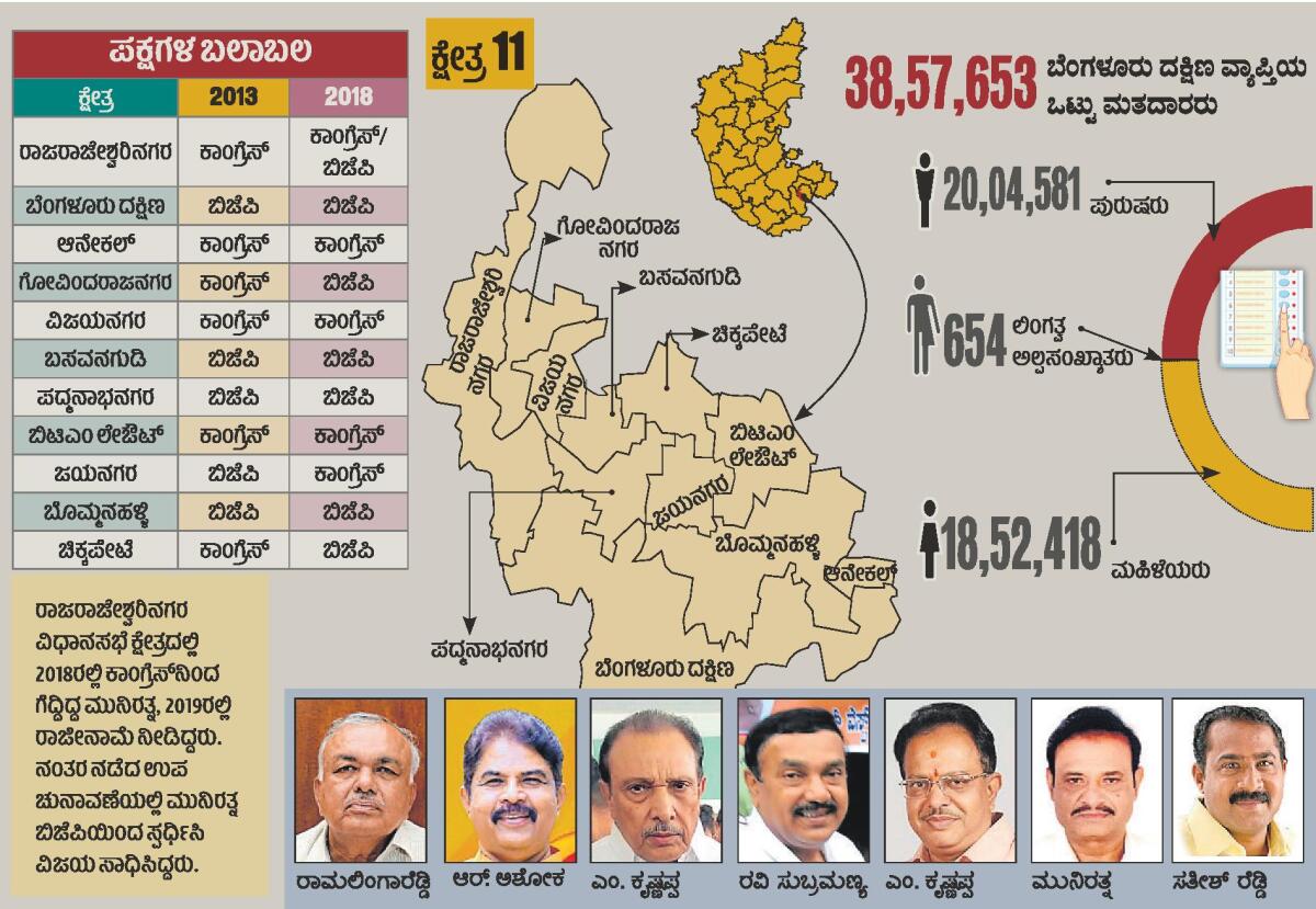 <p><strong>ಬೆಂಗಳೂರು:</strong> ಪಕ್ಷಗಳ ಸಿದ್ಧಾಂತಕ್ಕಿಂತ ಅಭ್ಯರ್ಥಿಗಳ ವೈಯಕ್ತಿಕ ವರ್ಚಸ್ಸೇ ಅತ್ಯಂತ ಪ್ರಮುಖವಾಗಿರುವ ಬೆಂಗಳೂರು ದಕ್ಷಿಣ ಭಾಗದ ವ್ಯಾಪ್ತಿಯಲ್ಲಿ ಗೆದ್ದ ವ್ಯಕ್ತಿಯ ‘ಅಭಿವೃದ್ಧಿ ಸಾಧನೆ’ ಇಲ್ಲಿ ಮಣೆ. ಹೀಗಾಗಿಯೇ ಇಲ್ಲಿ ಹ್ಯಾಟ್ರಿಕ್ ವೀರರೇ ಅಧಿಕ. ಈ ವ್ಯಾಪ್ತಿಯ 11 ಕ್ಷೇತ್ರಗಳಲ್ಲಿ ಏಳು ಮಂದಿ ಸತತವಾಗಿ ಮೂರು ಬಾರಿ ವಿಜಯ ಸಾಧಿಸಿ ನಾಲ್ಕನೇ ಬಾರಿ ವಿಧಾನಸಭೆ ಮೆಟ್ಟಿಲೇರಲು ಅಣಿಯಾಗಿದ್ದಾರೆ. ಇನ್ನುಳಿದ ನಾಲ್ಕು ಕ್ಷೇತ್ರದಲ್ಲಿ ಗೆಲುವಿನ ಸಾಧನೆಯನ್ನು ಮರು ಸ್ಥಾಪಿಸಲು ಸೆಣಸಾಟ ನಡೆಸಿದ್ದಾರೆ.</p>.<p>ಕಾಂಗ್ರೆಸ್ನ ರಾಮಲಿಂಗಾರೆಡ್ಡಿ, ಎಂ. ಕೃಷ್ಣಪ್ಪ, ಬಿಜೆಪಿಯ ಆರ್. ಅಶೋಕ, ರವಿ ಸುಬ್ರಮಣ್ಯ, ಸತೀಶ್ ರೆಡ್ಡಿ, ಎಂ.ಕೃಷ್ಣಪ್ಪ, ಮುನಿರತ್ನ ಅವರು ಹ್ಯಾಟ್ರಿಕ್ ಜಯ ಪಡೆದಿದ್ದು, ಆಯಾ ಕ್ಷೇತ್ರದಲ್ಲಿ ಮತ್ತೆ ಕಣದಲ್ಲಿದ್ದಾರೆ. ಅವರಿಗೆ ಪೈಪೋಟಿ ನೀಡಲು, ಹೊಸ ಮುಖಗಳು ಕಣಕ್ಕೆ ಬಂದಿರುವುದು ಗಮನಾರ್ಹ.</p>.<p>ಬೆಂಗಳೂರು ನಗರದಲ್ಲಿ ಪಕ್ಷಗಳ ಬೆಂಬಲ ಒಂದು ತೂಕವಾದರೆ, ವೈಯಕ್ತಿಕ ವರ್ಚಸ್ಸು ಮತ್ತೊಂದು ತೂಕ. ಒಂದು ಹಂತದಲ್ಲಿ ಕಾಂಗ್ರೆಸ್ ಅಥವಾ ಬಿಜೆಪಿಯ ಕೆಲವು ಅಭ್ಯರ್ಥಿಗಳಿಗೆ ವೈಯಕ್ತಿಕ ವರ್ಚಸ್ಸು ಹಾಗೂ ಕ್ಷೇತ್ರದ ಮತದಾರರೊಂದಿಗಿನ ಒಡನಾಟವೇ ಬಂಡವಾಳ. ಹೀಗಾಗಿ, ಸತತವಾಗಿ ತಮ್ಮ ಗೆಲುವಿನ ನಗೆ ಬೀರಲು ಸಾಧ್ಯವಾಗಿದೆ.</p>.<p>ಯಾವುದೇ ಪಕ್ಷ ಅಧಿಕಾರಕ್ಕೆ ಬಂದರೂ ಬೆಂಗಳೂರಿನಲ್ಲಿ ವಿಜಯ ಸಾಧಿಸುವ ಶಾಸಕರಲ್ಲಿ ನಾಲ್ಕಾರು ಮಂದಿ ಸಚಿವರಾಗುವ ಪರಂಪರೆ ಹಿಂದಿನಿಂದಲೂ ನಡೆದುಬಂದಿದೆ. ರಾಜಧಾನಿಯ ಅಭಿವೃದ್ಧಿಯ ಜೊತೆಗೆ ಪ್ರಮುಖ ಖಾತೆಗಳನ್ನೂ ಇಲ್ಲಿನ ಶಾಸಕರು ಹೊಂದಿದ್ದಾರೆ. ಹೀಗಾಗಿಯೇ ಇಲ್ಲಿ ಜಯಕ್ಕಾಗಿ ಹಂಬಲಿಸುವ ಮನಗಳು ಅತಿಹೆಚ್ಚು. ಆದರೆ, ಪ್ರಭಾವಳಿ ಬೆಳೆಸಿಕೊಳ್ಳದ, ಜನರಿಗೆ ಸಿಗದವರನ್ನು ಜನರು ಎಂದಿಗೂ ಒಪ್ಪಿಕೊಂಡಿಲ್ಲ ಎಂಬುದು ಅಷ್ಟೇ ಸತ್ಯ. </p>.<p>ಬೆಂಗಳೂರು ದಕ್ಷಿಣ ಲೋಕಸಭೆ ಕ್ಷೇತ್ರದಲ್ಲಿ ಎಚ್.ಎನ್. ಅನಂತಕುಮಾರ್ ಕಾಲದಿಂದಲೂ ಬಿಜೆಪಿ ಜಯ ಗಳಿಸುತ್ತಲೇ ಬಂದಿದೆ. ಕಾಂಗ್ರೆಸ್ನ ಎಂ.ಕೃಷ್ಣಪ್ಪ, ಕೃಷ್ಣ ಬೈರೇಗೌಡ, ಬಿ.ಕೆ. ಹರಿಪ್ರಸಾದ್ ಅವರೂ ಇಲ್ಲಿ ಗೆಲುವು ಕಾಣಲಿಲ್ಲ. ಆದರೆ, ಇಲ್ಲಿನ ವಿಧಾನಸಭೆ ಕ್ಷೇತ್ರಗಳ ಚಿತ್ರಣ ವಿಭಿನ್ನ.</p>.<p>ಬಿಟಿಎಂ ಲೇಔಟ್ನಲ್ಲಿ ರಾಮಲಿಂಗಾರೆಡ್ಡಿ ಅವರು ಕಾಂಗ್ರೆಸ್ನಿಂದ ಮೂರು ಬಾರಿ ಗೆದ್ದಿದ್ದಾರೆ. ಅದಕ್ಕೂ ಮೊದಲು ಜಯನಗರದಿಂದ ನಾಲ್ಕು ಬಾರಿ ಗೆದ್ದಿದ್ದ ಅವರಿಗೆ ಕ್ಷೇತ್ರ, ಮತದಾರರು ಚಿರಪರಿಚಿತ. ಬಿಜೆಪಿ ಹಾಗೂ ಜೆಡಿಎಸ್ ಪ್ರತಿಬಾರಿಯೂ ಇಲ್ಲಿ ಅಭ್ಯರ್ಥಿಯನ್ನು ಬದಲಿಸುತ್ತಿವೆ. ಇದು ಕಾಂಗ್ರೆಸ್ಗೆ ಭದ್ರನೆಲೆಗೆ ಕಾರಣವಾಗಿದೆ. ಇನ್ನು ವಿಜಯನಗರದಲ್ಲೂ ಎಂ. ಕೃಷ್ಣಪ್ಪ ಅವರು ಕಾಂಗ್ರೆಸ್ನ ಭದ್ರಕೋಟೆ ಕಟ್ಟಿದ್ದಾರೆ. ಒಂದು ಕಾಲದ ಸ್ನೇಹಿತ ವಿ. ಸೋಮಣ್ಣ ಅವರನ್ನೂ ಕೃಷ್ಣಪ್ಪ ಮಣಿಸಿದ್ದರು. ಕಳೆದ ಬಾರಿ ಬಿಜೆಪಿಯಿಂದ ಎಚ್. ರವೀಂದ್ರ ಅತ್ಯಲ್ಪ ಮತದಿಂದ ಸೋತಿದ್ದರು. ಈ ಬಾರಿಯೂ ಕೃಷ್ಣಪ್ಪ ಅವರಿಗೆ ರವೀಂದ್ರ ಎದುರಾಳಿಯಾಗಿದ್ದು ತೀವ್ರ ಸ್ಪರ್ಧೆಯಿದೆ.</p>.<p>ಪದ್ಮನಾಭನಗರದಲ್ಲಿ ಬಿಜೆಪಿ ಆರ್. ಅಶೋಕ, ಈ ಬಾರಿ ಕನಕಪುರದಲ್ಲಿ ಕಾಂಗ್ರೆಸ್ ಅಧ್ಯಕ್ಷ ಡಿ.ಕೆ. ಶಿವಕುಮಾರ್ ವಿರುದ್ಧವೂ ಸ್ಪರ್ಧಿಸಿದ್ದು, ಪದ್ಮನಾಭನಗರವನ್ನೂ ಉಳಿಸಿಕೊಳ್ಳುವ ಕಾತುರದಲ್ಲಿದ್ದಾರೆ. ಉತ್ತರಹಳ್ಳಿಯಂತಹ ಬೃಹತ್ ಕ್ಷೇತ್ರದಲ್ಲಿ ಮೂರು ಬಾರಿ ಗೆಲುವು ಸಾಧಿಸಿದ್ದ ಅಶೋಕ