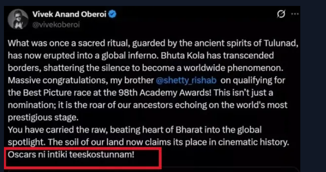<p><strong>ಬೆಂಗಳೂರು</strong>: ರಿಷಬ್ ಶೆಟ್ಟಿ ನಟಿಸಿ, ನಿರ್ದೇಶಿಸಿರುವ 'ಕಾಂತಾರ ಅಧ್ಯಾಯ 1' ಸಿನಿಮಾ ಆಸ್ಕರ್ ಅಂಗಳಕ್ಕೆ ಕಾಲಿಟ್ಟಿದೆ. ಈ ಬಗ್ಗೆ ಸಿನಿಮಾ ಕ್ಷೇತ್ರದವರೂ ಸೇರಿದಂತೆ ಗಣ್ಯರು ಮೆಚ್ಚುಗೆ ವ್ಯಕ್ತಪಡಿಸಿದ್ದರು.</p><p>'ಕಾಂತಾರ ಅಧ್ಯಾಯ 1' ಅಕ್ಟೋಬರ್ 2ರಂದು ಬಿಡುಗಡೆಯಾಗಿ ದೇಶದಾದ್ಯಂತ 7 ಸಾವಿರಕ್ಕೂ ಅಧಿಕ ಪರದೆಗಳಲ್ಲಿ ತೆರೆಕಂಡು ಯಶಸ್ವಿ ಪ್ರದರ್ಶನಗೊಂಡಿತ್ತು. ಇದೀಗ ಈ ಸಿನಿಮಾ ಆಸ್ಕರ್ ಅಂಗಳಕ್ಕೆ ಕಾಲಿಟ್ಟಿದೆ. ಜೊತೆಗೆ ‘ಅತ್ಯುತ್ತಮ ಚಿತ್ರ’ ಸ್ಪರ್ಧೆಯ ರೇಸ್ಗೆ ಪ್ರವೇಶ ಪಡೆದಿದೆ.</p>.ಆಳ –ಅಗಲ| ಎಂಜಿನಿಯರಿಂಗ್ ಕೆಲಸ ಸಿಗುವುದು ಕಷ್ಟ: ಉದ್ಯಮ, ಕೋರ್ಸ್ ನಡುವೆ ಅಂತರ.ಇರಾನ್ ಜೊತೆ ವ್ಯವಹಾರ ನಡೆಸುವ ದೇಶಗಳ ಮೇಲೆ ಶೇ 25ರಷ್ಟು ತೆರಿಗೆ: ಟ್ರಂಪ್ ಘೋಷಣೆ. <p>ಬಾಲಿವುಡ್ ನಟ ವಿವೇಕ್ ಒಬೆರಾಯ್ ಅವರು ಸಾಮಾಜಿಕ ಮಾಧ್ಯಮದಲ್ಲಿ ಪೋಸ್ಟ್ ಹಂಚಿಕೊಂಡು 'ಕಾಂತಾರ ಅಧ್ಯಾಯ 1' ಸಿನಿಮಾಕ್ಕೆ ಶುಭಾಶಯ ಕೋರಿದ್ದಾರೆ. ಆದರೆ ಮೆಚ್ಚುಗೆ ವ್ಯಕ್ತಪಡಿಸುವ ಭರದಲ್ಲಿ ಎಡವಟ್ಟು ಮಾಡಿದ್ದಾರೆ.</p><p>ತುಳುನಾಡಿನ ಪ್ರಾಚೀನ ಪವಿತ್ರ ಆಚರಣೆಯು ಈಗ ಜಾಗತಿಕವಾಗಿ ಹೊರಹೊಮ್ಮಿದೆ. ಇದೀಗ ಭೂತ ಕೋಲವು ಗಡಿಗಳನ್ನು ಮೀರಿ, ಜಾಗತಿಕವಾಗಿ ಪರಿಚಿತವಾಗಿದೆ. ಆಸ್ಕರ್ನ ಅತ್ಯುತ್ತಮ ಚಿತ್ರ ಸ್ಪರ್ಧೆಗೆ ಕಾಂತಾರ ಅರ್ಹತೆ ಪಡೆದಿದ್ದಕ್ಕೆ ನನ್ನ ಸಹೋದರ ರಿಷಬ್ ಶೆಟ್ಟಿ ಅವರಿಗೆ ಹೃತ್ಪೂರ್ವಕ ಅಭಿನಂದನೆಗಳು!. ಇದು ಕೇವಲ ನಾಮನಿರ್ದೇಶನವಲ್ಲ; ಇದು ವಿಶ್ವದ ಅತ್ಯಂತ ಪ್ರತಿಷ್ಠಿತ ವೇದಿಕೆಯಲ್ಲಿ ಪ್ರತಿಧ್ವನಿಸಿದ ನಮ್ಮ ಪೂರ್ವಜರ ಘರ್ಜನೆಯಾಗಿದೆ. ಈ ಸಿನಿಮಾ ಇತಿಹಾಸದಲ್ಲಿ ತನ್ನ ಸ್ಥಾನವನ್ನು ಪಡೆದುಕೊಂಡಿದೆ ಎಂದು ಪೋಸ್ಟ್ನಲ್ಲಿ ಬರೆದುಕೊಂಡಿದ್ದಾರೆ.</p>.Huttari Festival: ಕೊಡಗಿನಲ್ಲಿ ಹುತ್ತರಿ ಹಬ್ಬದ ಸಂಭ್ರಮ.2026 ಜನವರಿ 13: ಈ ದಿನದ ಪ್ರಮುಖ 10 ಸುದ್ದಿಗಳು ಇಲ್ಲಿವೆ. <p>ಆದರೆ ಕೊನೆಯ ಸಾಲಿನಲ್ಲಿ ಆಸ್ಕರ್ ಪ್ರಶಸ್ತಿಯನ್ನು ಮನೆಗೆ ತೆಗೆದುಕೊಂಡು ಬರುತ್ತೀವಿ ಎಂದು ತೆಲುಗಿನಲ್ಲಿ ಬರೆದುಕೊಂಡಿದ್ದಾರೆ. ಇಷ್ಟು ಸುದೀರ್ಘವಾಗಿ ಬರೆದುಕೊಂಡಿರುವ ಒಬೆರಾಯ್ ಅವರಿಗೆ ಕಾಂತಾರ ಯಾವ ಭಾಷೆಯದ್ದು ಎಂಬುವುದು ತಿಳಿದಿಲ್ಲವೇ, ಕನ್ನಡ ಬದಲು ತೆಲುಗಿನಲ್ಲಿ ಬರೆದುಕೊಂಡಿದ್ದಾರೆ ಎಂದು ನೆಟ್ಟಿಗರು ಸಾಮಾಜಿಕ ಮಾಧ್ಯಮಗಳಲ್ಲಿ ಟೀಕಿಸುತ್ತಿದ್ದಾರೆ.</p><p>ಈ ಬಗ್ಗೆ ಕಾಂತಾರ ಸಿನಿಮಾ ಹಾಗೂ ಕನ್ನಡ ಅಭಿಮಾನಿಗಳು ಸಹ ಸಾಮಾಜಿಕ ಜಾಲತಾಣಗಳಲ್ಲಿ ಆಕ್ರೋಶ ವ್ಯಕ್ತಪಡಿಸಿದ್ದಾರೆ.</p>.ಟಿಕಿ ಶರ್ಮಿಳಾ ಅನುಮಾನಸ್ಪದ ಸಾವು: ಬಂಧಿತ ವಿದ್ಯಾರ್ಥಿಯ ವಿಚಾರಣೆ ತೀವ್ರ .ಪರಪ್ಪನ ಅಗ್ರಹಾರ ಜೈಲಲ್ಲಿರುವ ಮಗನ ಭೇಟಿಗೆ ಮೊಬೈಲ್ ಕೊಂಡೊಯ್ದು ಸಿಕ್ಕಿಬಿದ್ದ ತಾಯಿ.<div><p><strong>ಪ್ರಜಾವಾಣಿ ಆ್ಯಪ್ ಇಲ್ಲಿದೆ: <a href="https://play.google.com/store/apps/details?id=com.tpml.pv">ಆಂಡ್ರಾಯ್ಡ್ </a>| <a href="https://apps.apple.com/in/app/prajavani-kannada-news-app/id1535764933">ಐಒಎಸ್</a> | <a href="https://whatsapp.com/channel/0029Va94OfB1dAw2Z4q5mK40">ವಾಟ್ಸ್ಆ್ಯಪ್</a>, <a href="https://www.twitter.com/prajavani">ಎಕ್ಸ್</a>, <a href="https://www.fb.com/prajavani.net">ಫೇಸ್ಬುಕ್</a> ಮತ್ತು <a href="https://www.instagram.com/prajavani">ಇನ್ಸ್ಟಾಗ್ರಾಂ</a>ನಲ್ಲಿ ಪ್ರಜಾವಾಣಿ ಫಾಲೋ ಮಾಡಿ.</strong></p></div>
