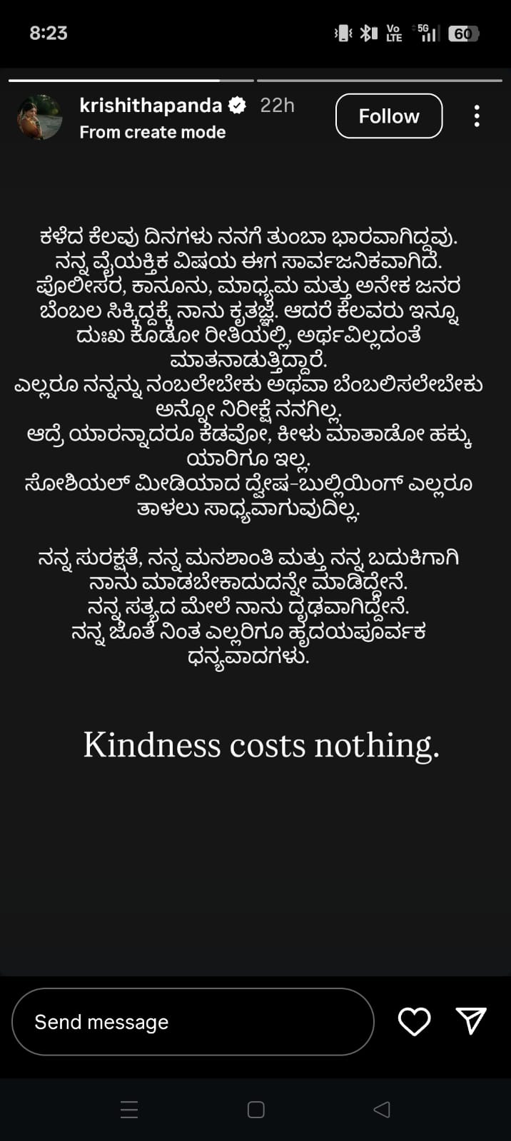 <p><strong>ಬೆಂಗಳೂರು:</strong> ಚಂದನವನದ ನಟಿ, ಬಿಗ್ಬಾಸ್ ಮಾಜಿ ಸ್ಪರ್ಧಿ ಕೃಷಿ ತಾಪಂಡ, ನಿರ್ಮಾಪಕರೊಬ್ಬರ ವಿರುದ್ಧ ಕಿರುಕುಳ ಹಾಗೂ ಮಾನಸಿಕ ಹಿಂಸೆ ನೀಡಿದ ಆರೋಪದಡಿ ದೂರು ದಾಖಲಿಸಿದ್ದಾರೆ ಎನ್ನುವ ಸುದ್ದಿ ಹರಿದಾಡುತ್ತಿರುವ ನಡುವೆಯೇ, ನಟಿ ಇನ್ಸ್ಟಾಗ್ರಾಂ ಸ್ಟೋರಿಯೊಂದನ್ನು ಹಂಚಿಕೊಂಡಿದ್ದಾರೆ.</p><p>ಸ್ಟೋರಿಯಲ್ಲಿ ‘ಕಳೆದ ಕೆಲವು ದಿನಗಳು ನನಗೆ ತುಂಬಾ ಭಾರವಾಗಿದ್ದವು. ನನ್ನ ವೈಯಕ್ತಿಕ ವಿಷಯ ಈಗ ಸಾರ್ವಜನಿಕವಾಗಿದೆ. ಪೊಲೀಸರ, ಕಾನೂನು, ಮಾಧ್ಯಮ ಮತ್ತು ಅನೇಕ ಜನರ ಬೆಂಬಲ ಸಿಕ್ಕಿದ್ದಕ್ಕೆ ನಾನು ಕೃತಜ್ಞೆ. ಆದರೆ ಕೆಲವರು ಇನ್ನೂ ದುಃಖ ಕೊಡೋ ರೀತಿಯಲ್ಲಿ, ಅರ್ಥವಿಲ್ಲದಂತೆ ಮಾತನಾಡುತ್ತಿದ್ದಾರೆ. ಎಲ್ಲರೂ ನನ್ನನ್ನು ನಂಬಲೇಬೇಕು ಅಥವಾ ಬೆಂಬಲಿಸಲೇಬೇಕು ಅನ್ನೋ ನಿರೀಕ್ಷೆ ನನಗಿಲ್ಲ. ಆದ್ರೆ ಯಾರನ್ನಾದರೂ ಕೆಡವೋ, ಕೀಳು ಮಾತಾಡೋ ಹಕ್ಕು ಯಾರಿಗೂ ಇಲ್ಲ. ಸೋಷಿಯಲ್ ಮೀಡಿಯಾದ ದ್ವೇಷ-ಬುಲ್ಲಿಯಿಂಗ್ ಎಲ್ಲರೂ ತಾಳಲು ಸಾಧ್ಯವಾಗುವುದಿಲ್ಲ. ನನ್ನ ಸುರಕ್ಷತೆ, ನನ್ನ ಮನಶಾಂತಿ ಮತ್ತು ನನ್ನ ಬದುಕಿಗಾಗಿ ನಾನು ಮಾಡಬೇಕಾದುದನ್ನೇ ಮಾಡಿದ್ದೇನೆ. ನನ್ನ ಸತ್ಯದ ಮೇಲೆ ನಾನು ದೃಢವಾಗಿದ್ದೇನೆ. ನನ್ನ ಜೊತೆ ನಿಂತ ಎಲ್ಲರಿಗೂ ಹೃದಯಪೂರ್ವಕ ಧನ್ಯವಾದಗಳು’ ಎಂದು ಬರೆದುಕೊಂಡಿದ್ದಾರೆ. </p>.ನಟಿಗೆ ಕಿರುಕುಳ: ಆರೋಪಿ ಅರವಿಂದ್ ವೆಂಕಟೇಶ್ರೆಡ್ಡಿ ಬಂಧನ, ಬಿಡುಗಡೆ.<p>‘ಕನ್ನಡಕ್ಕಾಗಿ ಒಂದನ್ನು ಒತ್ತಿ’ ಸೇರಿದಂತೆ ಹಲವು ಸಿನಿಮಾಗಳಲ್ಲಿ ಕಾಣಿಸಿಕೊಂಡಿರುವ ಕೃಷಿ ಅವರು, ಸಾಮಾಜಿಕ ಜಾಲತಾಣಗಳಲ್ಲೂ ಸಕ್ರಿಯರಾಗಿದ್ದಾರೆ.</p>.<div><p><strong>ಪ್ರಜಾವಾಣಿ ಆ್ಯಪ್ ಇಲ್ಲಿದೆ: <a href="https://play.google.com/store/apps/details?id=com.tpml.pv">ಆಂಡ್ರಾಯ್ಡ್ </a>| <a href="https://apps.apple.com/in/app/prajavani-kannada-news-app/id1535764933">ಐಒಎಸ್</a> | <a href="https://whatsapp.com/channel/0029Va94OfB1dAw2Z4q5mK40">ವಾಟ್ಸ್ಆ್ಯಪ್</a>, <a href="https://www.twitter.com/prajavani">ಎಕ್ಸ್</a>, <a href="https://www.fb.com/prajavani.net">ಫೇಸ್ಬುಕ್</a> ಮತ್ತು <a href="https://www.instagram.com/prajavani">ಇನ್ಸ್ಟಾಗ್ರಾಂ</a>ನಲ್ಲಿ ಪ್ರಜಾವಾಣಿ ಫಾಲೋ ಮಾಡಿ.</strong></p></div>