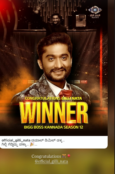 ಕನ್ನಡ ಬಿಗ್ ಬಾಸ್ 12ನೇ ಆವೃತ್ತಿಯಲ್ಲಿ ಅಪಾರ ಜನ ಬೆಂಬಲದೊಂದಿಗೆ ಅಭೂತಪೂರ್ವ ಗೆಲುವು ಸಾಧಿಸಿದ ಹಳ್ಳಿ ಪ್ರತಿಭೆ ಗಿಲ್ಲಿ ನಟ (ಶ್ರೀ ನಟರಾಜ್) ಅವರಿಗೆ ಹೃತ್ಪೂರ್ವಕ ಅಭಿನಂದನೆಗಳು...💐