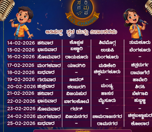 <p>ಪುಟಾಣಿಗಳ ಮಧುರ ಧ್ವನಿ ಆಲಿಸಲು ಝೀ ಕನ್ನಡ ವಾಹಿನಿಯು ‘ಸರಿಗಮಪ ಲಿಟಲ್ ಚಾಂಪ್ಸ್’ ಆರಂಭಿಸುತ್ತಿದೆ. ಇದಕ್ಕಾಗಿ ಪ್ರತಿ ಜಿಲ್ಲೆಯಲ್ಲೂ ಆಡಿಷನ್ ನಡೆಸುತ್ತಿದೆ. ನಿಮ್ಮ ಜಿಲ್ಲೆಯಲ್ಲಿ ಆಡಿಷನ್ ಯಾವಾಗ ನಡೆಯುತ್ತದೆ ಎಂಬ ಮಾಹಿತಿ ಇಲ್ಲಿದೆ.</p>.<p><strong>ಆಡಿಷನ್ ವಿವರ ಹೀಗಿದೆ..</strong></p><p><strong>ಫೆ. 14 ರಂದು ಶನಿವಾರ</strong> ಕೊಪ್ಪಳ, ಶಿವಮೊಗ್ಗ, ತುಮಕೂರು. </p><p><strong>ಫೆ. 15ರಂದು ಭಾನುವಾರ</strong> ಬಳ್ಳಾರಿ, ಉಡುಪಿ, ಬೆಂಗಳೂರು. </p><p><strong>ಫೆ. 16ರಂದು ಸೋಮವಾರ</strong> ರಾಯಚೂರು, ಮಂಗಳೂರು. </p><p><strong>ಫೆ. 17ರಂದು ಮಂಗಳವಾರ</strong> ಯಾದಗಿರಿ, ಮಡಿಕೇರಿ, ಚಿತ್ರದುರ್ಗ. </p><p><strong>ಫೆ. 18ರಂದು ಬುಧವಾರ</strong> ಚಿಕ್ಕಮಗಳೂರು, ದಾವಣಗೆರೆಯಲ್ಲಿ ನಡೆಯಲಿದೆ.</p><p><strong>ಫೆ. 19ರಂದು</strong> ಗುರುವಾರ ಬೀದರ್, ಹಾವೇರಿ. </p><p><strong>ಫೆ. 20ರಂದು ಶುಕ್ರವಾರ</strong> ಕಲಬುರ್ಗಿ, ಮಂಡ್ಯ, ಶಿರಸಿ. </p><p><strong>ಫೆ. 21ರಂದು ಶನಿವಾರ</strong> ವಿಜಯಪುರ, ಹಾಸನ, ಬೆಳಗಾವಿಯಲ್ಲಿ ನಡೆಯುತ್ತದೆ. </p><p><strong>ಫೆ. 22ರಂದು</strong> <strong>ಭಾನುವಾರ</strong> ಬಾಗಲಕೋಟೆ, ಮೈಸೂರು, ಹುಬ್ಬಳ್ಳಿ. </p><p><strong>ಫೆ.23 ರಂದು ಸೋಮವಾರ</strong> ಗದಗ. </p><p><strong>ಫೆ. 24ರಂದು ಮಂಗಳವಾರ</strong> ವಿಜಯನಗರ, ಚಾಮರಾಜನಗರ, ಚಿಕ್ಕಬಳ್ಳಾಪುರ. </p><p><strong>ಫೆ.25ರಂದು ಬುಧವಾರ</strong> ರಾಮನಗರ ಹಾಗೂ ಕೋಲಾರದಲ್ಲಿ ಆಡಿಷನ್ ನಡೆಯಲಿದೆ.</p><p>ಬೆಳಗ್ಗೆ 9ಗಂಟೆಗೆ ಆಡಿಷನ್ ಆರಂಭವಾಗಲಿದೆ</p>.<blockquote><strong>‘ಸರಿಗಮಪ ಲಿಟಲ್ ಚಾಂಪ್’ ಆಡಿಷನ್ ನಿಯಮ ಹೀಗಿದೆ.</strong></blockquote>.<ul><li><p>ವಯಸ್ಸಿನ ಮಿತಿ: 3ರಿಂದ 15 ವರ್ಷ</p></li><li><p>3 ವಿಭಿನ್ನ ಶೈಲಿಯ ಹಾಡುಗಳನ್ನು <strong>ಕರೋಕೆ</strong> ಬಳಸದೆ ಹಾಡುವಂತಿರಬೇಕು. </p></li><li><p>ಆಡಿಷನ್ನಲ್ಲಿ ಭಾಗವಹಿಸುವಾಗ ಪಾಸ್ಪೋರ್ಟ್ ಫೋಟೋ ಹಾಗೂ ವಿಳ್ಳಾಸ ಸಾಕ್ಷ್ಯ ಜೆರಾಕ್ಸ್ ಜೊತೆಗೆ ಬರಬೇಕೆಂದು ಝೀ ಕನ್ನಡ ವಾಹಿನಿ ತಂಡ ಸಾಮಾಜಿಕ ಮಾಧ್ಯಮದಲ್ಲಿ ಮಾಹಿತಿ ನೀಡಿದೆ.</p></li></ul>.<div><p><strong>ಪ್ರಜಾವಾಣಿ ಆ್ಯಪ್ ಇಲ್ಲಿದೆ: <a href="https://play.google.com/store/apps/details?id=com.tpml.pv">ಆಂಡ್ರಾಯ್ಡ್ </a>| <a href="https://apps.apple.com/in/app/prajavani-kannada-news-app/id1535764933">ಐಒಎಸ್</a> | <a href="https://whatsapp.com/channel/0029Va94OfB1dAw2Z4q5mK40">ವಾಟ್ಸ್ಆ್ಯಪ್</a>, <a href="https://www.twitter.com/prajavani">ಎಕ್ಸ್</a>, <a href="https://www.fb.com/prajavani.net">ಫೇಸ್ಬುಕ್</a> ಮತ್ತು <a href="https://www.instagram.com/prajavani">ಇನ್ಸ್ಟಾಗ್ರಾಂ</a>ನಲ್ಲಿ ಪ್ರಜಾವಾಣಿ ಫಾಲೋ ಮಾಡಿ.</strong></p></div>