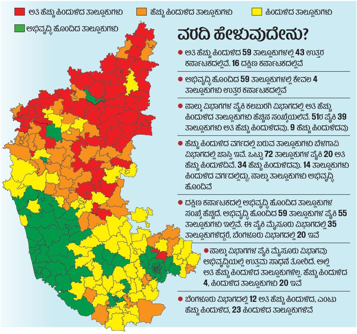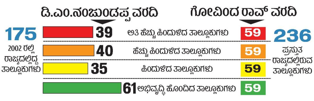 ಸುಮಾರು 24 ವರ್ಷಗಳ ಹಿಂದೆ ರಾಜ್ಯದಲ್ಲಿ ಪ್ರಾದೇಶಿಕ ಅಸಮತೋಲನದ ಬಗ್ಗೆ ಡಿ.ಎಂ.ನಂಜುಂಡಪ್ಪ ಅವರ ನೇತೃತ್ವದ ಸಮಿತಿಯು ಅಧ್ಯಯನ ಮಾಡಿ ವರದಿ ನೀಡಿತ್ತು. ಮತ್ತೆ ಇಂತಹದ್ದೇ ಅಧ್ಯಯನ ನಡೆಸಿರುವ ಆರ್ಥಿಕ ತಜ್ಞ ಪ್ರೊ.ಗೋವಿಂದ ರಾವ್ ಅವರ ಅಧ್ಯಕ್ಷತೆಯ ಸಮಿತಿಯು, ರಾಜ್ಯ ಸರ್ಕಾರಕ್ಕೆ ಇದೀಗ ವರದಿ ಸಲ್ಲಿಸಿದೆ. ಹಿಂದುಳಿದಿರುವಿಕೆಯು ರಾಜ್ಯದ ಉತ್ತರ ಭಾಗದಲ್ಲಿಯೇ ಹೆಚ್ಚಾಗಿದೆ ಎಂದು ವರದಿ ಹೇಳಿದೆ. ಉತ್ತರ ಕರ್ನಾಟಕದ ಒಂದು ಜಿಲ್ಲೆಯನ್ನೂ ಅಭಿವೃದ್ಧಿ ಹೊಂದಿದ ಜಿಲ್ಲೆ ಎಂದು ಪರಿಗಣಿಸಲು ಸಾಧ್ಯವಿಲ್ಲ ಎಂದಿರುವ ವರದಿಯು, ರಾಜ್ಯದ ಇತರೆ ತಾಲ್ಲೂಕುಗಳ ಹಿಂದುಳಿದ ಸ್ಥಿತಿಗತಿ, ಅಭಿವೃದ್ಧಿಯ ಚಿತ್ರಣವನ್ನೂ ಒಳಗೊಂಡಿದೆ.