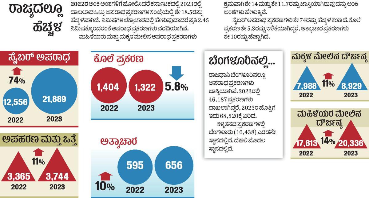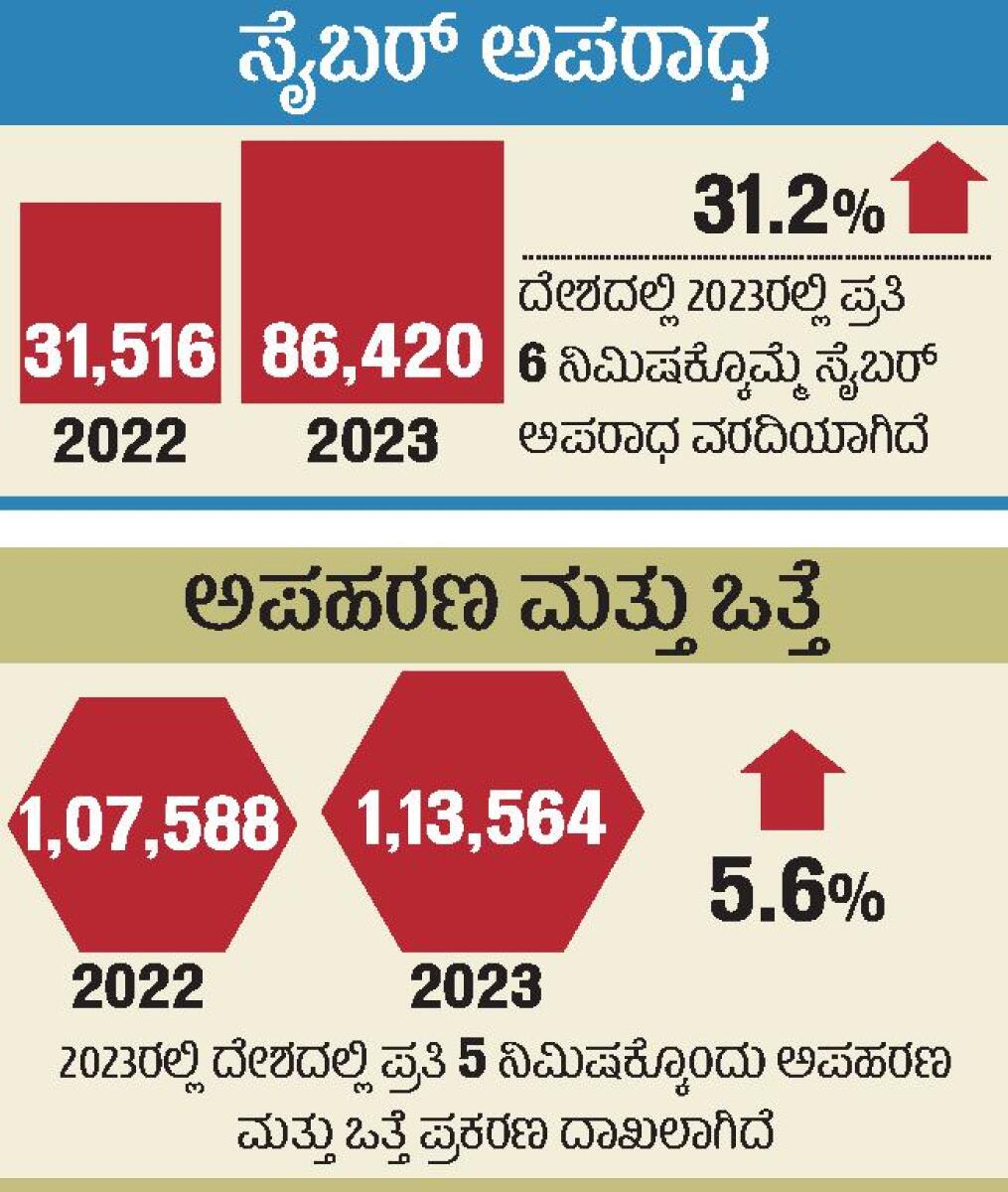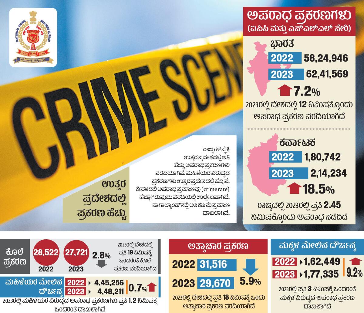 <p>ರಾಷ್ಟ್ರೀಯ ಅಪರಾಧ ದಾಖಲೆಗಳ ಬ್ಯೂರೊ (ಎನ್ಸಿಆರ್ಬಿ) 2023ರ ವಾರ್ಷಿಕ ವರದಿಯನ್ನು ಇತ್ತೀಚೆಗೆ ಬಿಡುಗಡೆ ಮಾಡಿದೆ. ದೇಶದಲ್ಲಿ ಒಟ್ಟಾರೆ ಅಪರಾಧ ಪ್ರಕರಣಗಳು ಹೆಚ್ಚಾಗಿವೆ. ಐಪಿಸಿ (ಭಾರತೀಯ ದಂಡ ಸಂಹಿತೆ) ಮತ್ತು ವಿಶೇಷ ಮತ್ತು ಸ್ಥಳೀಯ ಕಾನೂನುಗಳ (ಎಸ್ಎಲ್ಎಲ್) ಅಡಿ ದಾಖಲಾಗುತ್ತಿದ್ದ ಪ್ರಕರಣಗಳ ಪ್ರಮಾಣವು ಏರಿಕೆ ಕಂಡಿದೆ. ಹಾಗೆಯೇ ಅಪರಾಧಗಳ ದಾಖಲು ಪ್ರಮಾಣವೂ ಜಾಸ್ತಿಯಾಗಿದೆ; 2022ರಲ್ಲಿ ಈ ಪ್ರಮಾಣ ಒಂದು ಲಕ್ಷ ಜನಸಂಖ್ಯೆಗೆ 422 ಇದ್ದರೆ, 2023ರಲ್ಲಿ ಅದು 448ಕ್ಕೆ ಏರಿದೆ.</p>.<p>ಹಿಂದಿನ ವರ್ಷಕ್ಕೆ ಹೋಲಿಸಿದರೆ ಕೊಲೆ ಮತ್ತು ಅತ್ಯಾಚಾರ ಪ್ರಕರಣಗಳು ಕಡಿಮೆ ಆಗಿದ್ದರೆ, ಅಪಹರಣ ಮತ್ತು ಒತ್ತೆ ಪ್ರಕರಣಗಳು ಜಾಸ್ತಿಯಾಗಿವೆ. ಮಕ್ಕಳು ಮತ್ತು ಮಹಿಳೆಯರ ಮೇಲಿನ ಅಪರಾಧಗಳಲ್ಲಿ ಅಲ್ಪ ಪ್ರಮಾಣದ ಏರಿಕೆ ಕಂಡು ಬಂದಿದೆ. ಈ ಪೈಕಿ ‘ಗಂಡ ಅಥವಾ ಸಂಬಂಧಿಗಳಿಂದ ಕ್ರೌರ್ಯ’ಕ್ಕೆ ಸಂಬಂಧಿಸಿದ ಪ್ರಕರಣಗಳ ಪಾಲು (ಶೇ 28) ಹೆಚ್ಚಾಗಿದೆ. ಅಪಹರಣ ಮತ್ತು ಒತ್ತೆ ಪ್ರಕರಣಗಳು (ಶೇ 19.8) ಮತ್ತು ಪೋಕ್ಸೊ ಪ್ರಕರಣಗಳು (14.8) ನಂತರದ ಸ್ಥಾನಗಳಲ್ಲಿವೆ.</p>.<p>ಮಕ್ಕಳ ಮೇಲಿನ ಪ್ರಕರಣಗಳಲ್ಲಿ ಶೇ 9.2ರಷ್ಟು ಹೆಚ್ಚಳವಾಗಿದ್ದು, ಅವುಗಳಲ್ಲಿ ಅಪಹರಣ (ಶೇ 45) ಮತ್ತು ಪೋಕ್ಸೊ ಪ್ರಕರಣಗಳ (ಶೇ 38.2) ಸಂಖ್ಯೆ ಜಾಸ್ತಿ ಇದೆ. ಹಾಗೆಯೇ, ಪರಿಶಿಷ್ಟ ಜಾತಿ ಜನರ (ಎಸ್ಸಿ) ಮೇಲಿನ ದೌರ್ಜನ್ಯ ಪ್ರಕರಣಗಳಲ್ಲಿ ಅಲ್ಪಪ್ರಮಾಣದ ಹೆಚ್ಚಳವಾಗಿದ್ದರೆ, ಎಸ್ಟಿಗಳ ಮೇಲಿನ ದೌರ್ಜನ್ಯ ಪ್ರಕರಣಗಳಲ್ಲಿ (ಶೇ 28.8) ಭಾರಿ ಪ್ರಮಾಣದ ಏರಿಕೆಯಾಗಿದೆ. ಸೈಬರ್ ಅಪರಾಧಗಳು ಗಣನೀಯವಾಗಿ ಜಾಸ್ತಿಯಾಗಿವೆ.</p>.<p>ದೇಶದಲ್ಲಿ 2023ರಲ್ಲಿ 1,59,811 ಪುರುಷರು, 3,24,763 ಮಹಿಳೆಯರು ಮತ್ತು 10 ಮಂದಿ ಲಿಂಗತ್ವ ಅಲ್ಪಸಂಖ್ಯಾತರು ಸೇರಿ ಒಟ್ಟು 4,84,584 ಮಂದಿ ಕಾಣೆಯಾಗಿದ್ದಾರೆ. ಈ ಪಟ್ಟಿಯಲ್ಲಿ ಮಹಿಳೆಯರು ಹೆಚ್ಚಿದ್ದಾರೆ.</p>.<p>ಕಡಿಮೆ ಜನರಿಗೆ ಶಿಕ್ಷೆ: ಬಹುತೇಕ ಎಲ್ಲ ಅಪರಾಧ ಪ್ರಕರಣಗಳಲ್ಲಿ ತಪ್ಪಿತಸ್ಥರಿಗೆ ಶಿಕ್ಷೆಯಾಗುತ್ತಿರುವ ಪ್ರಮಾಣ ಕಡಿಮೆ. ಅದರಲ್ಲೂ ಮಹಿಳೆಯರ ಮೇಲಿನ ಅಪರಾಧ ಪ್ರಕರಣಗಳಲ್ಲಿ ಈ ಪ್ರಮಾಣ ತುಂಬಾ ಕಡಿಮೆ ಇದೆ.</p>.<h2>ಎಸ್ಸಿ: ದೌರ್ಜನ್ಯ ಹೆಚ್ಚಳ</h2>.<p>2023ರಲ್ಲಿ ಪರಿಶಿಷ್ಟ ಜಾತಿಯವರ ಮೇಲೆ ನಡೆದ ಅಪರಾಧ ಪ್ರಕರಣಗಳ ಸಂಖ್ಯೆ ಶೇ 0.4ರಷ್ಟು ಹೆಚ್ಚಾಗಿದೆ. 2022ರಲ್ಲಿ 57,582 ದೂರುಗಳು ದಾಖಲಾಗಿದ್ದರೆ, 2023ರಲ್ಲಿ ಈ ಸಂಖ್ಯೆ 57,789ಕ್ಕೆ ಜಾಸ್ತಿಯಾಗಿದೆ. ಪರಿಶಿಷ್ಟ ಜಾತಿಯವರ ಮೇಲೆ ನಡೆದ ಅಪರಾಧ ಪ್ರಮಾಣ 2022ರಲ್ಲಿ 28.6ರಷ್ಟು ಇತ್ತು, ಮರು ವರ್ಷ ಇದು 28.7ಕ್ಕೆ ಏರಿಕೆ ಕಂಡಿದೆ.</p>.<h2>ಉತ್ತರ ಪ್ರದೇಶದಲ್ಲಿ ಪ್ರಕರಣ ಹೆಚ್ಚು</h2>.<p>ರಾಜ್ಯಗಳ ಪೈಕಿ ಉತ್ತರ ಪ್ರದೇಶದಲ್ಲಿ ಅತಿ ಹೆಚ್ಚು ಅಪರಾಧ ಪ್ರಕರಣಗಳು ವರದಿಯಾಗಿವೆ. ಮಹಿಳೆಯರ ವಿರುದ್ಧದ ಪ್ರಕರಣಗಳು ಉತ್ತರ ಪ್ರದೇಶದಲ್ಲಿ ಹೆಚ್ಚಿವೆ. ಕೇರಳದಲ್ಲಿ ಅಪರಾಧ ಪ್ರಮಾಣವು (crime rate) ಹೆಚ್ಚಾಗಿರುವುದು ವರದಿಯಲ್ಲಿ ಉಲ್ಲೇಖವಾಗಿದೆ. ನಾಗಾಲ್ಯಾಂಡ್ನಲ್ಲಿ ಅತಿ ಕಡಿಮೆ ಪ್ರಮಾಣ ದಾಖಲಾಗಿದೆ.</p>.<h2>ಶಿಕ್ಷೆಯಾಗುವುದು ಕಡಿಮೆ</h2>.<p>ಮಹಿಳೆಯರ ಮೇಲಿನ ಅಪರಾಧ ಪ್ರಕರಣಗಳಲ್ಲಿ ಸಂತ್ರಸ್ತರಿಗೆ ನ್ಯಾಯ ಸಿಕ್ಕಿರುವ ಪ್ರಮಾಣ ಕಡಿಮೆ ಇದೆ. ಮಹಿಳೆಯರ ಮೇಲೆ ನಡೆದ ಅಪರಾಧಕ್ಕೆ ಸಂಬಂಧಿಸಿದಂತೆ (ರಾಜ್ಯಗಳು/ಕೇಂದ್ರಾಡಳಿತ ಪ್ರದೇಶಗಳು ಸೇರಿ) ದಾಖಲಾದ ಒಟ್ಟು ಪ್ರಕರಣಗಳಲ್ಲಿ ಪೊಲೀಸರು ತನಿಖೆ ನಡೆಸಿದ 6,35,159 ಪ್ರಕರಣಗಳ ಪೈಕಿ 4,48,211 ಪ್ರಕರಣಗಳು 2023ರದ್ದು. 1,85,961 ಅದಕ್ಕೂ ಹಿಂದಿನ ವರ್ಷದ ಬಾಕಿ ಪ್ರಕರಣಗ