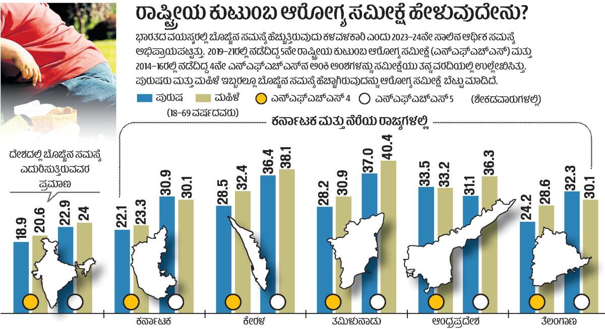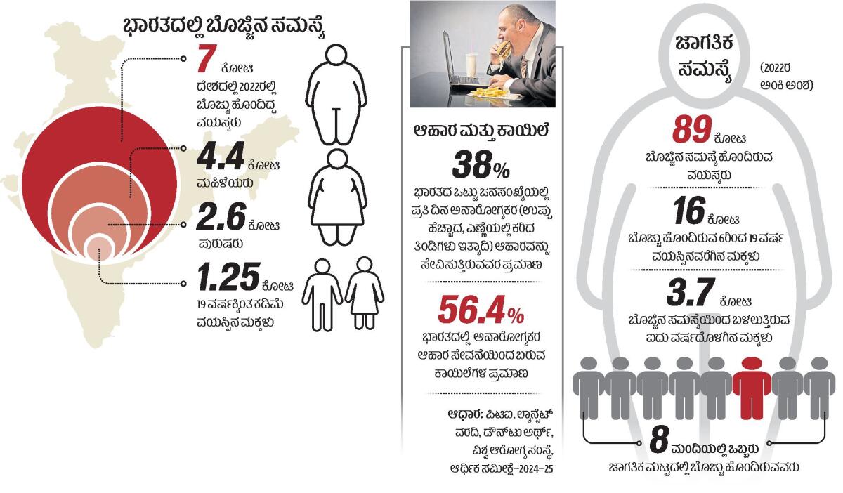 ಬೊಜ್ಜು ಈಗ ಜಾಗತಿಕ ಸಮಸ್ಯೆಯಾಗಿದೆ. ಭಾರತದಲ್ಲೂ ಜನಾರೋಗ್ಯಕ್ಕೆ ದೊಡ್ಡ ಕಂಟಕವಾಗಿದೆ. ದೇಶದಲ್ಲಿ ಬೊಜ್ಜಿನ ಸಮಸ್ಯೆ ಮೂರು ಪಟ್ಟು ಹೆಚ್ಚಾಗಿದ್ದು, ಜನರಲ್ಲಿ ಮಧುಮೇಹ, ರಕ್ತದೊತ್ತಡ, ಹೃದ್ರೋಗ ಮುಂತಾದ ಕಾಯಿಲೆಗಳು ಹೆಚ್ಚುತ್ತಿವೆ. ಬೊಜ್ಜಿನ ಮೂಲ ಆಹಾರ ಪದ್ಧತಿಯಲ್ಲಿದೆ. ಅಧಿಕ ಉಪ್ಪು, ಸಕ್ಕರೆ, ಎಣ್ಣೆಯಲ್ಲಿ ಕರಿದ ಪದಾರ್ಥಗಳ ಸೇವನೆಯು ಸ್ಥೂಲಕಾಯಕ್ಕೆ ಕಾರಣವಾಗುವುದಲ್ಲದೆ, ತೀವ್ರಗತಿಯಲ್ಲಿ ಕಾಯಿಲೆಗಳು ಹೆಚ್ಚಾಗಲು ಕಾರಣವಾಗಿದೆ.
