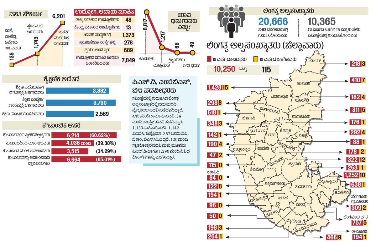 ಸಮೀಕ್ಷೆಯಲ್ಲಿ ಗುರುತಿಸಿದ ಲಿಂಗತ್ವ ಅಲ್ಪಸಂಖ್ಯಾತರಲ್ಲಿ ಐದು ಮಂದಿ ವೈದ್ಯಕೀಯ ಪದವಿ ಪಡೆದವರಿದ್ದಾರೆ. ಏಳು ಮಂದಿ ಕಾನೂನು ಪದವಿ, 34 ಮಂದಿ ತಾಂತ್ರಿಕ ಪದವಿ ಪಡೆದಿದ್ದಾರೆ. 1,123 ಎಸ್ಎಸ್ಎಲ್ಸಿ, 1,142 ಪಿಯುಸಿ/ಡಿಪ್ಲೊಮಾ, 357 ಜನರು ಬಿಎ, ಬಿಕಾಂ, ಬಿಎಸ್ಸಿ ಓದಿದ್ದರೆ, 120 ಮಂದಿ ಸ್ನಾತಕೋತ್ತರ ಪದವಿ ಮತ್ತು ಮೂವರು ಪಿಎಚ್.ಡಿ ಹಾಗೂ 1,290 ಮಂದಿ ವಿವಿಧ ಕೋರ್ಸ್ಗಳನ್ನು ಮುಗಿಸಿದ್ದಾರೆ.