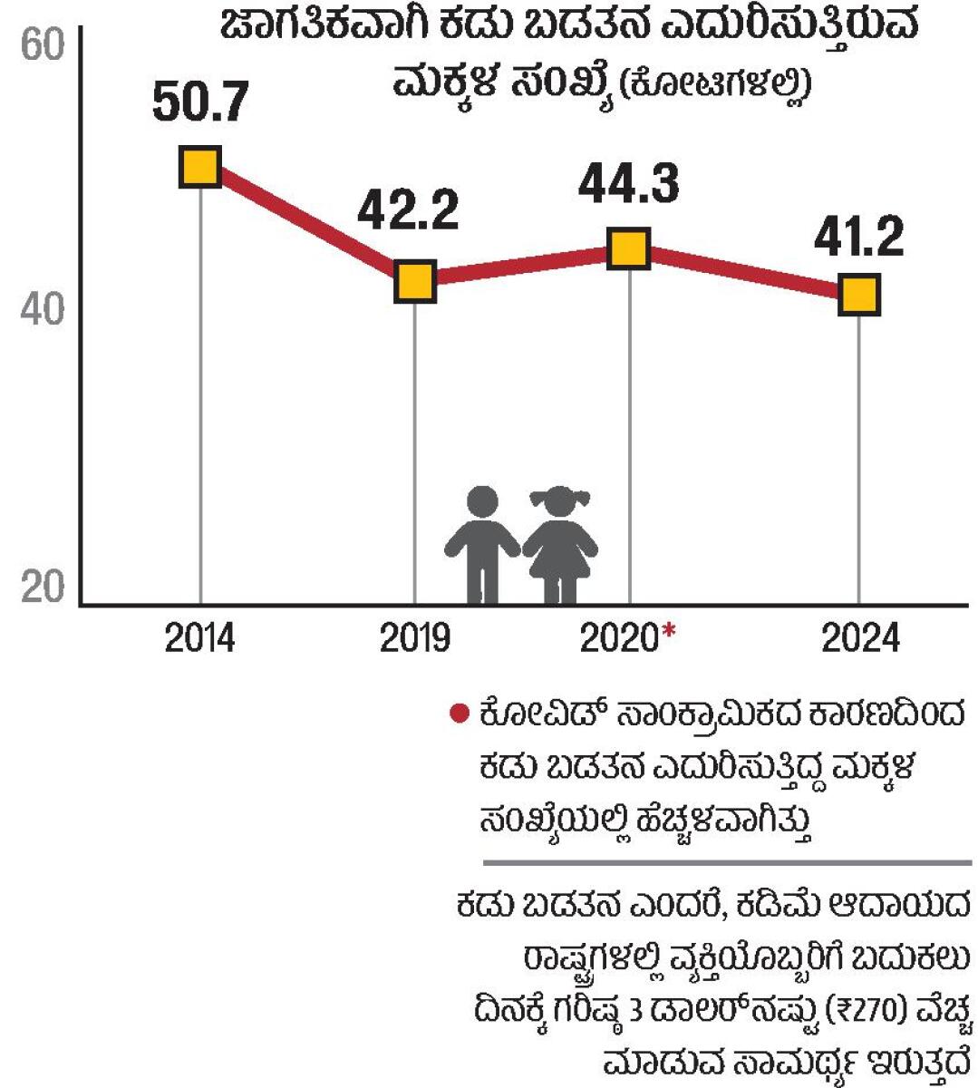 ಭಾರತವನ್ನೂ ಒಳಗೊಂಡಂತೆ ಜಗತ್ತಿನಲ್ಲಿ ದೊಡ್ಡ ಸಂಖ್ಯೆಯ ಮಕ್ಕಳು ಬಡತನವನ್ನು ಎದುರಿಸುತ್ತಿದ್ದಾರೆ ಎಂದು ಯುನಿಸೆಫ್ ಜಾಗತಿಕ ಮಕ್ಕಳ ಸ್ಥಿತಿಗತಿ– 2025 ವರದಿ ತಿಳಿಸಿದೆ. ದಶಕದ ಹಿಂದಿನ ಅಂಕಿ ಅಂಶಗಳಿಗೆ ಹೋಲಿಸಿದರೆ ಜಾಗತಿಕ ಮಟ್ಟದಲ್ಲಿ ಕಡುಬಡ ಮಕ್ಕಳ ಸಂಖ್ಯೆಯಲ್ಲಿ ಇಳಿಮುಖವಾಗಿದೆ. ಆದರೆ,