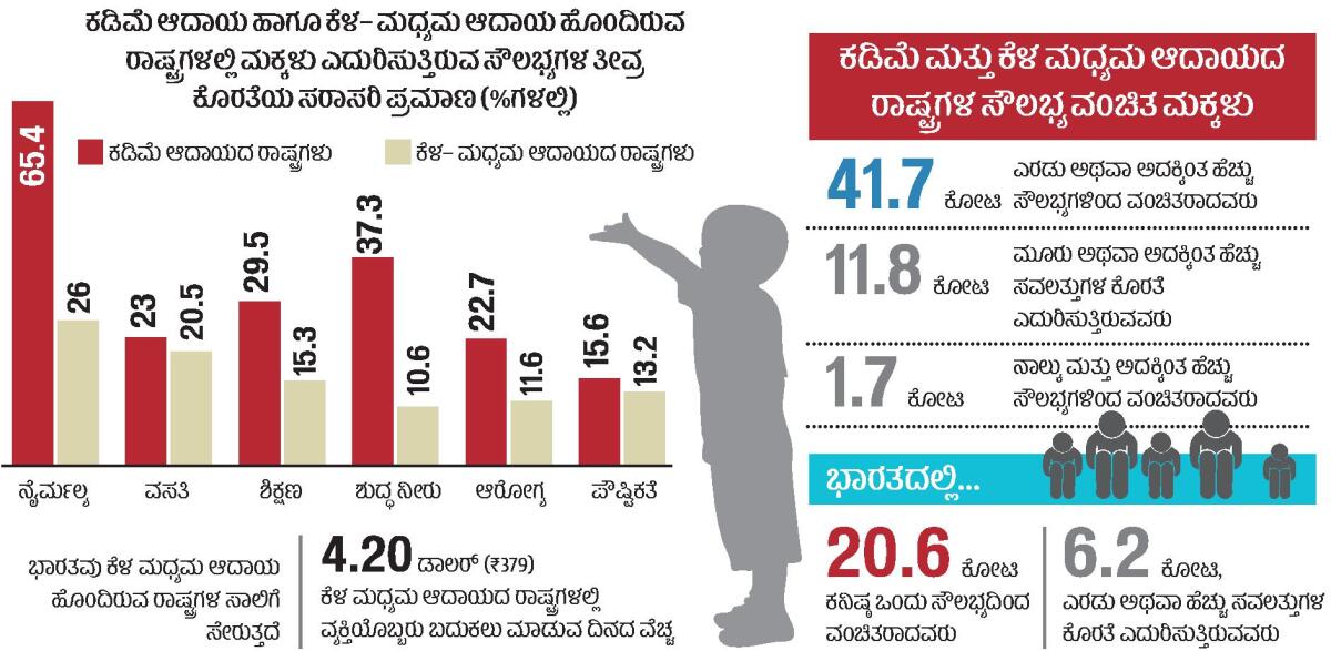 ಭಾರತದಲ್ಲಿ ಮಕ್ಕಳ ಬಹುಆಯಾಮದ ಬಡತನ ಪ್ರಮಾಣ ಈಗಲೂ ಗಣನೀಯವಾಗಿಯೇ ಇದೆ. ಇದು ಅವರ ಆರೋಗ್ಯ ಮತ್ತು ಬೆಳವಣಿಗೆಯ ಮೇಲೆ ವ್ಯತಿರಿಕ್ತ ಪರಿಣಾಮ ಬೀರುತ್ತಿದೆ. ಜಗತ್ತಿನಲ್ಲಿ 41.2 ಕೋಟಿ ಮಕ್ಕಳು ಕಡುಬಡತನಕ್ಕೆ ಗುರಿಯಾಗಿದ್ದು, ದಿನನಿತ್ಯದ ನೈರ್ಮಲ್ಯ ಮತ್ತು ಪೌಷ್ಟಿಕತೆಯಿಂದ ವಂಚಿತರಾಗಿದ್ದಾರೆ ಎಂದು ವರದಿ ಹೇಳಿದೆ