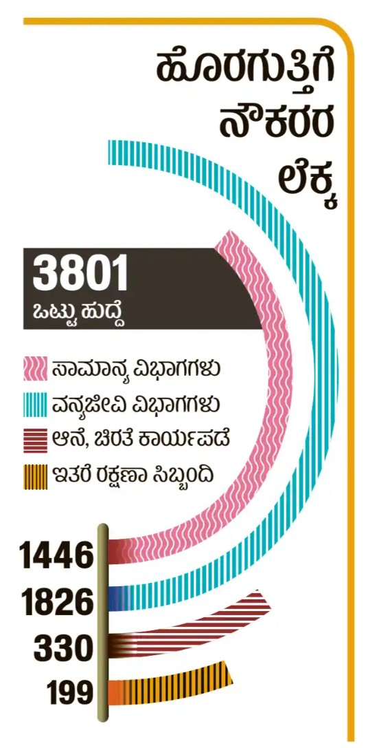 ಅರಣ್ಯ ಇಲಾಖೆಯ ಅರಣ್ಯ ರಕ್ಷಕ ಸಹಿತ 4 ಸಾವಿರ ಹುದ್ದೆ ಸೇರಿ 6 ಸಾವಿರ ಹುದ್ದೆ ಖಾಲಿ ಇವೆ. ಹೊರಗುತ್ತಿಗೆ ಆಧಾರದಲ್ಲಿ 3800 ನೌಕರರು ಕೆಲಸ ಮಾಡುತ್ತಿದ್ದಾರೆ. ವೇತನ, ಸೌಲಭ್ಯ ವಿಚಾರದಲ್ಲಿ ದೂರುಗಳಿದ್ದು, ನೋಟಿಸ್ ನೀಡಿ ಕ್ರಮ ವಹಿಸಲಾಗುತ್ತಿದೆಕುಮಾರ ಪುಷ್ಕರ್, ಹೆಚ್ಚುವರಿ ಪ್ರಧಾನ ಮುಖ್ಯ ಅರಣ್ಯ ಸಂರಕ್ಷಣಾಧಿಕಾರಿ ( ಆಡಳಿತ, ಸಮನ್ವಯ).
