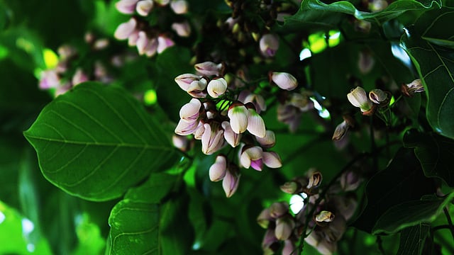 ಅಗಲವಾದ ಹಸಿರು ಎಲೆಗಳ ನಡುವೆ ಬಚ್ಚಿಟ್ಟುಕೊಂಡ ಸೋಜಿಗದ ಹೂವುಗಳಿವು. ಹತ್ತಿರದಿಂದ ನೋಡಿದರೆ ಮಲ್ಲಿಗೆಯ ಮೊಗ್ಗುಗಳು ಪೋಣಿಸಿದಂತೆಯೇ ಕಾಣುವ ಈ ಹೂಗೊಂಚಲು ಒಂದೊಂದು ಮರದಲ್ಲಿ ಒಂದೊಂದು ಬಣ್ಣವನ್ನು ಧರಿಸಿರುತ್ತದೆ. ಒಂದರಲ್ಲಿ ಬಿಳಿ ಹೆಚ್ಚಿದ್ದರೆ, ಮತ್ತೊಂದರಲ್ಲಿ ನೀಲಿ ಹೊಳೆಯುತ್ತದೆ. ಈ ವರ್ಣವೈವಿಧ್ಯದ ನಡುವ ಕಳೆದುಹೋಗದೆ, ಮೌನವಾಗಿ, ಸಮಯ ಲೆಕ್ಕಕ್ಕಿಡದೆ ನಿಂತರಷ್ಟೇ ನಿಮಗೆ ಭೃಂಗ ಕಾಣಿಸುತ್ತದೆ. ಅದರ ಸಂಗೀತವೂ ಕೇಳಿಸುತ್ತದೆ.