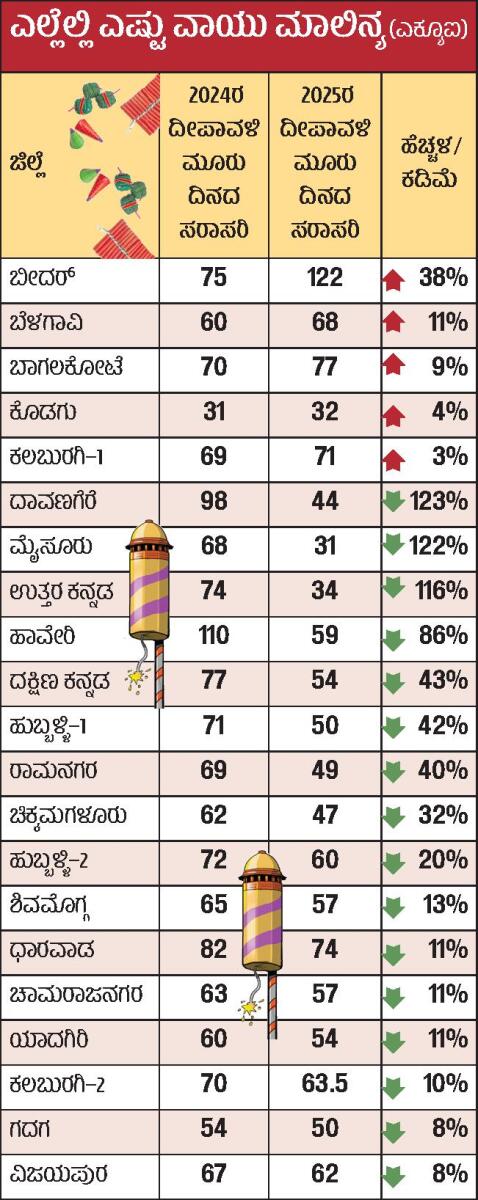 <p><strong>ಬೆಂಗಳೂರು:</strong> ರಾಜ್ಯದಲ್ಲಿ ಕಳೆದ ವರ್ಷಕ್ಕೆ ಹೋಲಿಸಿದರೆ ಈ ವರ್ಷದ ದೀಪಾವಳಿಯ ಮೂರು ದಿನಗಳಲ್ಲಿ ವಾಯು ಮಾಲಿನ್ಯ ಸರಾಸರಿ ಶೇ 29ರಷ್ಟು ಕಡಿಮೆಯಾಗಿದ್ದರೆ, ಸಾಮಾನ್ಯ ದಿನಗಳಿಗೆ ಹೋಲಿಸಿದರೆ ಶೇ 12ರಷ್ಟು ಇಳಿಕೆಯಾಗಿದೆ.</p>.<p>ದೀಪಾವಳಿಯ ಮೊದಲ ದಿನ ಶೇ 35ರಷ್ಟು, ಎರಡನೇ ದಿನ ಶೇ 27ರಷ್ಟು, ಮೂರನೇ ದಿನ ಶೇ 27ರಷ್ಟು ವಾಯು ಮಾಲಿನ್ಯ ಕಡಿಮೆಯಾಗಿದೆ. ಹಿಂದಿನ ದೀಪಾವಳಿ ಹಾಗೂ ಸಾಮಾನ್ಯ ದಿನಗಳಲ್ಲಿ ದಾಖಲಾಗುವ ವಾಯು ಮಾಲಿನ್ಯಕ್ಕಿಂತ ಕಡಿಮೆ ಪ್ರಮಾಣ (ವಾಯು ಗುಣಮಟ್ಟ ಇಂಡೆಕ್ಸ್– ಎಕ್ಯೂಐ) ಈ ವರ್ಷದ ದೀಪಾವಳಿ ವೇಳೆ ದಾಖಲಾಗಿದೆ.</p>.<p>ರಾಜ್ಯ ಮಾಲಿನ್ಯ ನಿಯಂತ್ರಣ ಮಂಡಳಿಯ ಮಾಪನ ಕೇಂದ್ರಗಳಲ್ಲಿ ದೀಪಾವಳಿಯ ಹಿಂದಿನ ಸೋಮವಾರ ಅ.13ರಂದು ಸರಾಸರಿ 63 ಎಕ್ಯೂಐ ದಾಖಲಾಗಿತ್ತು. ದೀಪಾವಳಿಯ ಮೊದಲ ದಿನ 53 ಎಕ್ಯೂಐ, ಎರಡನೇ ದಿನ 55 ಎಕ್ಯೂಐ, ಮೂರನೇ ದಿನ 60 ಎಕ್ಯೂಐ ದಾಖಲಾಗಿ, ಸಾಮಾನ್ಯ ದಿನಕ್ಕಿಂತಲೂ ಕಡಿಮೆ ವಾಯು ಮಾಲಿನ್ಯ ದಾಖಲಾಗಿದೆ. ಕಳೆದ ವರ್ಷದ ದೀಪಾವಳಿಯ ಮೂರು ದಿನ ಎಕ್ಯೂಐ ಸರಾಸರಿ 73 ಆಗಿತ್ತು. ಈ ಬಾರಿ 56 ಎಕ್ಯೂಐ ದಾಖಲಾಗಿದೆ.</p>.<h2>ಅತಿಹೆಚ್ಚು: </h2><p>ಬೀದರ್ನಲ್ಲಿ ಅತಿಹೆಚ್ಚು ವಾಯು ಮಾಲಿನ್ಯ ದಾಖಲಾಗಿದ್ದು, ಕಳೆದ ವರ್ಷಕ್ಕಿಂತ ಶೇ 38ರಷ್ಟು ವೃದ್ಧಿಯಾಗಿದೆ. ಬೆಳಗಾವಿ, ಬಾಗಲಕೋಟೆ, ಕೊಡಗು, ಕಲಬುರಗಿ–1ರಲ್ಲಿ ವಾಯು ಮಾಲಿನ್ಯ ಹೆಚ್ಚಳವಾಗಿದೆ. </p>.<h2>ಅತಿ ಕಡಿಮೆ: </h2><p>ದಾವಣಗೆರೆಯಲ್ಲಿ ಈ ಬಾರಿ ದೀಪಾವಳಿಯ ವಾಯು ಮಾಲಿನ್ಯ ದಾಖಲೆ ಪ್ರಮಾಣದಲ್ಲಿ (ಶೇ 123) ಕಡಿಮೆಯಾಗಿದೆ. ಮೈಸೂರು, ಉತ್ತರ ಕನ್ನಡದಲ್ಲೂ ವಾಯು ಮಾಲಿನ್ಯ ಇಳಿಕೆಯಾಗಿದೆ. ಬೆಂಗಳೂರಿನಲ್ಲಿ ಶೇ 44 ರಷ್ಟು ಕಡಿಮೆಯಾಗಿದೆ.</p>.<p>ಕೋಲಾರ, ಚಿಕ್ಕಬಳ್ಳಾಪುರ, ಹಾಸನ, ರಾಯಚೂರು, ಕೊಪ್ಪಳ, ಉಡುಪಿ, ತುಮಕೂರಿನಲ್ಲಿ ವಾಯು ಮಾಲಿನ್ಯ ದತ್ತಾಂಶ ನಿರ್ವಹಣೆ ಮಾಡಿಲ್ಲ ಎಂದು ಮಾಲಿನ್ಯ ನಿಯಂತ್ರಣ ಮಂಡಳಿ ತಿಳಿಸಿದೆ.</p>.<div><div class="bigfact-title">ಶಬ್ದ ಮಾಲಿನ್ಯ ಎಲ್ಲೆಡೆ ಹೆಚ್ಚು</div><div class="bigfact-description">ದೀಪಾವಳಿ ಸಂದರ್ಭದಲ್ಲಿ ವಾಯು ಮಾಲಿನ್ಯದ ಪ್ರಮಾಣ ಕಡಿಮೆಯಾಗಿರುವ ನಗರ/ ಜಿಲ್ಲೆಗಳಲ್ಲೂ ಶಬ್ದ ಮಾಲಿನ್ಯ ಹೆಚ್ಚಾಗಿದೆ. ಕಳೆದ ದೀಪಾವಳಿಗೆ ಹೋಲಿಸಿದರೆ ಈ ವರ್ಷದ ದೀಪಾವಳಿಯ ಮೂರು ದಿನಗಳಲ್ಲಿ ಶಬ್ದ ಮಾಲಿನ್ಯ ಹೆಚ್ಚಾಗಿರುವುದು ರಾಜ್ಯ ಮಾಲಿನ್ಯ ನಿಯಂತ್ರಣ ಮಂಡಳಿಯ 29 ಮಾಪನ ಕೇಂದ್ರಗಳಲ್ಲಿ ದಾಖಲಾಗಿದೆ. </div></div>.<p>ಬೆಳಗಾವಿಯಲ್ಲಿ 76.18 ಡೆಸಿಬಲ್ (+28%), ಹಾಸನದಲ್ಲಿ 75.26 ಡೆಸಿಬಲ್ (+23%), ಚಿಕ್ಕಬಳ್ಳಾಪುರದಲ್ಲಿ 53.78 ಡೆಸಿಬಲ್ (+23%), ಚಿಕ್ಕಮಗಳೂರಿನಲ್ಲಿ 77.86 ಡೆಸಿಬಲ್ (+22%), ಚಿತ್ರದುರ್ಗ ದಲ್ಲಿ 67.26 ಡೆಸಿಬಲ್ (+21%), ಮಂಡ್ಯದಲ್ಲಿ 67.19 ಡೆಸಿಬಲ್ (+19%) ದಾಖಲಾಗಿದ್ದು, ಈ ನಗರ/ ಜಿಲ್ಲಾ ಕೇಂದ್ರಗಳು ಶಬ್ದ ಮಾಲಿನ್ಯದಲ್ಲಿ ಮೊದಲ ಐದು ಸ್ಥಾನದಲ್ಲಿದೆ.</p>.<div><p><strong>ಪ್ರಜಾವಾಣಿ ಆ್ಯಪ್ ಇಲ್ಲಿದೆ: <a href="https://play.google.com/store/apps/details?id=com.tpml.pv">ಆಂಡ್ರಾಯ್ಡ್ </a>| <a href="https://apps.apple.com/in/app/prajavani-kannada-news-app/id1535764933">ಐಒಎಸ್</a> | <a href="https://whatsapp.com/channel/0029Va94OfB1dAw2Z4q5mK40">ವಾಟ್ಸ್ಆ್ಯಪ್</a>, <a href="https://www.twitter.com/prajavani">ಎಕ್ಸ್</a>, <a href="https://www.fb.com/prajavani.net">ಫೇಸ್ಬುಕ್</a> ಮತ್ತು <a href="https://www.instagram.com/prajavani">ಇನ್ಸ್ಟಾಗ್ರಾಂ</a>ನಲ್ಲಿ ಪ್ರಜಾವಾಣಿ ಫಾಲೋ ಮಾಡಿ.</strong></p></div>
