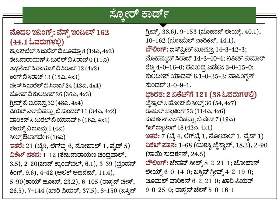 <p><strong>ಅಹಮದಾಬಾದ್</strong>: ‘ವೇಗದ ಜೋಡಿ’ ಮೊಹಮ್ಮದ್ ಸಿರಾಜ್ ಮತ್ತು ಜಸ್ಪ್ರೀತ್ ಬೂಮ್ರಾ ಅವರ ‘ಸುಂಟರಗಾಳಿ’ಯಂತಹ ಎಸೆತಗಳಿಗೆ ವೆಸ್ಟ್ ಇಂಡೀಸ್ ತಂಡವು ಸಾಧಾರಣ ಮೊತ್ತಕ್ಕೆ ಕುಸಿಯಿತು. ಅದರ ನಂತರ ಕೆ.ಎಲ್. ರಾಹುಲ್ ಅವರ ಚೆಂದದ ಅರ್ಧಶತಕ ಅರಳಿತು. </p><p>ಗುರುವಾರ ನರೇಂದ್ರ ಮೋದಿ ಕ್ರಿಕೆಟ್ ಕ್ರೀಡಾಂಗಣದಲ್ಲಿ ಆರಂಭವಾದ ವೆಸ್ಟ್ ಇಂಡೀಸ್ ಎದುರಿನ ಮೊದಲ ಟೆಸ್ಟ್ ಪಂದ್ಯದ ಪ್ರಥಮ ದಿನದಂದು ಆತಿಥೇಯ ತಂಡವು ಪಾರಮ್ಯ ಮೆರೆಯಿತು. </p><p>ಟಾಸ್ ಗೆದ್ದು ಬ್ಯಾಟಿಂಗ್ ಮಾಡಿದ ಪ್ರವಾಸಿ ಬಳಗವು 44.1 ಓವರ್ಗಳಲ್ಲಿ 162 ರನ್ ಗಳಿಸಿತು. ಸಿರಾಜ್ (40ಕ್ಕೆ4) ಮತ್ತು ಬೂಮ್ರಾ (32ಕ್ಕೆ3) ಅವರ ಬೌಲಿಂಗ್ ಮುಂದೆ ವಿಂಡೀಸ್ ಬ್ಯಾಟರ್ಗಳು ಶರಣಾದರು.</p><p>ಅದಕ್ಕುತ್ತರವಾಗಿ ದಿನದಾಟದ ಮುಕ್ತಾಯಕ್ಕೆ ಭಾರತ ತಂಡವು 38 ಓವರ್ಗಳಲ್ಲಿ 2 ವಿಕೆಟ್ಗಳಿಗೆ 121 ರನ್ ಗಳಿಸಿದೆ. ಕೆ.ಎಲ್. ರಾಹುಲ್ (ಬ್ಯಾಟಿಂಗ್ 53; 114ಎ, 4X6) ಮತ್ತು ನಾಯಕ ಶುಭಮನ್ ಗಿಲ್ (ಬ್ಯಾಟಿಂಗ್ 18; 42ಎ, 4X1) ಕ್ರೀಸ್ನಲ್ಲಿದ್ದಾರೆ. ಪ್ರಥಮ ಇನಿಂಗ್ಸ್ ಬಾಕಿ ಚುಕ್ತಾ ಮಾಡಲು 41 ರನ್ಗಳಷ್ಟೇ ಬಾಕಿ ಇವೆ. </p><p>ದಿನದಾಟದಲ್ಲಿ ಕೆಲಹೊತ್ತು ಮಳೆ ಕೂಡ ಬಂದು ಹೋಯಿತು. ಆದರೆ ರಾಹುಲ್ ಬ್ಯಾಟಿಂಗ್ ಲಯಕ್ಕೆ ಮಾತ್ರ ಯಾವುದೂ ಅಡ್ಡಿಯಾಗಲಿಲ್ಲ. ಅವರು ಮತ್ತು ಯಶಸ್ವಿ ಜೈಸ್ವಾಲ್ (36; 54ಎ, 4X7) ಮೊದಲ ವಿಕೆಟ್ ಜೊತೆಯಾಟದಲ್ಲಿ 68 ರನ್ ಸೇರಿಸಿ ಉತ್ತಮ ಆರಂಭ ನೀಡಿದರು. ಆದರೆ ಜೇಡನ್ ಸೀಲ್ಸ್ ಅವರ ಶಾರ್ಟ್ ಆಫ್ ಲೆಂಗ್ತ್ ಎಸೆತವನ್ನು ಕಟ್ ಮಾಡುವ ಭರದಲ್ಲಿ ವಿಕೆಟ್ಕೀಪರ್ ಶಾಯ್ ಹೋಪ್ ಅವರಿಗೆ ಕ್ಯಾಚ್ ಆದ ಜೈಸ್ವಾಲ್ ನಿರ್ಗಮಿಸಿದರು. </p><p>ಸಾಯಿ ಸುದರ್ಶನ್ (7;19ಎ) ಲಯ ಕಂಡುಕೊಳ್ಳುವ ಹಂತದಲ್ಲಿದ್ದಾಗಲೇ ಆಫ್ಸ್ಪಿನ್ನರ್ ರಾಸ್ಟನ್ ಚೇಸ್ ಎಸೆತದಲ್ಲಿ ಎಲ್ಬಿಡಬ್ಲ್ಯು ಬಲೆಗೆ ಬಿದ್ದರು. ಆದರೆ ಇನ್ನೊಂದು ಕಡೆ ತಾಳ್ಮೆ ಮತ್ತು ಏಕಾಗ್ರತೆಯಿಂದ ಬೌಲರ್ಗಳನ್ನು ಎದುರಿಸುತ್ತಿದ್ದ ರಾಹುಲ್ ಅವರ ಆಟದಲ್ಲಿ ಆತ್ಮವಿಶ್ವಾಸದಿಂದ ಕೂಡಿತ್ತು. ಅವರೊಂದಿಗೆ ಸೇರಿಕೊಂಡ ಗಿಲ್ ಕೂಡ ಚೆಂದದ ಹೊಡೆತಗಳನ್ನು ಪ್ರಯೋಗಿಸಿದರು. ಇಬ್ಬರೂ ಸೇರಿ ಮುರಿಯದ ಮೂರನೇ ವಿಕೆಟ್ ಜೊತೆಯಾಟದಲ್ಲಿ 31 ರನ್ ಸೇರಿಸಿದರು. </p><p><strong>ಸಿರಾಜ್–ಬೂಮ್ರಾ ಜೊತೆಯಾಟ</strong></p><p>ಊಟದ ವಿರಾಮಕ್ಕೂ ಮುಂಚಿನ ಅವಧಿಯಲ್ಲಿ ಸಿರಾಜ್ ಅವರು ಏಳು ಓವರ್ಗಳ ಸ್ಪೆಲ್ನಲ್ಲಿ ಮೂರು ವಿಕೆಟ್ ಗಳಿಸಿದರು. ಸಿರಾಜ್ ಅವರು ವಿರಾಮದ ನಂತರ ರಾಸ್ಟನ್ ಚೇಸ್ (24; 43ಎ) ಅವರ ವಿಕೆಟ್ ಪಡೆದ ರೀತಿ ಅಮೋಘವಾಗಿತ್ತು. ಆಫ್ಸ್ಟಂಪ್ ಹೊರಗೆ ಸ್ವಿಂಗ್ ಆದ ಚೆಂಡನ್ನು ಕೆಣಕಿದ ಚೇಸ್ ದಂಡ ತೆತ್ತರು. ಬ್ಯಾಟ್ಗೆ ಬಡಿದ ಚೆಂಡು ವಿಕೆಟ್ಕೀಪರ್ ಧ್ರುವ ಜುರೇಲ್ ಅವರಿಗೆ ಕ್ಯಾಚ್ ಆದರು. ಆದರೆ ‘ಪಂಚಗೊಂಚಲು’ ಸಾಧನೆ ಮಾಡುವ ಅವಕಾಶ ಸ್ವಲ್ಪದರಲ್ಲಿ ಅವರ ಕೈತಪ್ಪಿತು. </p><p>ಇನ್ನೊಂದು ಕಡೆಯಿಂದ ಬೂಮ್ರಾ ಕೂಡ ತಮ್ಮ ಲಯ ಕಂಡುಕೊಂಡರು. ಆರಂಭಿಕ ಬ್ಯಾಟರ್ ಜಾನ್ ಕ್ಯಾಂಪ್ಬೆಲ್ (8 ರನ್) ವಿಕೆಟ್ ಗಳಿಸಿದ ಅವರು ತಮ್ಮ ಇನ್ನೊಂದು ಸ್ಪೆಲ್ನಲ್ಲಿ ಮಧ್ಯಮ ಕ್ರಮಾಂಕಕ್ಕೆ ಪೆಟ್ಟುಕೊಟ್ಟರು. </p><p>ಎಡಗೈ ಸ್ಪಿನ್ನರ್ ಕುಲದೀಪ್ ಯಾದವ್ (25ಕ್ಕೆ2) ಮತ್ತು ವಾಷಿಂಗ್ಟನ್ ಸುಂದರ್ (9ಕ್ಕೆ1) ಕೂಡ ತಮ್ಮ ಕೈಚಳಕ ಮೆರೆದರು. </p>.<div><blockquote>ಹಸಿರು ಮೇಲ್ಮೈ ಇರುವ ಈ ಪಿಚ್ನಲ್ಲಿ ಬೌಲಿಂಗ್ ಮಾಡಲು ಉತ್ಸುಕನಾಗಿದ್ದೆ. ಭಾರತದಲ್ಲಿ ಈ ರೀತಿಯ ಪಿಚ್ಗಳು ಸಿಗುವುದು ಕಡಿಮೆ. ಹೋದ ಬಾರಿ ನ್ಯೂಜಿಲೆಂಡ್ ಎದುರಿನ ಪಂದ್ಯದಲ್ಲಿ ಬೆಂಗಳೂರಿನಲ್ಲಿ ಇಂತಹದೇ ಪಿಚ್ 
