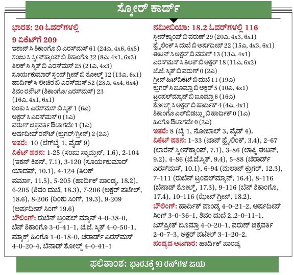 <p><strong>ನವದೆಹಲಿ:</strong> ಹಾರ್ದಿಕ್ ಪಾಂಡ್ಯ ಅವರ ಆಲ್ರೌಂಡ್ ಆಟದ ಬಲದಿಂದ ಹಾಲಿ ಚಾಂಪಿಯನ್ ಭಾರತ ತಂಡವು ಗುರುವಾರ ನಮೀಬಿಯಾ ಎದುರಿನ ಪಂದ್ಯದಲ್ಲಿ ಸುಲಭ ಜಯ ಸಾಧಿಸಿತು. </p><p>ಟಿ20 ವಿಶ್ವಕಪ್ ಟೂರ್ನಿಯಲ್ಲಿ ಆತಿಥೇಯ ಭಾರತ ತಂಡಕ್ಕೆ ಇದು ಎರಡನೇ ಜಯವಾಗಿದೆ. ಅರುಣ್ ಜೇಟ್ಲಿ ಕ್ರೀಡಾಂಗಣದಲ್ಲಿ ನಡೆದ ಪಂದ್ಯದಲ್ಲಿ ನಮೀಬಿಯಾ ಎದುರು 93 ರನ್ಗಳಿಂದ ಗೆದ್ದಿತು. </p><p>ಅಭಿಷೇಕ್ ಶರ್ಮಾ ಅವರಿಲ್ಲದೇ ಕಣಕ್ಕಿಳಿದ ಭಾರತ ತಂಡಕ್ಕೆ ಸಂಜು ಸ್ಯಾಮ್ಸನ್ ದೀರ್ಘ ಇನಿಂಗ್ಸ್ ಕಟ್ಟಿ<br>ಕೊಡಲಿಲ್ಲ. ಅವರ ಮೂರು ಸಿಕ್ಸರ್ಗಳ ಇನಿಂಗ್ಸ್ ಇನ್ಸ್ಟಾಗ್ರಾಮ್ ರೀಲ್ನಷ್ಟೇ ಅಲ್ಪಾಯುಷಿಯಾಯಿತು. ಆದರೆ ಇಶಾನ್ ಕಿಶನ್ ಅವರ ಬ್ಯಾಟಿಂಗ್ ವೆಬ್ ಸರಣಿಯಂತೆ ಪರಿಪೂರ್ಣ ಡ್ರಾಮಾ, ಸಾಹಸಗಳಿಂದ ಕೂಡಿತ್ತು. ಕಿಶನ್ ನಮೀಬಿಯಾ ದಾಳಿಯನ್ನು ಹುಡಿಗಟ್ಟಿದರು. 24 ಎಸೆತಗಳಲ್ಲಿ 61 ರನ್ ಗಳಿಸಿದರು. ಆದರೆ ನಮೀಬಿಯಾ ತಂಡದ ನಾಯಕ ಜೆರಾರ್ಡ್ ಎರಸ್ಮಸ್ ಅವರ ಸೈಡ್ ಆರ್ಮ್ ಆಫ್ಬ್ರೇಕ್ ಬೌಲಿಂಗ್ ಮುಂದೆ ಆತಿಥೇಯ ಬ್ಯಾಟರ್ಗಳು ಪರದಾಡಿದ್ದು ಕೂಡ ನಿಜ. ಭಾರತ ತಂಡವು 9 ವಿಕೆಟ್ಗಳಿಗೆ 209 ರನ್ ಗಳಿಸಿತು. ಹಾರ್ದಿಕ್ ಕಿಶನ್ ಅವರು ಐದು ಸಿಕ್ಸ್ ಮತ್ತು ಅರ್ಧ ಡಜನ್ ಬೌಂಡರಿಗಳನ್ನು ದಾಖಲಿಸಿದರು. ಇದರೊಂದಿಗೆ ಕೇವಲ 20 ಎಸೆತಗಳಲ್ಲಿ 50 ರನ್ ಸೇರಿಸಿದರು.</p><p>ಈ ಅಡಿಪಾಯದ ಮೇಲೆ ಮಧ್ಯಮ ಕ್ರಮಾಂಕದ ಬ್ಯಾಟರ್ ಹಾರ್ದಿಕ್ ಪಾಂಡ್ಯ (52; 28ಎ) ಅವರು ದೊಡ್ಡ ಮೊತ್ತ ಪೇರಿಸಲು ಶಕ್ತಿ ತುಂಬಿದರು. ಬೌಲಿಂಗ್ನಲ್ಲಿಯೂ ಮಿಂಚಿದ ಅವರು (21ಕ್ಕೆ2) ನಮೀಬಿಯಾ ತಂಡವು 18.2 ಓವರ್ಗಳಲ್ಲಿ 116 ರನ್ ಗಳಿಸಿ ಎಲ್ಲ ವಿಕೆಟ್ ಕಳೆದುಕೊಂಡಿತು. ವರುಣ್ ಚಕ್ರವರ್ತಿ (7ಕ್ಕೆ3) ಮತ್ತು ಅಕ್ಷರ್ ಪಟೇಲ್ (20ಕ್ಕೆ2) ಚೆಂದದ ಬೌಲಿಂಗ್ ಮಾಡಿದರು.</p><p>ಎರಸ್ಮಸ್ ಸೈಡ್ ಆರ್ಮ್ ಬೌಲಿಂಗ್: ಭಾರತದ ಬಲಿಷ್ಠ ಬ್ಯಾಟಿಂಗ್ ಕ್ರಮಾಂಕದ ಎದುರು ನಮೀಬಿಯಾದ ಎರಸ್ಮಸ್ (20ಕ್ಕೆ4) ಅವರು ಅಮೋಘವಾದ ಬೌಲಿಂಗ್ ಮಾಡಿದರು. ಎರಸ್ಮಸ್ ಅವರು ಸೈಡ್ ಆರ್ಮ್ ಎಸೆತಗಳನ್ನೂ ಹಾಕಿದರು.</p><p>ಅಲ್ಲದೇ ಕೆಲವು ಎಸೆತಗಳನ್ನು ಕ್ರೀಸ್ಗಿಂತ ಸುಮಾರು ಎರಡು ಯಾರ್ಡ್ಗಳನ್ನು ಹಿಂದಿನಿಂದಲೇ ಬೌಲಿಂಗ್ ಮಾಡಿದರು. ಇಂತಹದೇ ಒಂದು ಲೆಂಗ್ತ್ ಕಡಿಮೆಯಾದ ಎಸೆತದಲ್ಲಿ ಮುನ್ನುಗ್ಗಿ ಹೊಡೆಯಲು ಹೋದ ತಿಲಕ್ ವರ್ಮಾ (25 ರನ್) ಔಟಾದರು. </p><p>ಅರುಣ್ ಜೇಟ್ಲಿ ಕ್ರೀಡಾಂಗಣದ ಸಪಾಟಾದ ಪಿಚ್ನಲ್ಲಿ ಸಂಜು ಸ್ಯಾಮ್ಸನ್ ಆಡಿದ್ದು 8 ಎಸೆತಗಳನ್ನು ಮಾತ್ರ. ಅದರಲ್ಲಿ 3 ಸಿಕ್ಸರ್ ಮತ್ತು 1 ಬೌಂಡರಿಯಿದ್ದ 22 ರನ್ ಗಳಿಸಿದರು. ಉತ್ತಮ ಲಯದಲ್ಲಿ ಸಾಗುತ್ತಿದ್ದ ಅವರು ಬೆನ್ ಶಿಕೊಂಗೊ ಎಸೆತದಲ್ಲಿ ತಪ್ಪಾಗಿ ಅಂದಾಜಿಸಿ ದೊಡ್ಡ ಹೊಡೆತ ಆಡಿದರು. ಲಾರೆನ್ ಸ್ಟೀನ್ ಕ್ಯಾಂಪ್ ಕ್ಯಾಚ್ ಪಡೆದರು. </p><p>ನಾಯಕ ಸೂರ್ಯಕುಮಾರ್ ಯಾದವ್ ಇನಿಂಗ್ಸ್ನ ಶ್ರೇಷ್ಠ ಎಸೆತದಲ್ಲಿ ದಂಡ ತೆತ್ತರು. ಎಡಗೈ ಸ್ಪಿನ್ನರ್ ಬರ್ನಾಡ್ ಸ್ಕೋಲ್ಜ್ ಅವರ ಎಸೆತವೊಂದು ಡಿಪ್ ಆಗಿ ತಿರುವು ಪಡೆಯಿತು. ಸೂರ್ಯ ಅದನ್ನು ಮುಂದಡಿ ಇಟ್ಟು ಆಡಲು ಯತ್ನಿಸಿ ಬೀಡ್ ಆದರು. ವಿಕೆಟ್ಕೀಪರ್ ಝೇನ್ ಗ್ರೀನ್ ಚುರುಕಾಗಿ ಸ್ಟಂಪಿಂಗ್ ಮಾಡಿದರು. ಸೂರ್ಯ ಒಂದು ಸಿಕ್ಸರ್ ಸಹಿತ 12 ರನ್ ಬಾರಿಸಿದರು. </p><p>ಹಾರ್ದಿಕ್ ಮತ್ತು ಶಿವಂ ದುಬೆ (23; 16ಎ, 4X1, 6X1) ಜೊತೆಗೂಡಿ 5ನೇ ವಿಕೆಟ್ ಜೊತೆಯಾಟದಲ್ಲಿ 81 (39ಎ) ರನ್ ಸೇರಿಸಿದರು. ಇದರಿಂದಾಗಿ ತಂಡದ ಮೊತ್ತವು ‘ದ್ವಿಶತಕ’ದ ಗಡಿ ದಾಟಿತು. </p><p>ಈ ಹಂತದಲ್ಲಿ ಮತ್ತೊಮ್ಮೆ ಕೈಚಳಕ ಮೆರೆದ ಎರಸ್ಮಸ್ ಒಂದೇ ಓವರ್ನಲ್ಲಿ ಹಾರ್ದ