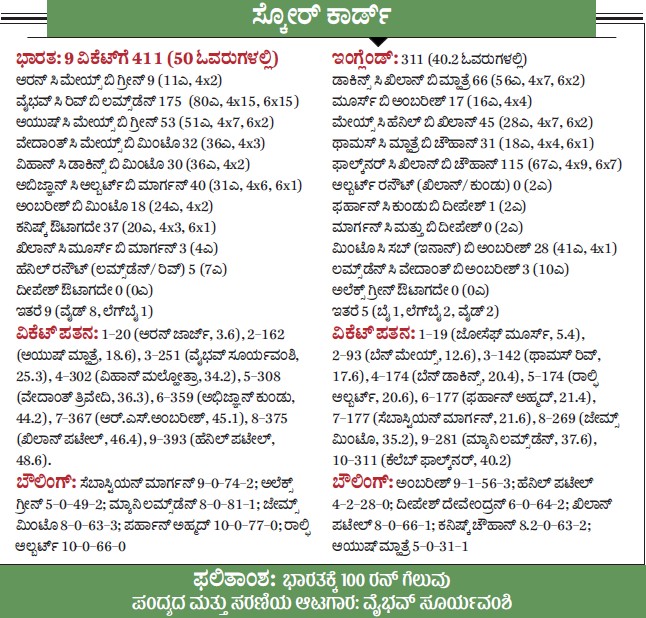 <p><strong>ಹರಾರೆ</strong>: ಮಿಂಚಿನ ವೇಗದಲ್ಲಿ ಸಿಕ್ಸರ್, ಬೌಂಡರಿಗಳ ಚಿತ್ತಾರ ಬಿಡಿಸಿದ ‘ವಂಡರ್ ಕಿಡ್’ ವೈಭವ್ ಸೂರ್ಯವಂಶಿ ಯುವ ವಿಶ್ವಕಪ್ ಇತಿಹಾಸದಲ್ಲೇ ಮೈನವಿರೇಳಿಸುವ ಇನಿಂಗ್ಸ್ ಆಡಿದರು. ಅವರ ಸ್ಫೋಟಕ 175 ರನ್ಗಳ ನೆರವಿನಿಂದ ಭಾರತ ತಂಡ ಶುಕ್ರವಾರ ನಡೆದ ಫೈನಲ್ನಲ್ಲಿ ಇಂಗ್ಲೆಂಡ್ ತಂಡವನ್ನು ಬರೋಬ್ಬರಿ 100 ರನ್ಗಳಿಂದ ಸೋಲಿಸಿತು.</p><p>ಆಯುಷ್ ಮ್ಹಾತ್ರೆ ನೇತೃತ್ವದ ಚಿಗುರುಮೀಸೆಯ ಹುಡುಗರ ಪಡೆ ದಾಖಲೆಯ ಆರನೇ ಬಾರಿ ಟ್ರೋಫಿ ಎತ್ತಿಹಿಡಿಯಿತು.</p><p>ಈಗಾಗಲೇ ಕಿರಿಯರ ಕ್ರಿಕೆಟ್ನಲ್ಲಿ ಛಾಪು ಮೂಡಿಸಿರುವ 14 ವರ್ಷ ವಯಸ್ಸಿನ ಸೂರ್ಯವಂಶಿ ಕೇವಲ 80 ಎಸೆತಗಳಲ್ಲಿ ದಾಖಲೆಯ 175 ರನ್ (4x15, 6x15) ಸಿಡಿಸಿದರು. ಇದರಲ್ಲಿ 150 ರನ್ಗಳು ಬೌಂಡರಿ, ಸಿಕ್ಸರ್ಗಳ ನೆರವಿನಿಂದಲೇ ಹರಿದುಬಂದವು. ಇಂಗ್ಲೆಂಡ್ ಆಟಗಾರರು ಬಸವಳಿದರು. ಭಾರತ 9 ವಿಕೆಟ್ಗೆ 411 ರನ್ಗಳ ಭಾರಿ ಮೊತ್ತ ದಾಖಲಿಸಿತು. ಹರಾರೆ ಸ್ಪೋರ್ಟ್ಸ್ ಕ್ಲಬ್ ಕ್ರೀಡಾಂಗಣದಲ್ಲಿ ಟಾಸ್ ಗೆದ್ದು ಬೌಲಿಂಗ್ ಆಯ್ಕೆ ಮಾಡಿಕೊಂಡಿದ್ದ ಇಂಗ್ಲೆಂಡ್ ಆಗಲೇ ಪಂದ್ಯವನ್ನು ಅರ್ಧ ಸೋತಂತಾಗಿತ್ತು.</p><p>ಇಂಗ್ಲೆಂಡ್ ಬೇಗನೇ ರನ್ ಗಳಿಸಿದರೂ ಗುರಿ ಬಲು ದೊಡ್ಡದಾಗಿತ್ತು. ಅಂತಿಮವಾಗಿ 40.2 ಓವರುಗಳಲ್ಲಿ 311 ರನ್ಗಳಿಗೆ ಆಲೌಟ್ ಆಯಿತು. 67 ಎಸೆತಗಳಲ್ಲಿ 115 ರನ್ ಹೊಡೆದ ಕೆಲೆಬ್ ಫಾಲ್ಕ್ನರ್ ಅವರೊಬ್ಬರಿಂದ ಪ್ರತಿರೋಧ ಎದುರಾಯಿತು. ಸೋಲಿನ ಅಂತರವೂ ಇಳಿಯಿತು.</p><p>ಆಕ್ರಮಣಕಾರಿ ಆಟವಾಡುವ ತಮ್ಮ ಕೌಶಲವನ್ನು ಈ ಮಹತ್ವದ ಪಂದ್ಯದಲ್ಲೂ ಪ್ರಸ್ತುತಪಡಿಸಿದ ಸೂರ್ಯವಂಶಿ ಕೇವಲ 55 ಎಸೆತಗಳಲ್ಲಿ ಶತಕ ದಾಟಿದರು. ಇದು ಈ ಟೂರ್ನಿಯ ಇತಿಹಾಸದಲ್ಲಿ ಎರಡನೇ ಅತಿ ವೇಗದ ಶತಕ ಎನಿಸಿತು. ಅವರು ಗಳಿಸಿದ 175 ರನ್ ಟೂರ್ನಿಯ ಗರಿಷ್ಠ ವೈಯಕ್ತಿಕ ಮೊತ್ತವೆನಿಸಿತು. ಭಾರತ ಗಳಿಸಿದ ಮೊತ್ತ ಫೈನಲ್ನಲ್ಲಿ ದಾಖಲಾದ ಅತಿ ಹೆಚ್ಚಿನ ಮೊತ್ತ ಎನಿಸಿತು. ಭಾರತದ ಮೊತ್ತ 25 ಓವರುಗಳಲ್ಲೇ 200 ಗಡಿ ದಾಟಿತ್ತು.</p><p>ನಾಯಕ ಆಯುಷ್ (53) ಜೊತೆಗೆ ಎರಡನೇ ವಿಕೆಟ್ಗೆ 142 ರನ್ ಸೇರಿಸಿದ ಬಿಹಾರದ ಹುಡುಗ, ಮೂರನೇ ವಿಕೆಟ್ಗೆ ವೇದಾಂತ್ ತ್ರಿವೇದಿ ಜೊತೆಗೆ (36, 32ಎ) ಕೇವಲ 7.2 ಓವರುಗಳಲ್ಲಿ 89 ರನ್ ಸೇರಿಸಿದರು. ಮೊದಲ ಅರ್ಧ ಶತಕಕ್ಕೆ 32 ಎಸೆತ ತೆಗೆದುಕೊಂಡ ಅವರು ನಂತರದ 50 ರನ್ನಿಗೆ 23 ಎಸೆತ ತೆಗೆದುಕೊಂಡರು.</p><p>ಯುವ ಏಕದಿನ ಇನಿಂಗ್ಸ್ನಲ್ಲಿ ಅತ್ಯಧಿಕ ಸಿಕ್ಸರ್ಗಳನ್ನು ಬಾರಿಸಿದ ದಾಖಲೆ ಅವರದಾಯಿತು. ಅವರ ಅಬ್ಬರದಿಂದ ಭಾರತ ಓವರಿಗೆ 10 ರನ್ಗಳಂತೆ ಗಳಿಸುತ್ತಾ ಹೋಯಿತು. 26ನೇ ಓವರಿನಲ್ಲಿ ಅವರು ವಿಕೆಟ್ ಕೀಪರ್ಗೆ ಕ್ಯಾಚಿತ್ತ ನಂತರ (3 ವಿಕೆಟ್ಗೆ 251) ಭಾರತ ರನ್ ವೇಗ ಕಡಿಮೆಯಾಯಿತು. ಆದರೆ ಆ ಬುನಾದಿಯಲ್ಲಿ 400 ಮೊತ್ತ ದಾಟಲು ಸಾಧ್ಯವಾಯಿತು.</p>.<div><p><strong>ಪ್ರಜಾವಾಣಿ ಆ್ಯಪ್ ಇಲ್ಲಿದೆ: <a href="https://play.google.com/store/apps/details?id=com.tpml.pv">ಆಂಡ್ರಾಯ್ಡ್ </a>| <a href="https://apps.apple.com/in/app/prajavani-kannada-news-app/id1535764933">ಐಒಎಸ್</a> | <a href="https://whatsapp.com/channel/0029Va94OfB1dAw2Z4q5mK40">ವಾಟ್ಸ್ಆ್ಯಪ್</a>, <a href="https://www.twitter.com/prajavani">ಎಕ್ಸ್</a>, <a href="https://www.fb.com/prajavani.net">ಫೇಸ್ಬುಕ್</a> ಮತ್ತು <a href="https://www.instagram.com/prajavani">ಇನ್ಸ್ಟಾಗ್ರಾಂ</a>ನಲ್ಲಿ ಪ್ರಜಾವಾಣಿ ಫಾಲೋ ಮಾಡಿ.</strong></p></div>
