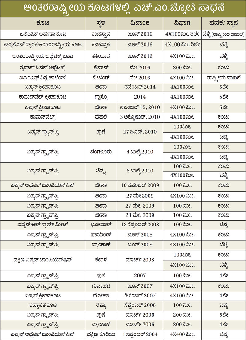 <div> ಮಿಂಚಿನ ವೇಗದ ಮೂಲಕ ಎದುರಾಳಿಗಳನ್ನು ಹಿಮ್ಮೆಟ್ಟಿಸಬಲ್ಲ ಸಾಮರ್ಥ್ಯ ಹೊಂದಿರುವ ಎಚ್.ಎಂ. ಜ್ಯೋತಿ ಭಾರತದ ಅಥ್ಲೆಟಿಕ್ಸ್ ಲೋಕದಲ್ಲಿ ಅಚ್ಚಳಿಯದ ಹೆಜ್ಜೆ ಗುರುತುಗಳನ್ನು ಮೂಡಿಸಿದ್ದಾರೆ.<div> </div><div> 100, 200, 400 ಮೀಟರ್ಸ್ ಓಟ ಮತ್ತು 4X100 ಮೀಟರ್ಸ್ ರಿಲೇ ಸ್ಪರ್ಧೆಯಲ್ಲಿ ಚಿತ್ರದುರ್ಗ ಜಿಲ್ಲೆಯ ಹಿರಿಯೂರಿನ ಜ್ಯೋತಿ ಅವರ ಸಾಧನೆ ಅನನ್ಯ. </div><div> ಕಾಮನ್ವೆಲ್ತ್ ಕ್ರೀಡಾಕೂಟ, ಏಷ್ಯನ್ ಚಾಂಪಿಯನ್ಷಿಪ್, ಏಷ್ಯನ್ ಅಥ್ಲೆಟಿಕ್ ಚಾಂಪಿಯನ್ಷಿಪ್ಗಳಲ್ಲಿ ಪದಕ ಗೆದ್ದ ಹೆಗ್ಗಳಿಕೆ ಹೊಂದಿರುವ ಜ್ಯೋತಿ ಏಷ್ಯನ್ ಕ್ರೀಡಾಕೂಟದಲ್ಲಿ ಫೈನಲ್ ಪ್ರವೇಶಿಸಿ ಸೈ ಎನಿಸಿಕೊಂಡಿದ್ದಾರೆ. ರಾಷ್ಟ್ರೀಯ ಚಾಂಪಿಯನ್ಷಿಪ್ನಲ್ಲೂ ಪದಕಗಳ ಬೇಟೆಯಾಡಿರುವ ಅವರು 100 ಮತ್ತು 200 ಮೀಟರ್ಸ್ ಓಟಗಳಲ್ಲಿ ಕ್ರಮವಾಗಿ 11.30 ಹಾಗೂ 23.80 ಸೆಕೆಂಡುಗಳಲ್ಲಿ ಗುರಿ ಮುಟ್ಟಿ ಕರ್ನಾಟಕದ ಮಟ್ಟಿಗೆ ಹೊಸ ದಾಖಲೆ ನಿರ್ಮಿಸಿದ್ದಾರೆ. </div><div> </div><div> 4X100 ಮೀಟರ್ಸ್ ರಿಲೇಯಲ್ಲಿ ರಾಷ್ಟ್ರೀಯ ದಾಖಲೆ ಬರೆದಿರುವ ಕೀರ್ತಿಗೂ ಭಾಜನರಾಗಿರುವ ಅವರು ‘ಪ್ರಜಾವಾಣಿ’ ಜೊತೆ ತಮ್ಮ ಮನದ ಮಾತುಗಳನ್ನು ಬಿಚ್ಚಿಟ್ಟಿದ್ದಾರೆ.</div><div> </div><div> <strong> * ಅಥ್ಲೆಟಿಕ್ಸ್ಗೆ ಅಡಿ ಇಟ್ಟ ಬಗ್ಗೆ ಹೇಳಿ?</strong></div><div> ಚಿಕ್ಕವಳಾಗಿದ್ದಾಗ ಅಕ್ಕ ಸರಿತಾ ವಿವಿಧ ಕ್ರೀಡಾಕೂಟಗಳಲ್ಲಿ ಭಾಗವಹಿಸುತ್ತಿದ್ದರು. ಆಗ ಅವರಿಗೆ ಸಾಕಷ್ಟು ಬಹುಮಾನಗಳು ಸಿಗುತ್ತಿದ್ದವು. ಅದನ್ನು ಕಂಡು ನನ್ನಲ್ಲೂ ಅವಳಂತೆ ಬಹುಮಾನ ಗೆಲ್ಲಬೇಕೆಂಬ ಆಸೆ ಚಿಗುರೊಡೆದಿತ್ತು. ಹಬ್ಬ, ಜಾತ್ರೆ ಹೀಗೆ ವಿಶೇಷ ಸಂದರ್ಭ ಗಳಲ್ಲಿ ನಮ್ಮೂರಿನಲ್ಲಿ ವಿವಿಧ ಸ್ಪರ್ಧೆಗಳನ್ನು ಏರ್ಪಡಿಸುತ್ತಿದ್ದರು. ಒಮ್ಮೆ ನಾನು ಓಟದ ಸ್ಪರ್ಧೆಯಲ್ಲಿ ಭಾಗವಹಿಸಿ ಅಕ್ಕನನ್ನೇ ಸೋಲಿಸಿ ಪ್ರಶಸ್ತಿ ಗೆದ್ದಿದ್ದೆ. ಅಲ್ಲಿ ನನ್ನ ಸಾಮರ್ಥ್ಯ ಕಂಡವರು ಪ್ರಶಂಸೆಯ ಮಾತುಗಳನ್ನಾಡಿದ್ದರು. ಅವರ ಮೆಚ್ಚುಗೆಯೇ ಸ್ಫೂರ್ತಿಯಾಯಿತು. 8ನೇ ತರಗತಿಗೆ ಮನೆಯವರು ಬೆಂಗಳೂರಿನ ವಿದ್ಯಾನಗರದ ಕ್ರೀಡಾ ಹಾಸ್ಟೆಲ್ಗೆ ಸೇರಿಸಿದರು. ಅಲ್ಲಿಂದ ಕ್ರೀಡಾ ಬದುಕಿನ ಪಯಣ ಆರಂಭವಾಯಿತು.</div><div> </div><div> <strong>* ಆರಂಭದ ದಿನಗಳ ಬಗ್ಗೆ ಹೇಳಿ?</strong></div><div> ಕ್ರೀಡಾ ನಿಲಯದಲ್ಲಿ ಮಂಜುನಾಥ್ ಎಂಬ ಕೋಚ್ ಇದ್ದರು. ಅವರು ನನ್ನ ಪ್ರತಿಭೆಗೆ ಸಾಣೆ ಹಿಡಿದರು. ಬಳಿಕ ರವಿ ಅವರೂ ಕೂಡಾ ಹಲವು ಕೌಶಲಗಳನ್ನು ಹೇಳಿಕೊಟ್ಟರು. ಅವರ ಮಾರ್ಗದರ್ಶನ ದಲ್ಲಿ ನೈಪುಣ್ಯ ಸಾಧಿಸಿ ಜೂನಿಯರ್ ಟೂರ್ನಿಗಳಲ್ಲಿ ಅಮೋಘ ಸಾಮರ್ಥ್ಯ ತೋರಿದ್ದೆ. ಒಮ್ಮೆ ಭಾರತ ತಂಡದ ಕೋಚ್ ಆರ್. ಎಸ್. ಸಿಧು ಅವರು ನನ್ನನ್ನು ನೋಡಿ ನೀನು ತುಂಬಾ ಎತ್ತರವಾಗಿದ್ದೀಯಾ. 400 ಮೀಟರ್ಸ್ ಓಟದೆಡೆ ಹೆಚ್ಚು ಗಮನ ನೀಡಿ ಅದರಲ್ಲಿಯೇ ಮುಂದುವರಿ ಎಂದು ಸಲಹೆ ನೀಡಿದ್ದರು. ಕ್ರಮೇಣ ನಾನು ಸೀನಿಯರ್ ತಂಡದ ತರಬೇತಿ ಶಿಬಿರಕ್ಕೂ ಆಯ್ಕೆಯಾದೆ. 2004ರಲ್ಲಿ ದಕ್ಷಿಣ ಕೊರಿಯಾದಲ್ಲಿ ನಡೆದಿದ್ದ ಏಷ್ಯನ್ ಅಥ್ಲೆಟಿಕ್ ಚಾಂಪಿಯನ್ಷಿಪ್ನ 4X400 ಮೀಟರ್ಸ್ ರಿಲೇಯಲ್ಲಿ ಭಾಗವಹಿಸಿ ಚಿನ್ನ ಗೆದ್ದಿದ್ದೆ. ನನ್ನ ಕ್ರೀಡಾ ಬದುಕಿಗೆ ಹೊಸ ತಿರುವು ಸಿಕ್ಕಿದ್ದು ಆಗಲೇ .</div><div> </div><div> <strong>* ಅಥ್ಲೀಟ್ ಆಗಬೇಕು ಅಂದುಕೊಂಡಿದ್ದೇಕೆ?</strong></div><div> ಅಥ್ಲೀಟ್ ಆಗಲೇಬೇಕು ಎಂದು ಅಂದುಕೊಂಡಿರಲಿಲ್ಲ. ಶಾಲಾ ದಿನಗಳಲ್ಲಿ ಟ್ರಿಪಲ್ ಜಂಪ್ ಸೇರಿದಂತೆ ಎಲ್ಲಾ ಸ್ಪರ್ಧೆಗಳಲ್ಲೂ ಭಾಗವಹಿಸುತ್ತಿದ್ದೆ. ತುಂಬಾ ಚೆನ್ನಾಗಿ ಓಡುತ್ತಿದ್ದುದರಿಂದ ಇದರಲ್ಲಿಯೇ ಮುಂದುವರಿಯುವಂತೆ ಕೋಚ್ಗಳು ಸಲಹೆ ನೀಡಿದ್ದರು. 