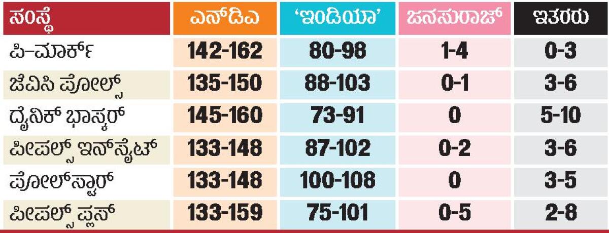 <p>ಬಿಹಾರ ಚುನಾವಣೆಯ ಮತಗಟ್ಟೆ ಸಮೀಕ್ಷೆಗಳು ಮಂಗಳವಾರ ಹೊರಬಿದ್ದಿವೆ. ಎಲ್ಲ ಸಮೀಕ್ಷೆಗಳೂ ಎನ್ಡಿಎ ಪಾಳಯಕ್ಕೆ ಬಹುಮತ ನೀಡಿವೆ.</p><p>‘ಇಂಡಿಯಾ’ ಕೂಟವು ಬಹುಮತದಿಂದ ದೂರವೇ ಇರಲಿದೆ ಎಂದೂ ಹೇಳಿವೆ. ಹೊಸದಾಗಿ ಬಿಹಾರ ರಾಜಕಾರಣಕ್ಕೆ ಪ್ರವೇಶ ಪಡೆದಿದ್ದ, ಪ್ರಶಾಂತ್ ಕಿಶೋರ್ ಅವರ ಜನ ಸುರಾಜ್ ಪಕ್ಷವು ಖಾತೆ ತೆರೆಯಲಿದೆ ಎಂದು ಕೆಲವು ಸಮೀಕ್ಷೆಗಳು ಹೇಳಿವೆ.</p><p>ಮುಂದಿನ ಮುಖ್ಯಮಂತ್ರಿ ಯಾರಾಗಬಹುದು ಎಂದು ‘ಪೀಪಲ್ಸ್ ಪಲ್ಸ್’ ಸಂಸ್ಥೆ ನಡೆಸಿದ ಸಮೀಕ್ಷೆಯಲ್ಲಿ ‘ಇಂಡಿಯಾ’ದ ಮುಖ್ಯಮಂತ್ರಿ ಅಭ್ಯರ್ಥಿ ತೇಜಸ್ವಿ ಯಾದವ್ ಅವರಿಗೆ ಶೇ 32ರಷ್ಟು ಮತಗಳು ಬಂದಿವೆ. ಎರಡನೇ ಸ್ಥಾನದಲ್ಲಿರುವ ಮುಖ್ಯಮಂತ್ರಿ ನಿತೀಶ್ ಕುಮಾರ್ ಅವರು ಶೇ 30ರಷ್ಟು ಮತ ಪಡೆದಿದ್ದಾರೆ</p>.<div><p><strong>ಪ್ರಜಾವಾಣಿ ಆ್ಯಪ್ ಇಲ್ಲಿದೆ: <a href="https://play.google.com/store/apps/details?id=com.tpml.pv">ಆಂಡ್ರಾಯ್ಡ್ </a>| <a href="https://apps.apple.com/in/app/prajavani-kannada-news-app/id1535764933">ಐಒಎಸ್</a> | <a href="https://whatsapp.com/channel/0029Va94OfB1dAw2Z4q5mK40">ವಾಟ್ಸ್ಆ್ಯಪ್</a>, <a href="https://www.twitter.com/prajavani">ಎಕ್ಸ್</a>, <a href="https://www.fb.com/prajavani.net">ಫೇಸ್ಬುಕ್</a> ಮತ್ತು <a href="https://www.instagram.com/prajavani">ಇನ್ಸ್ಟಾಗ್ರಾಂ</a>ನಲ್ಲಿ ಪ್ರಜಾವಾಣಿ ಫಾಲೋ ಮಾಡಿ.</strong></p></div>