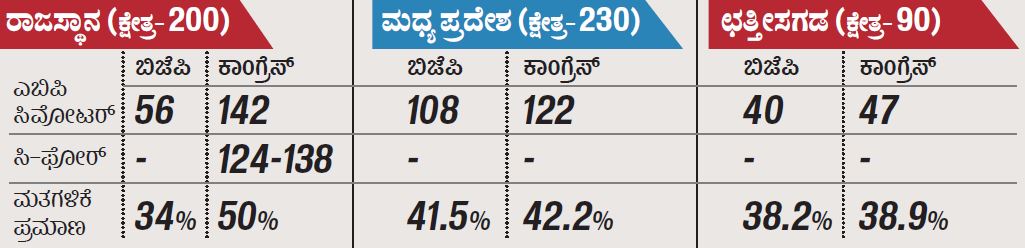 <p><strong>ನವದೆಹಲಿ:</strong> ಬಿಜೆಪಿ ಅಧಿಕಾರದಲ್ಲಿರುವ ರಾಜಸ್ಥಾನ, ಮಧ್ಯ ಪ್ರದೇಶ ಮತ್ತು ಛತ್ತೀಸಗಡ ರಾಜ್ಯಗಳು ಕಾಂಗ್ರೆಸ್ ಪಾಲಾಗಲಿವೆ ಎಂದು ಚುನಾವಣಾ ಪೂರ್ವ ಜನಮತ ಸಮೀಕ್ಷೆಗಳು ಭವಿಷ್ಯ ನುಡಿದಿವೆ.</p>.<p>ಐದು ರಾಜ್ಯಗಳ ಚುನಾವಣಾ ದಿನಾಂಕ ಪ್ರಕಟವಾದ ಬೆನ್ನಲ್ಲೇ ಹೊರಬಿದ್ದಿರುವ ಸಮೀಕ್ಷೆಗಳು ಬಿಜೆಪಿಗೆ ಆಘಾತಕಾರಿ ಸುದ್ದಿ ನೀಡಿವೆ.</p>.<p>ರಾಜಸ್ಥಾನದಲ್ಲಿ ಕಾಂಗ್ರೆಸ್ ನಿಚ್ಚಳ ಬಹುಮತದೊಂದಿಗೆ ಅಧಿಕಾರಕ್ಕೆ ಬರಲಿದೆ ಎಂದು ಎಬಿಪಿ ಸುದ್ದಿಸಂಸ್ಥೆ– ಸಿ ವೋಟರ್ ಮತ್ತು ಸಿ–ಫೋರ್ ಪ್ರತ್ಯೇಕವಾಗಿ ನಡೆಸಿರುವ ಸಮೀಕ್ಷೆಗಳು ಸ್ಪಷ್ಟವಾಗಿ ಹೇಳಿವೆ.</p>.<p>ಎರಡೂ ಪಕ್ಷಗಳ ಮತಗಳಿಕೆ ಪ್ರಮಾಣದಲ್ಲೂ ಭಾರಿ ಏರುಪೇರಾಗುವ ಸಾಧ್ಯತೆ ಇದೆ ಎಂದು ಸಮೀಕ್ಷೆಗಳು ಸುಳಿವು ನೀಡಿವೆ.</p>.<p>15 ವರ್ಷಗಳಿಂದ ಬಿಜೆಪಿ ಅಧಿಕಾರದಲ್ಲಿರುವ ಮಧ್ಯ ಪ್ರದೇಶ, ಛತ್ತೀಸಗಡ ರಾಜ್ಯಗಳಲ್ಲಿ ಬಿಜೆಪಿ ಮತ್ತು ಕಾಂಗ್ರೆಸ್ ನಡುವೆ ಸಮಬಲದ ಪೈಪೋಟಿ ಕಾಣುತ್ತಿದೆ. ಆದರೂ, ಕಾಂಗ್ರೆಸ್ ಸ್ವಲ್ಪ ಮುನ್ನಡೆ ಸಾಧಿಸಲಿದೆ. ಮತಗಳಿಕೆ ಪ್ರಮಾಣದಲ್ಲೂ ಹೆಚ್ಚಿನ ವ್ಯತ್ಯಾಸ ಕಾಣುತ್ತಿಲ್ಲ.</p>.<p>ಸಿ–ಫೋರ್ ಸಮೀಕ್ಷೆ ರಾಜಸ್ಥಾನಕ್ಕೆ ಮಾತ್ರ ಸೀಮಿತವಾಗಿದೆ. ಎಬಿಪಿ ಸುದ್ದಿಸಂಸ್ಥೆ ಮತ್ತು ಸಿ–ವೋಟರ್ ಸಂಸ್ಥೆ ಮೂರೂ ರಾಜ್ಯಗಳಲ್ಲಿ ಸಮೀಕ್ಷೆ ನಡೆಸಿವೆ.</p>.<p><strong>ಪೈಲಟ್, ಚೌಹಾಣ್,ರಮಣ್ ಸಿಂಗ್ ಪರ ಒಲವು</strong></p>.<p>ರಾಜಸ್ಥಾನದ ಮುಖ್ಯಮಂತ್ರಿ ಸ್ಥಾನಕ್ಕೆ ಬಿಜೆಪಿಯ ವಸುಂಧರಾ ರಾಜೆ ಸಿಂಧಿಯಾ ಅವರಿಗಿಂತ ಕಾಂಗ್ರೆಸ್ ಅಧ್ಯಕ್ಷ ಸಚಿನ್ ಪೈಲಟ್ ಸೂಕ್ತ ಎಂದು ಹೆಚ್ಚಿನ ಜನರು ಹೇಳಿದ್ದಾರೆ. ಮಾಜಿ ಮುಖ್ಯಮಂತ್ರಿ ಅಶೋಕ್ ಗೆಹ್ಲೋಟ್ ಮೂರನೇ ಕ್ರಮಾಂಕದಲ್ಲಿದ್ದಾರೆ.</p>.<p>ಆಡಳಿತ ವಿರೋಧಿ ಅಲೆಯ ಹೊರತಾಗಿಯೂ ಮಧ್ಯ ಪ್ರದೇಶ ಮತ್ತು ಛತ್ತೀಸಗಡದಲ್ಲಿ ಶಿವರಾಜ್ ಸಿಂಗ್ ಚೌಹಾಣ್ ಮತ್ತು ರಮಣ್ ಸಿಂಗ್ ಅವರು ಮುಖ್ಯಮಂತ್ರಿ ಸ್ಥಾನಕ್ಕೆ ಸೂಕ್ತ ಎಂಬ ಅಭಿಪ್ರಾಯ ವ್ಯಕ್ತವಾಗಿದೆ.</p>.<p><strong>ಮುಖ್ಯಮಂತ್ರಿ ಹುದ್ದೆಗೆ ಯಾರು ಸೂಕ್ತ?</strong></p>.<p><strong>ರಾಜಸ್ಥಾನ</strong></p>.<p><strong>ಅಭ್ಯರ್ಥಿ–ಎಬಿಪಿಸಿವೋಟರ್ – ಸಿ ಫೋರ್</strong></p>.<p>ಸಚಿನ್ ಪೈಲಟ್–36 – 32</p>.<p>ವಸುಂಧರಾ ರಾಜೆ ಸಿಂಧಿಯಾ– 27 – 27</p>.<p>ಅಶೋಕ್ ಗೆಹ್ಲೋಟ್– 24– 23</p>.<div><p><strong>ಪ್ರಜಾವಾಣಿ ಆ್ಯಪ್ ಇಲ್ಲಿದೆ: <a href="https://play.google.com/store/apps/details?id=com.tpml.pv">ಆಂಡ್ರಾಯ್ಡ್ </a>| <a href="https://apps.apple.com/in/app/prajavani-kannada-news-app/id1535764933">ಐಒಎಸ್</a> | <a href="https://whatsapp.com/channel/0029Va94OfB1dAw2Z4q5mK40">ವಾಟ್ಸ್ಆ್ಯಪ್</a>, <a href="https://www.twitter.com/prajavani">ಎಕ್ಸ್</a>, <a href="https://www.fb.com/prajavani.net">ಫೇಸ್ಬುಕ್</a> ಮತ್ತು <a href="https://www.instagram.com/prajavani">ಇನ್ಸ್ಟಾಗ್ರಾಂ</a>ನಲ್ಲಿ ಪ್ರಜಾವಾಣಿ ಫಾಲೋ ಮಾಡಿ.</strong></p></div>