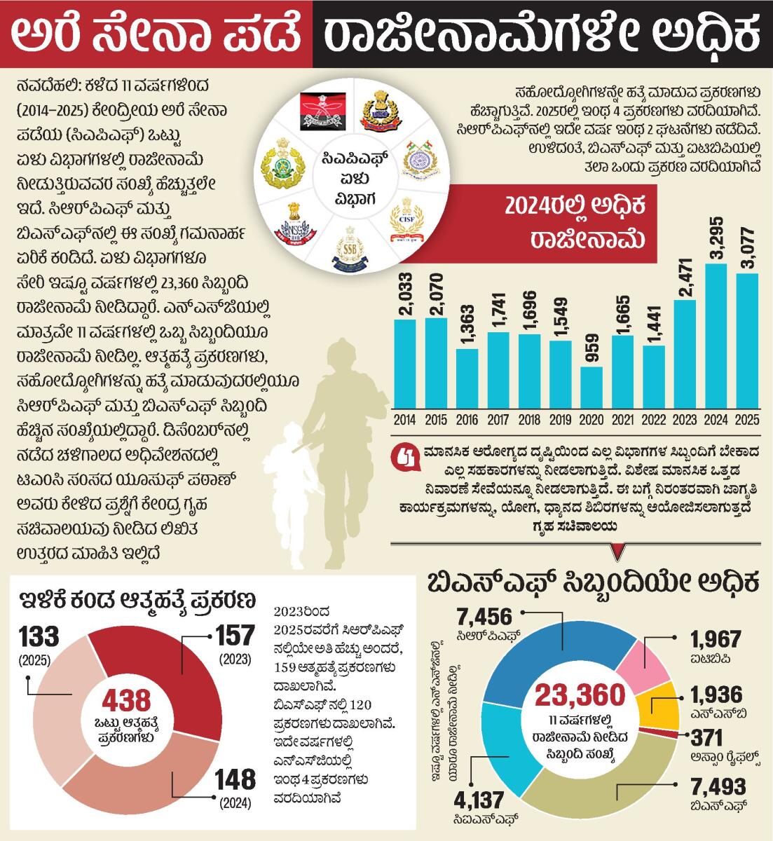 <p>ಪ್ರಜಾವಾಣಿ ವಾರ್ತೆ</p>.<p>ನವದೆಹಲಿ: ಕಳೆದ 11 ವರ್ಷಗಳಿಂದ (2014–2025) ಕೇಂದ್ರೀಯ ಅರೆ ಸೇನಾ ಪಡೆಯ (ಸಿಎಪಿಎಫ್) ಒಟ್ಟು ಏಳು ವಿಭಾಗಗಳಲ್ಲಿ ರಾಜೀನಾಮೆ ನೀಡುತ್ತಿರುವವರ ಸಂಖ್ಯೆ ಹೆಚ್ಚುತ್ತಲೇ ಇದೆ. ಸಿಆರ್ಪಿಎಫ್ ಮತ್ತು ಬಿಎಸ್ಎಫ್ನಲ್ಲಿ ಈ ಸಂಖ್ಯೆ ಗಮನಾರ್ಹ ಏರಿಕೆ ಕಂಡಿದೆ. ಏಳು ವಿಭಾಗಗಳೂ ಸೇರಿ ಇಷ್ಟೂ ವರ್ಷಗಳಲ್ಲಿ 23,360 ಸಿಬ್ಬಂದಿ ರಾಜೀನಾಮೆ ನೀಡಿದ್ದಾರೆ. ಎನ್ಎಸ್ಜಿಯಲ್ಲಿ ಮಾತ್ರವೇ 11 ವರ್ಷಗಳಲ್ಲಿ ಒಬ್ಬ ಸಿಬ್ಬಂದಿಯೂ ರಾಜೀನಾಮೆ ನೀಡಿಲ್ಲ. ಆತ್ಮಹತ್ಯೆ ಪ್ರಕರಣಗಳಲ್ಲಿ, ಸಹೋದ್ಯೋಗಿಗಳನ್ನೇ ಹತ್ಯೆ ಮಾಡುವುದರಲ್ಲಿಯೂ ಸಿಆರ್ಪಿಎಫ್ ಮತ್ತು ಬಿಎಸ್ಎಫ್ ಸಿಬ್ಬಂದಿ ಹೆಚ್ಚಿನ ಸಂಖ್ಯೆಯಲ್ಲಿದ್ದಾರೆ. ಡಿಸೆಂಬರ್ನಲ್ಲಿ ನಡೆದ ಚಳಿಗಾಲದ ಅಧಿವೇಶನಲ್ಲಿ ಟಿಎಂಸಿ ಸಂಸದ ಯೂಸುಫ್ ಪಠಾಣ್ ಅವರು ಕೇಳಿದ ಪ್ರಶ್ನೆಗೆ ಕೇಂದ್ರ ಗೃಹ ಸಚಿವಾಲಯವು ಲಿಖಿತ ಉತ್ತರ ನೀಡಿದೆ. ಉತ್ತರದ ಮಾಹಿತಿ ಇಲ್ಲಿದೆ</p>.<div><p><strong>ಪ್ರಜಾವಾಣಿ ಆ್ಯಪ್ ಇಲ್ಲಿದೆ: <a href="https://play.google.com/store/apps/details?id=com.tpml.pv">ಆಂಡ್ರಾಯ್ಡ್ </a>| <a href="https://apps.apple.com/in/app/prajavani-kannada-news-app/id1535764933">ಐಒಎಸ್</a> | <a href="https://whatsapp.com/channel/0029Va94OfB1dAw2Z4q5mK40">ವಾಟ್ಸ್ಆ್ಯಪ್</a>, <a href="https://www.twitter.com/prajavani">ಎಕ್ಸ್</a>, <a href="https://www.fb.com/prajavani.net">ಫೇಸ್ಬುಕ್</a> ಮತ್ತು <a href="https://www.instagram.com/prajavani">ಇನ್ಸ್ಟಾಗ್ರಾಂ</a>ನಲ್ಲಿ ಪ್ರಜಾವಾಣಿ ಫಾಲೋ ಮಾಡಿ.</strong></p></div>