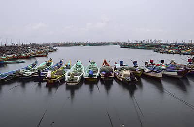 ಸಾಲುಗಟ್ಟಿ ನಿಂತಿರುವ ಮೀನುಗಾರಿಕಾ ಬೋಟ್ಗಳು.