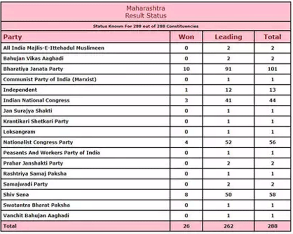 ಮಹಾರಾಷ್ಟ್ರದ ಫಲಿತಾಂಶದ ಟ್ರೆಂಡ್ ಗಮನಿಸಿದರೆ, ಯಾವುದೇ ಪಕ್ಷಕ್ಕೂ ಸಂಪೂರ್ಣ ಬಹುಮತ ದೊರೆಯುವುದಿಲ್ಲ. ಪಕ್ಷಗಳ ಗೆಲುವು ಹಾಗೂ ಮುನ್ನಡೆ ಗಮನಿಸಿದಾಗ ಸರ್ಕಾರ ರಚನೆಯ ಮೂರು ಸಾಧ್ಯತೆಗಳನ್ನು ಊಹಿಸಬಹುದು #Maharastrapoll https://t.co/gANOW1I6Q3