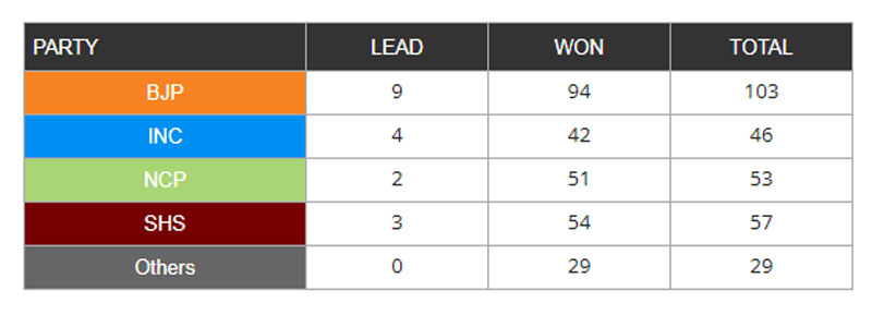 #UPDATE Election Commission official trends for #MaharashtraAssemblyElections: BJP leading in 99 constituencies, Shiv Sena leading in 60 constituencies, NCP leading in 48 constituencies & Indian National Congress in 40. pic.twitter.com/0Y5AO4B2HU